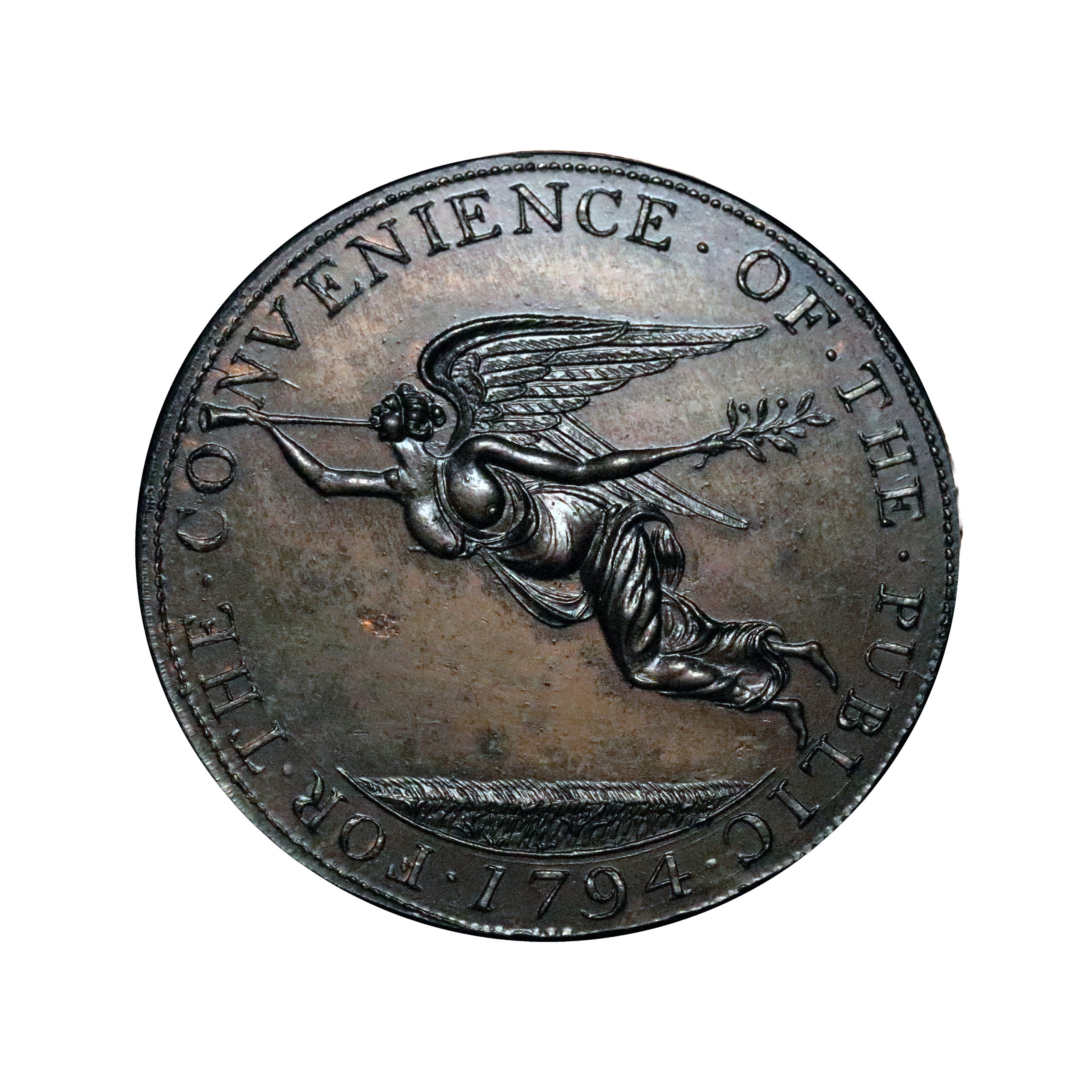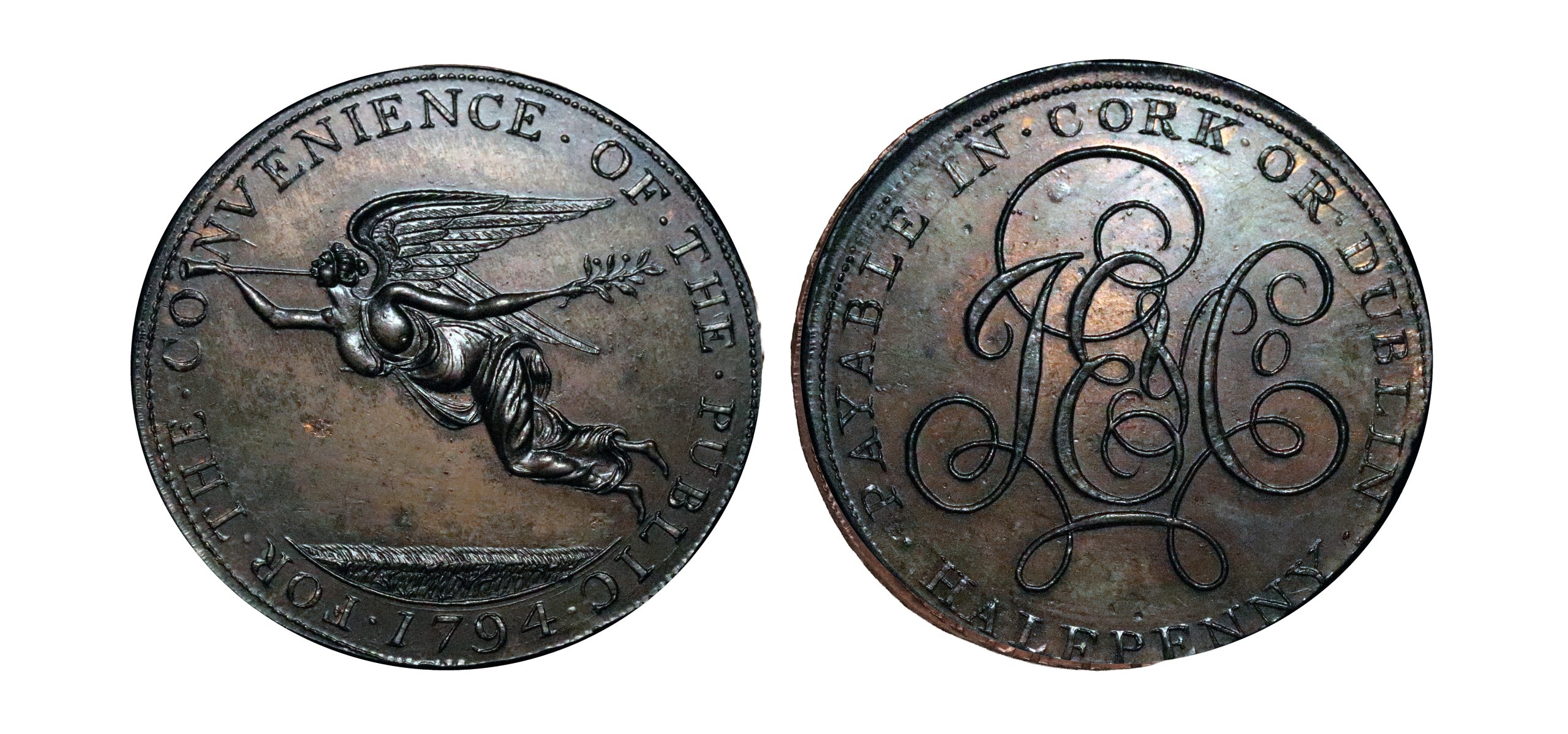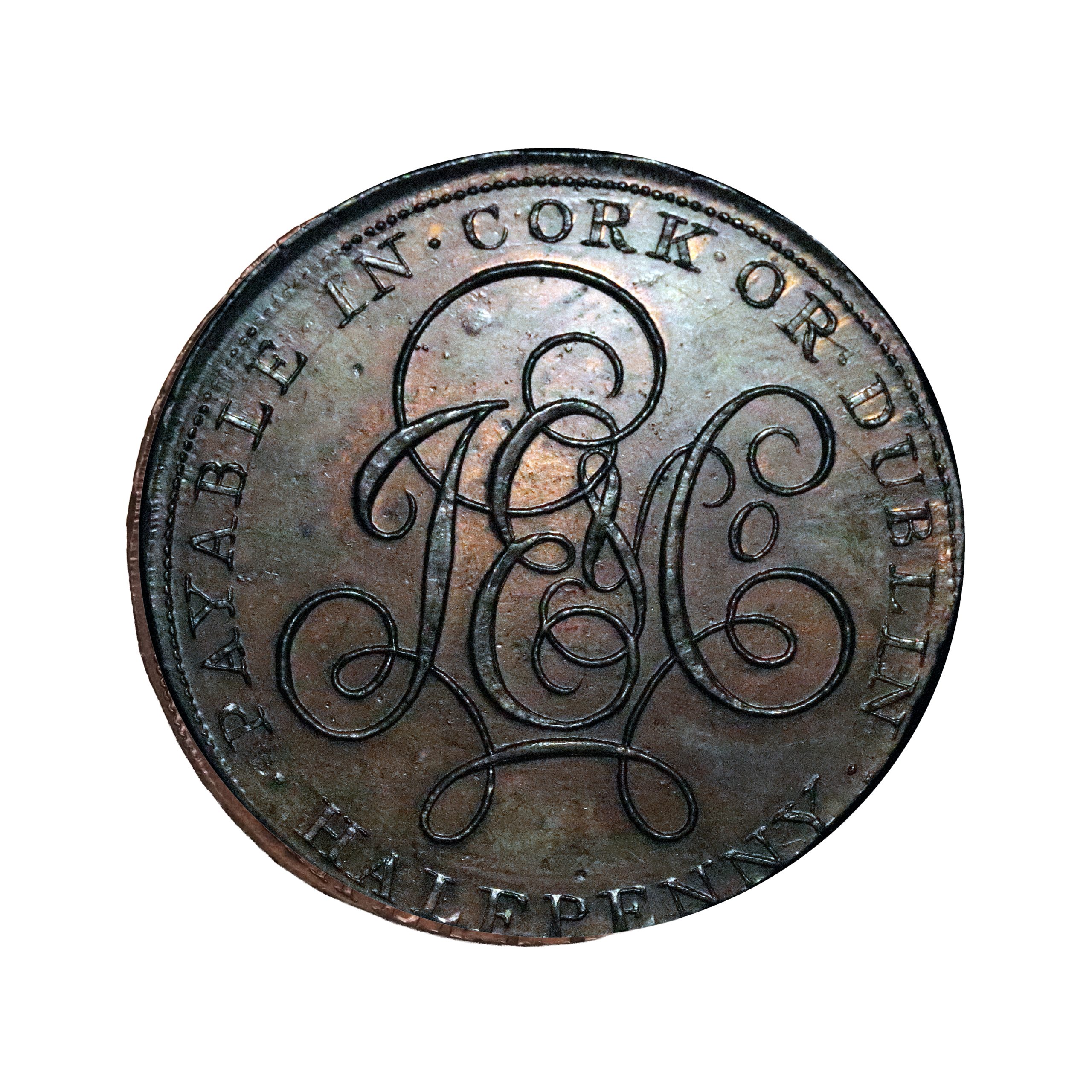 County Cork, Cork, Thomas Prattent; D&H 1, halfpenny struck in copper. An introduction to an obverse & reverse that is heavily featured in this sale. Struck on a thick planchet, out of collar. Very crisp example with deeply bronzed surfaces. Virtually as struck (Gem).