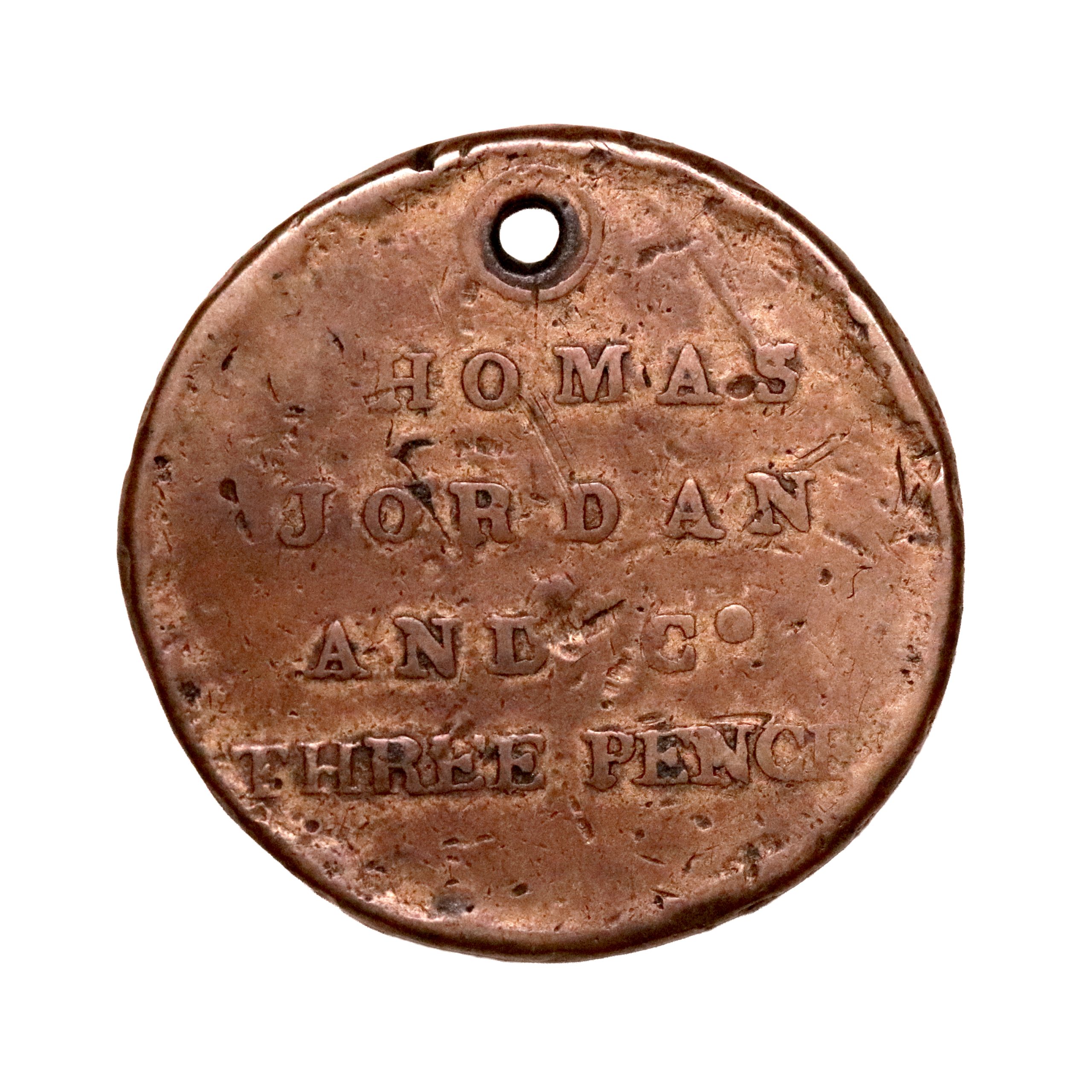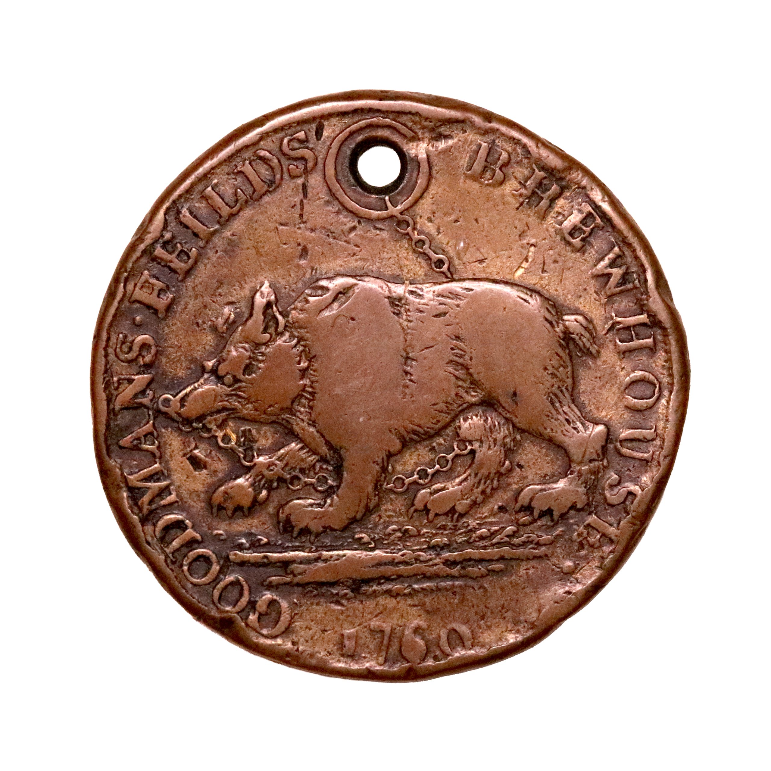 Middlesex, Goodmans Fields, Thomas Jordan; D&H 3, threepence struck in brass. Chained bear leading to a pierced hole, intentional and an integrated part of the design. This, the Noble specimen, about fine for issue with very few specimens known. Extremely rare.