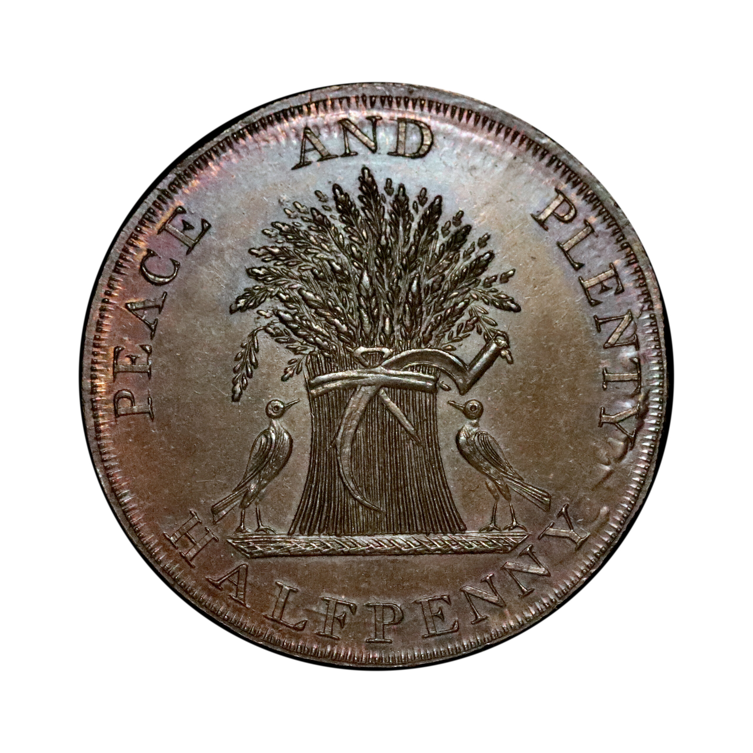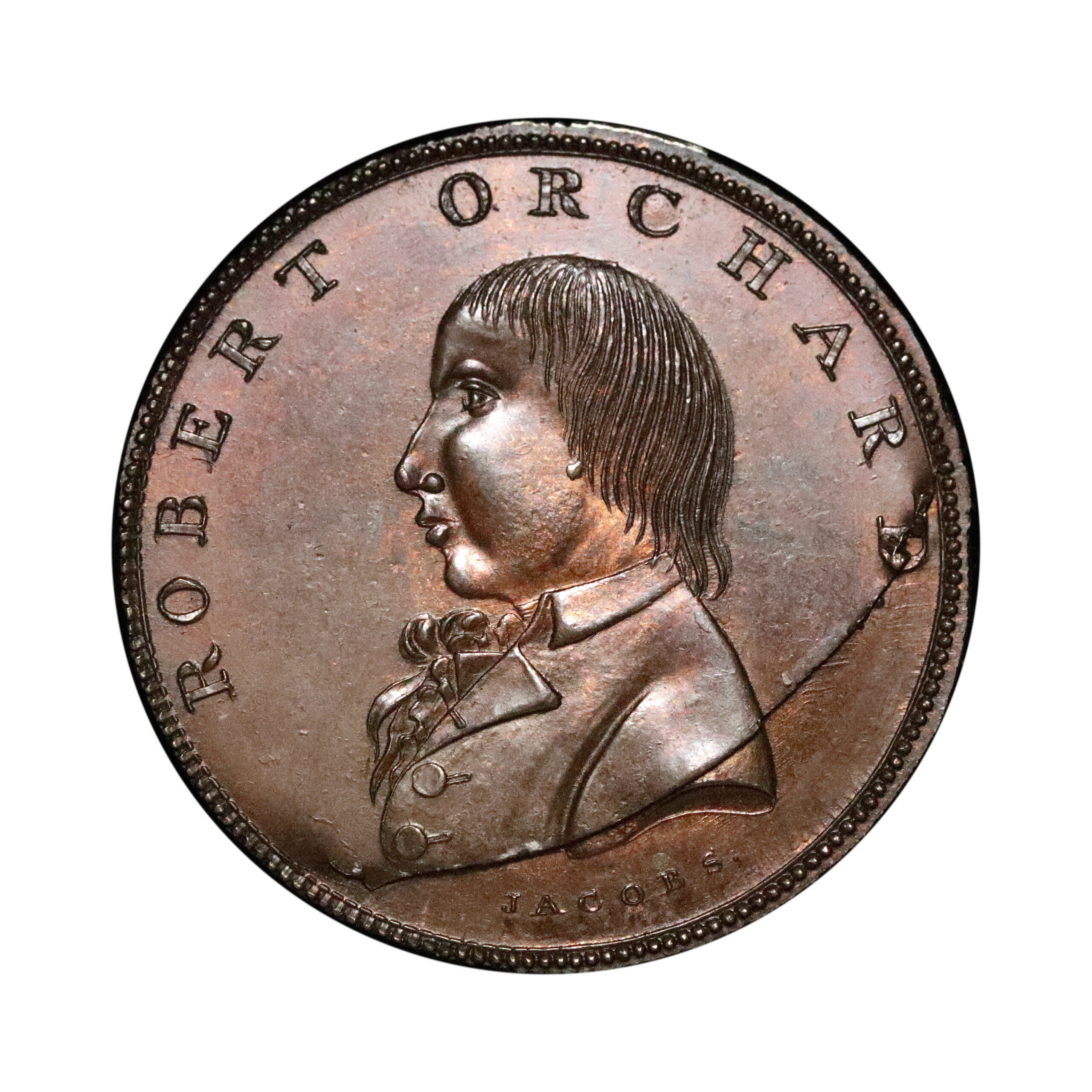 London, Soho, Robert Orchard; D&H 408, halfpenny mule struck in copper, 8.94g. Reverse with typical die flaws around the peripherals, with some parts showing die clash imprints underneath the legend. Obverse with attractive chestnut brown colour, hints of red in the devices, scarce. Extremely fine..