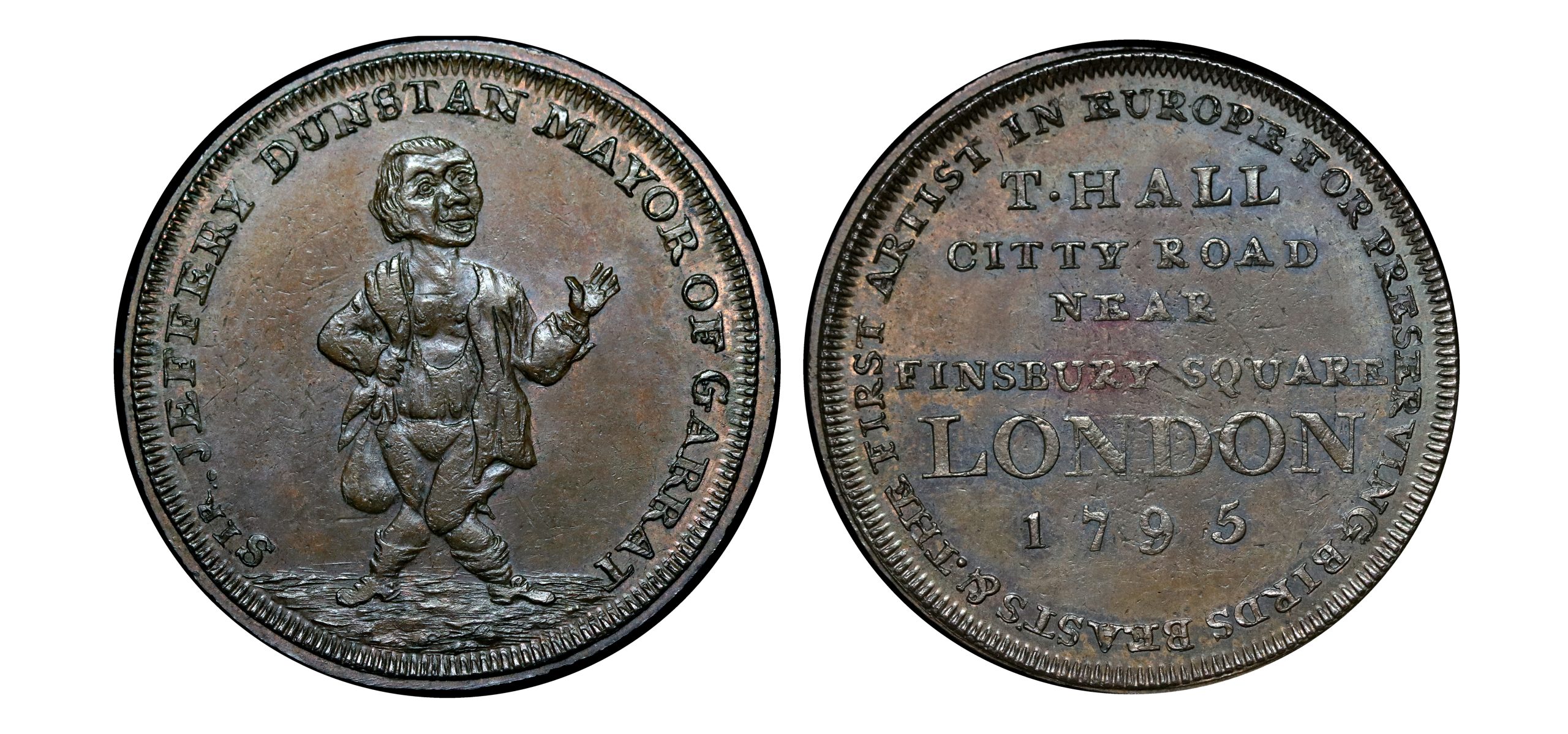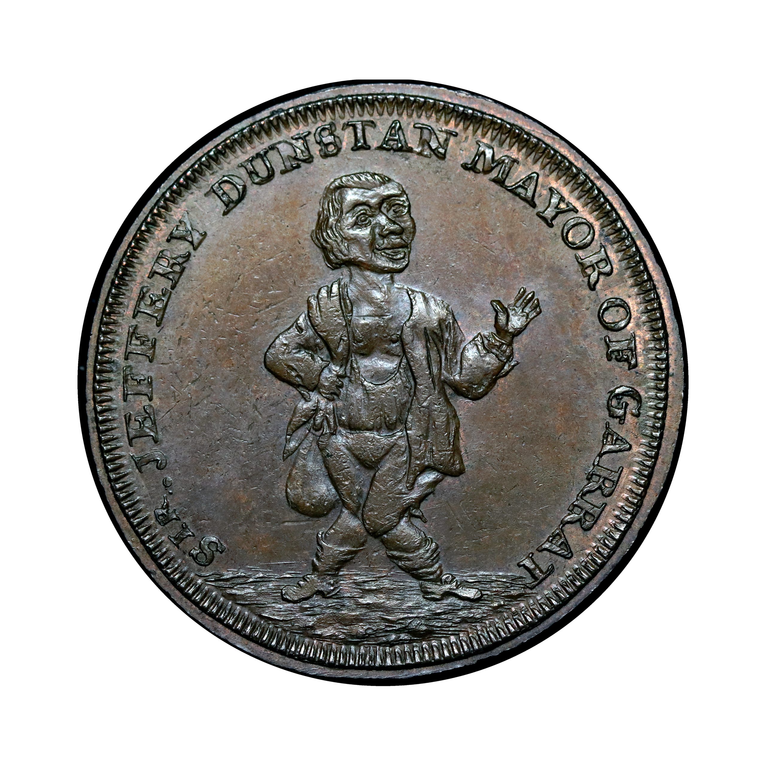 Lot 106 – Lutwyche’s Middlesex Sir Jeffery Dunstan penny D&H 26a, overstruck ASYLUM edge