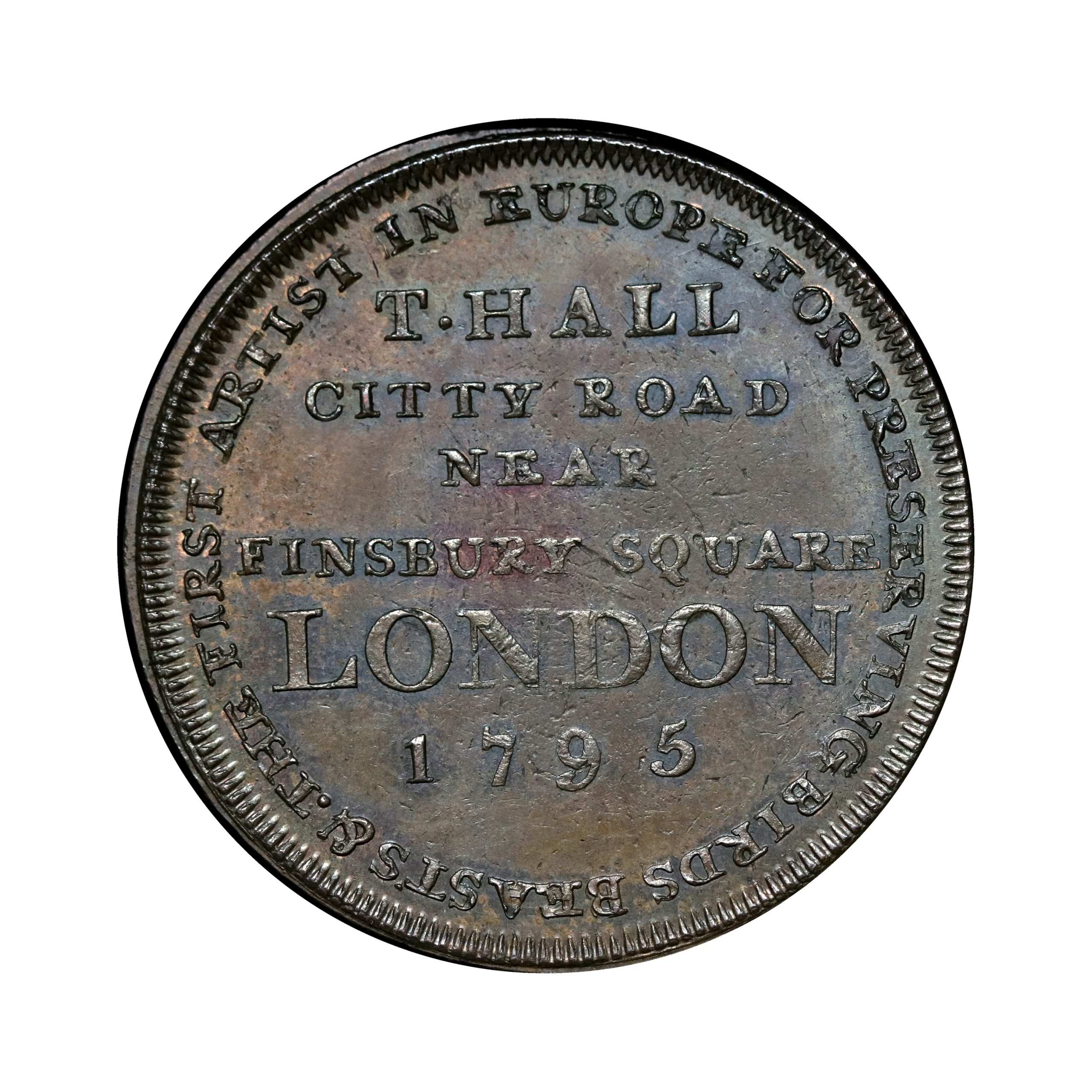 Middlesex, City Road, Thomas Hall; D&H 26a – Var, penny struck in copper. This variety, struck on a broader planchet with edge ON DEMAND WE PROMISE TO PAY ONE PENNY. Underneath this edge, quite clearly in parts, is the edge AN ASYLUM FOR THR OPPRESS’D OF ALL NATIONS and, as such, unpublished. Tiny marks in the fields would suggest wear but close inspection shows this to be likely a very slight double-strike, both sides. See obverse T of T HALL appearing on an angle above the A of HALL. Fascinating example overall and presumably quite rare. About extremely fine. Unpublished, extremely rare thus.
