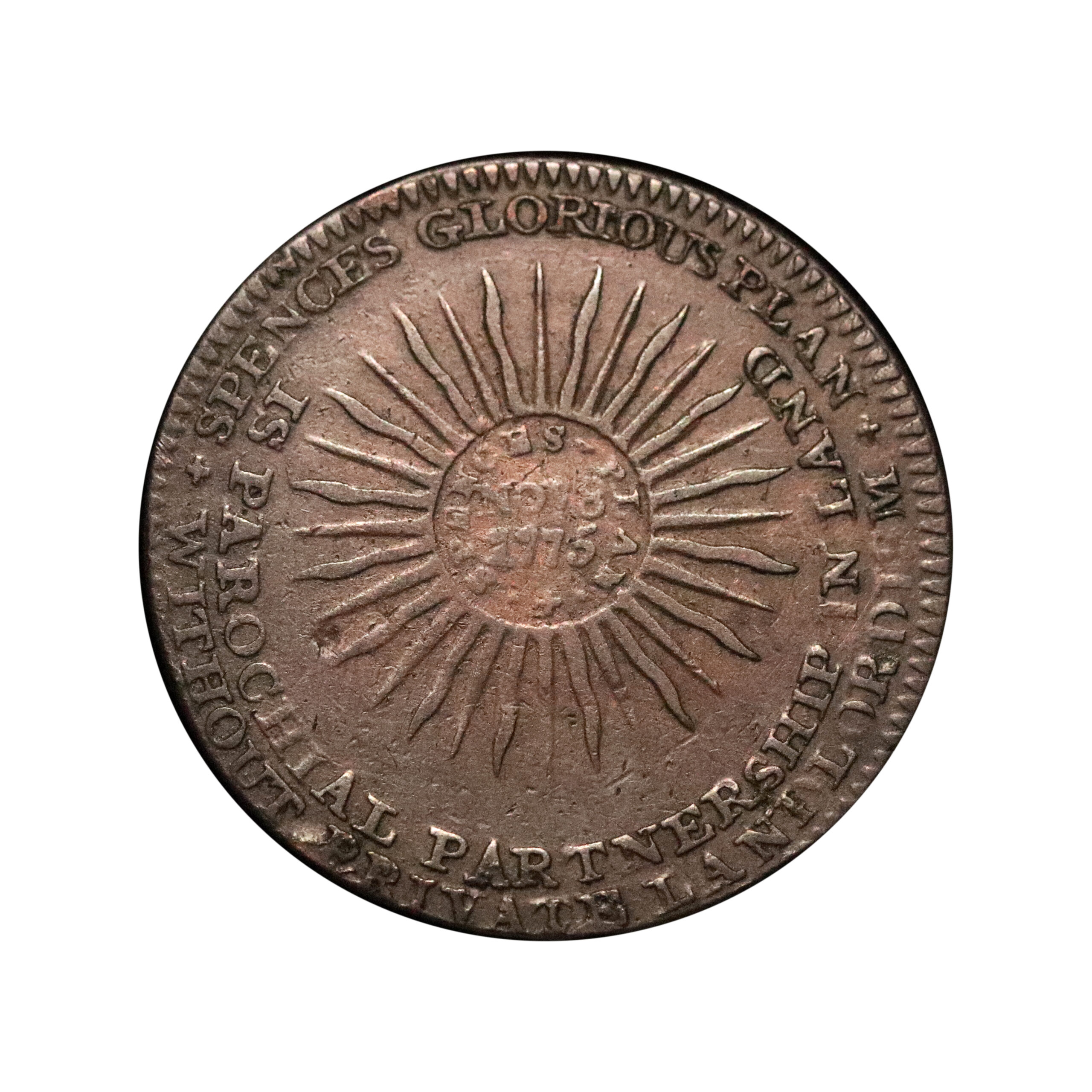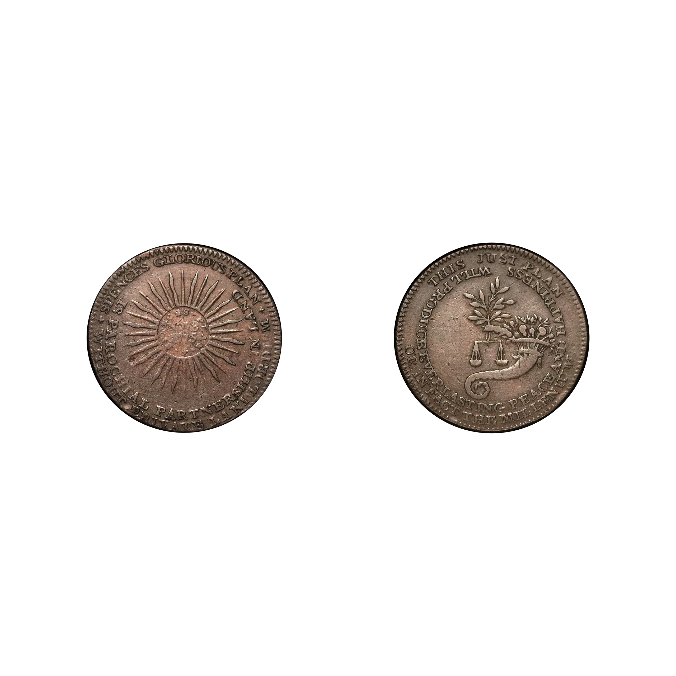 London, Little Turnstile, Thomas Spence; D&H 676, Spence’s Plan, his first issue, halfpenny struck in copper, 7.38g, 28mm. Struck on a somewhat flawed planchet otherwise bold details, an attractive overall example, very fine.