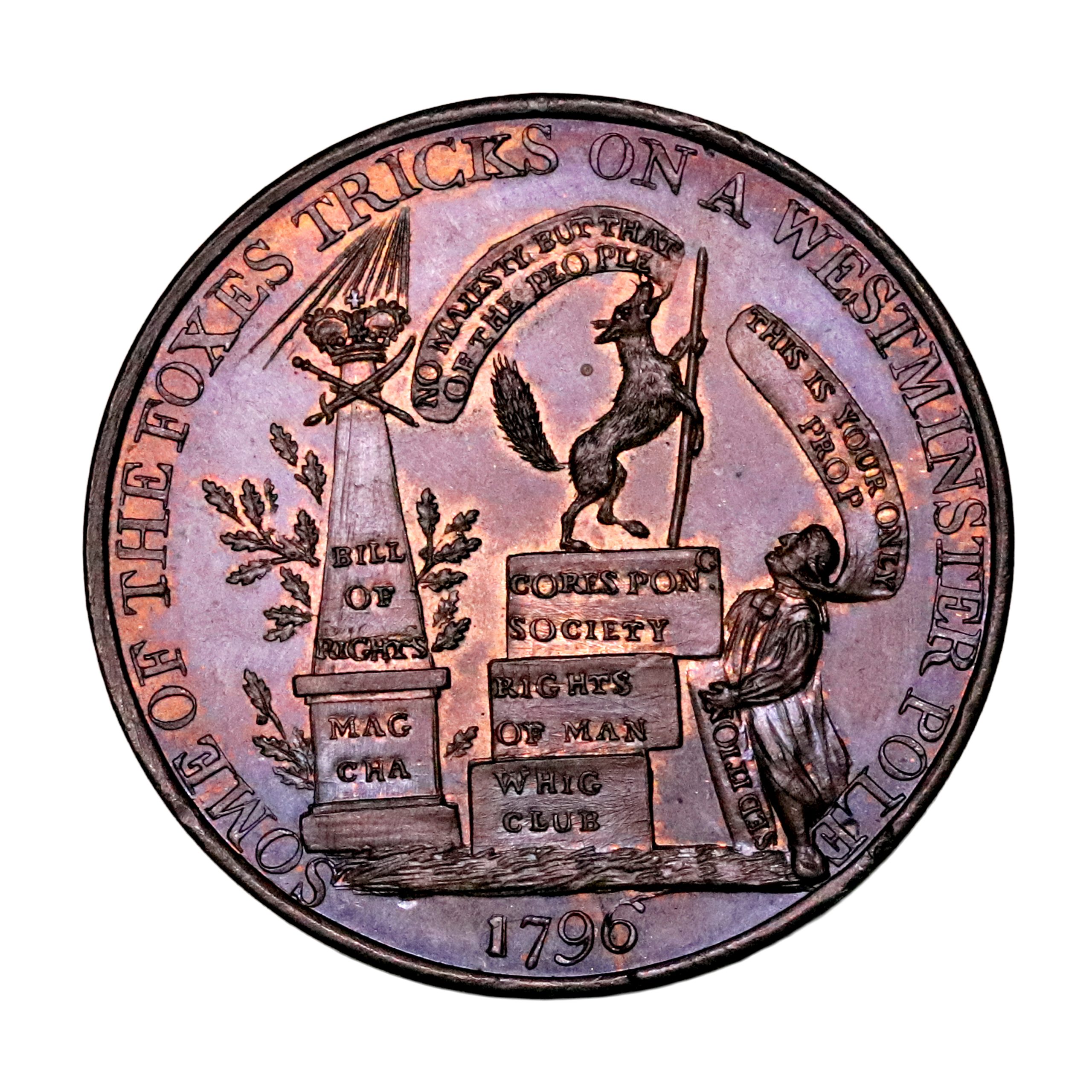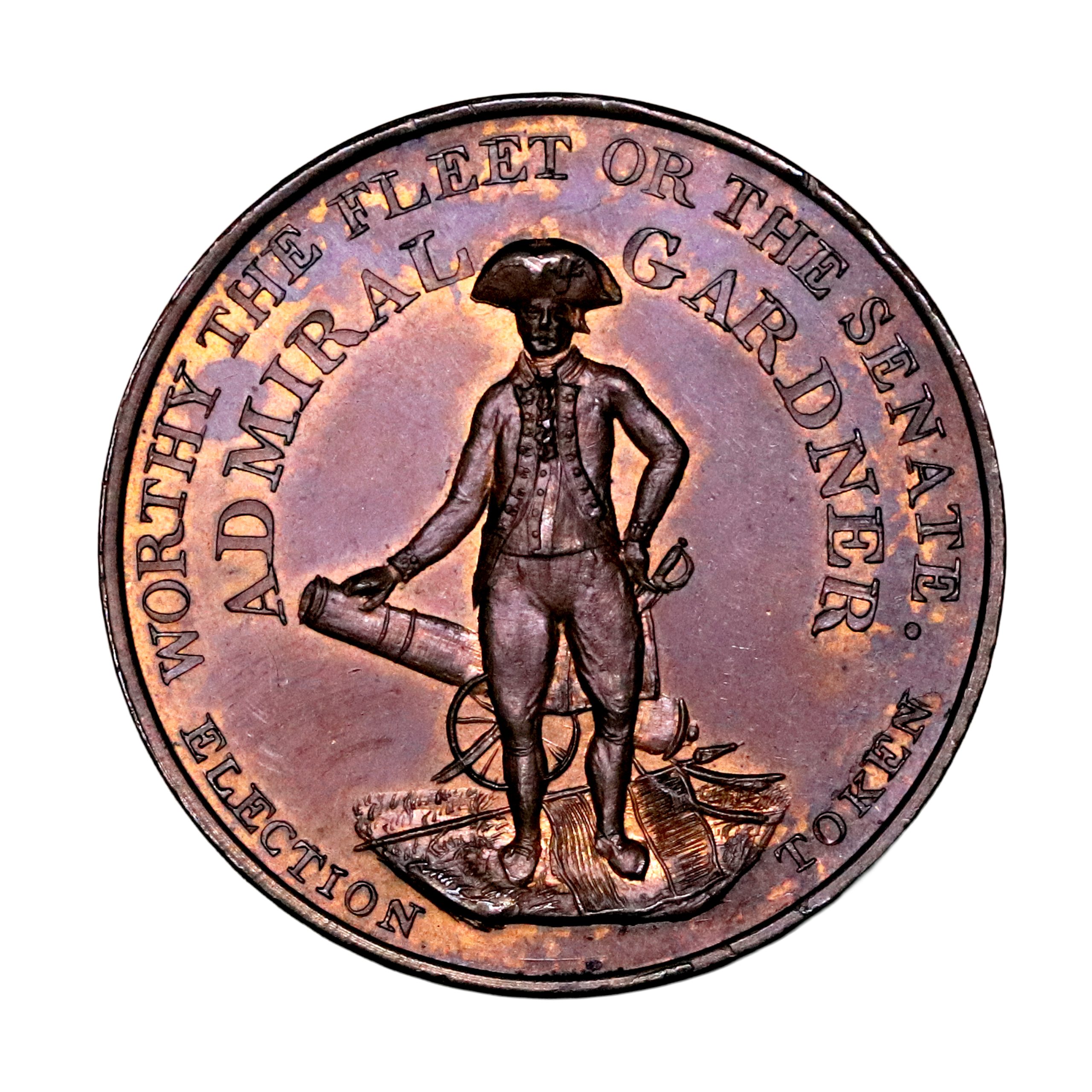 Middlesex, Political & Social Series, Admiral Gardner; D&H 226, penny struck in copper. Satirical issue, wonderfully engraved. Very minor rim nicks otherwise, sharp with mostly brilliant iridescent fields with faded red, good extremely fine . Scarce.