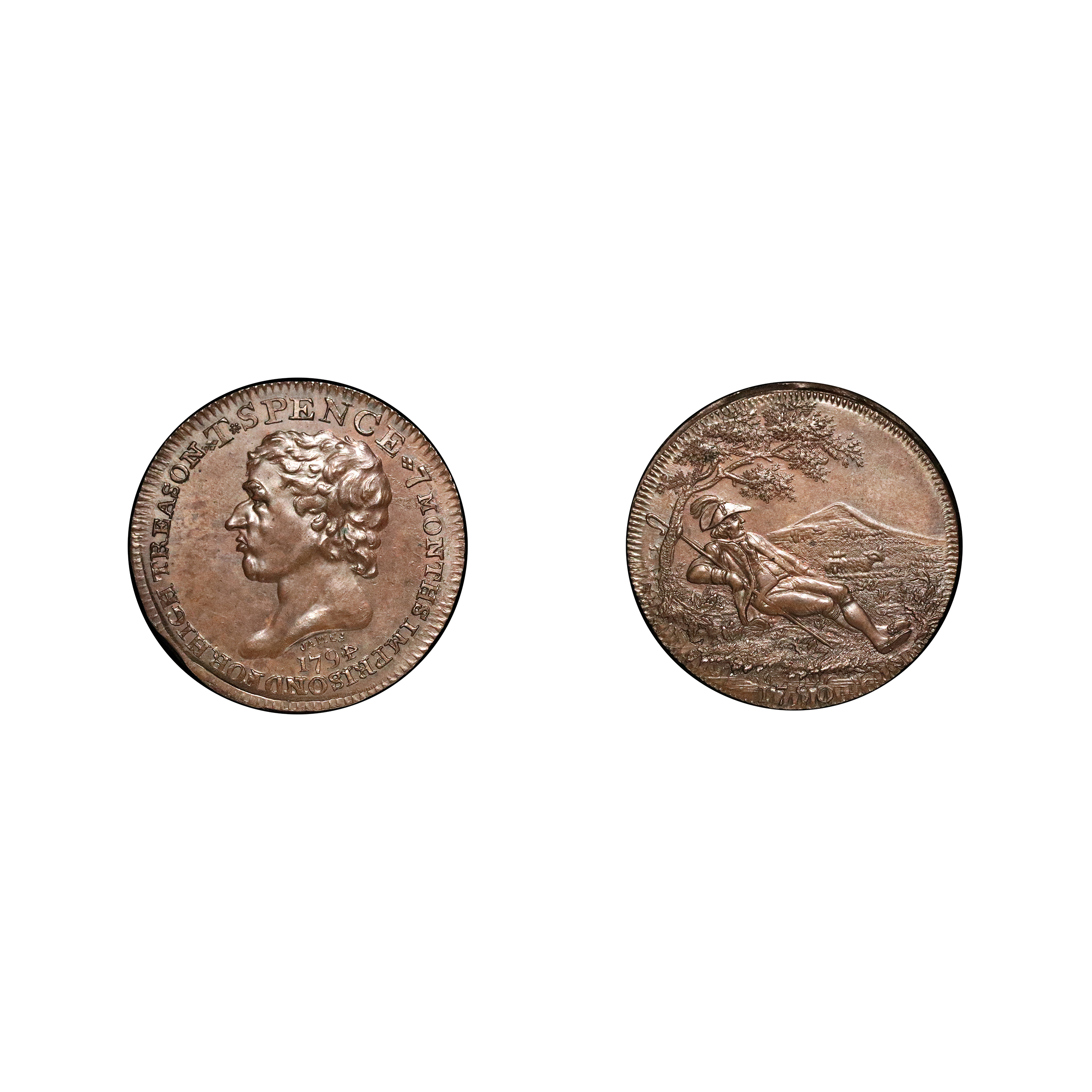 London, Little Turnstile, Thomas Spence; D&H 690b, halfpenny struck in copper, 10.30g. Struck on a flawed planchet otherwise attractive light brown fields, very bold strike for type as often found very flat. About extremely fine.