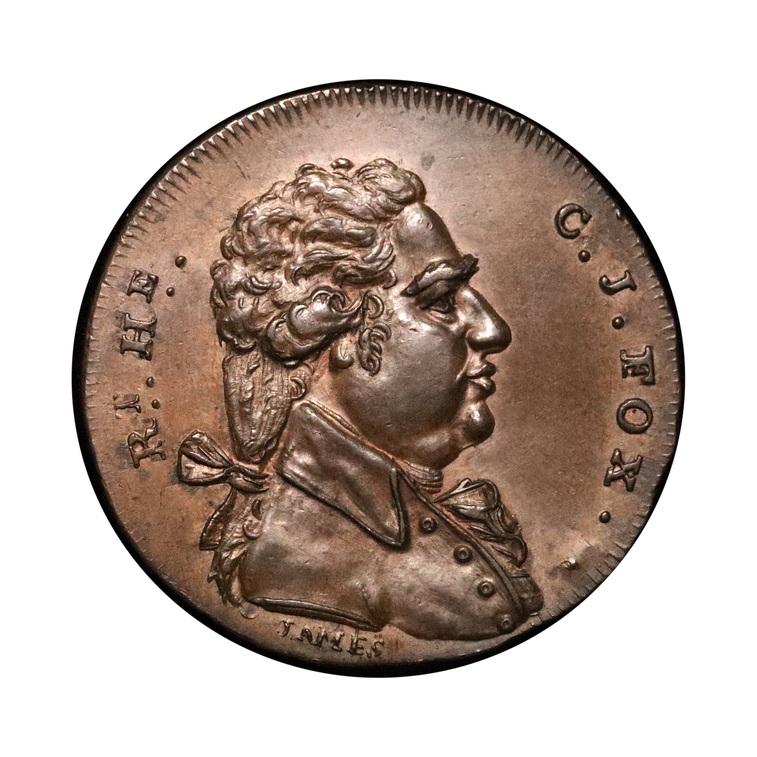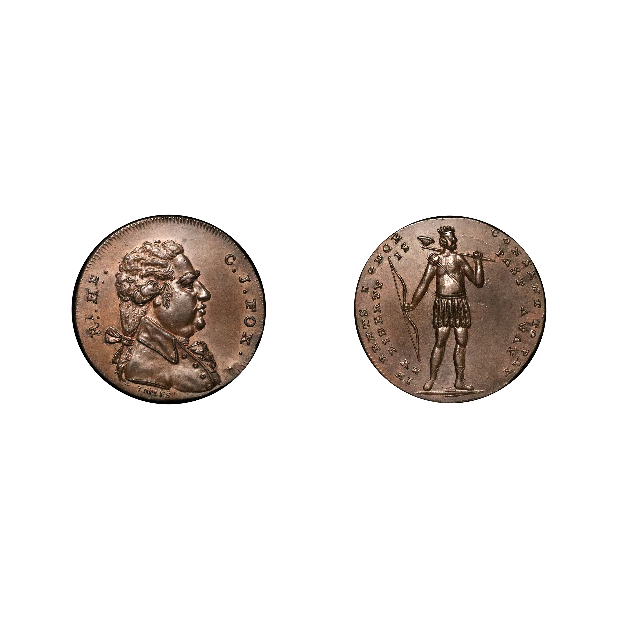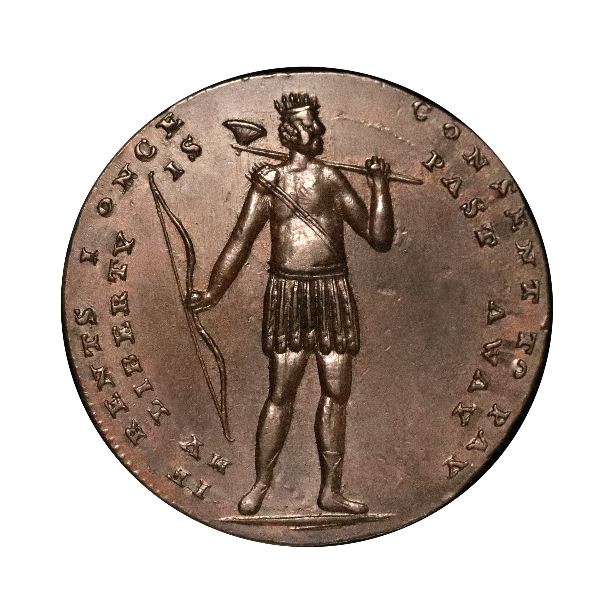 London, Little Turnstile, Thomas Spence; D&H 765, halfpenny struck in copper, 12.69g. Popular Native American reverse. Very bold both sides with reverse struck from a relatively early strike since with later issues showing heavily reworked fields. We’ve often seen the grading companies mistakenly “body-bag” those examples as damaged – they are not. However, this piece, very attractive with hints of original colour, scarce. Extremely fine.