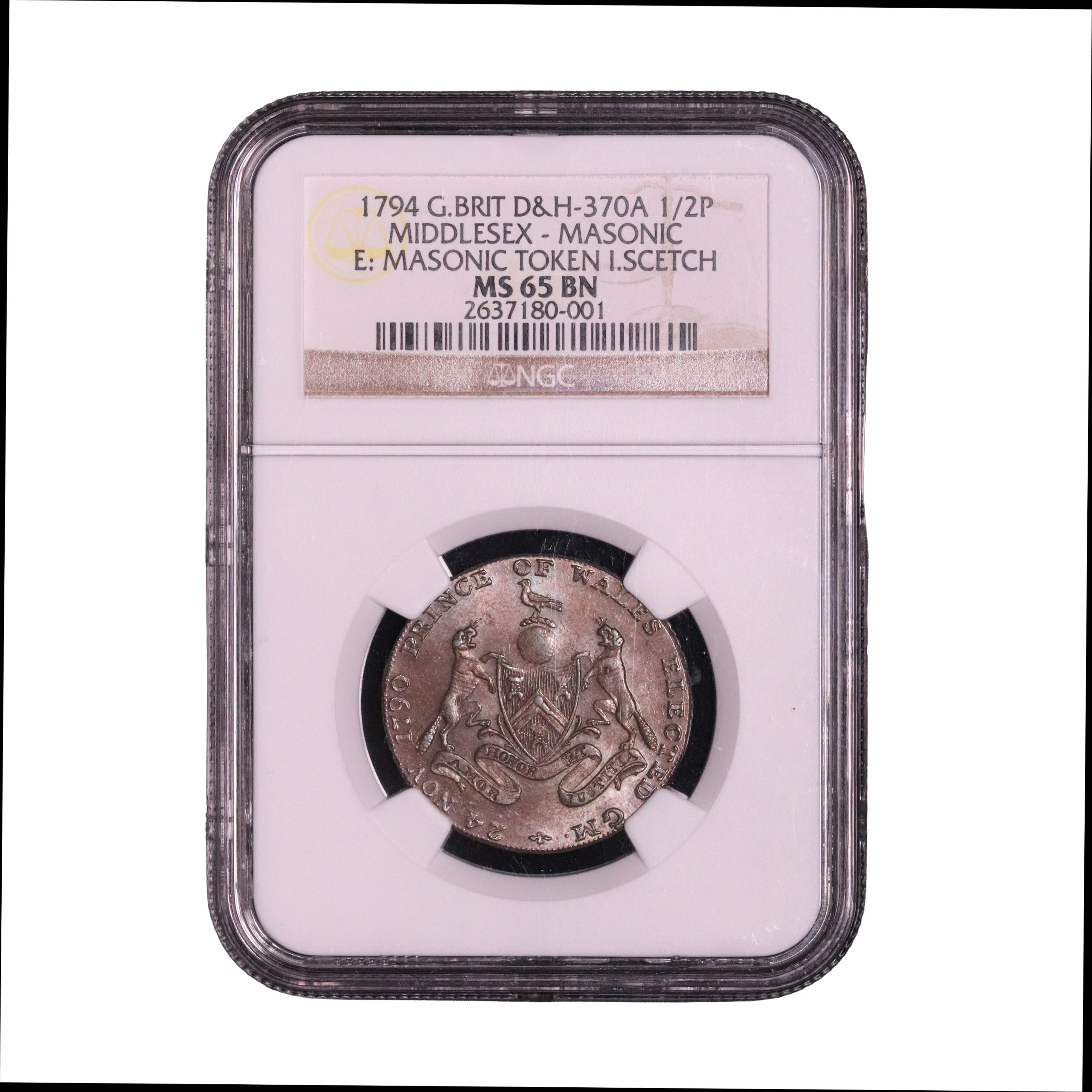 Lot 128 – Middlesex Masonic halfpenny D&H 370a, NGS 65