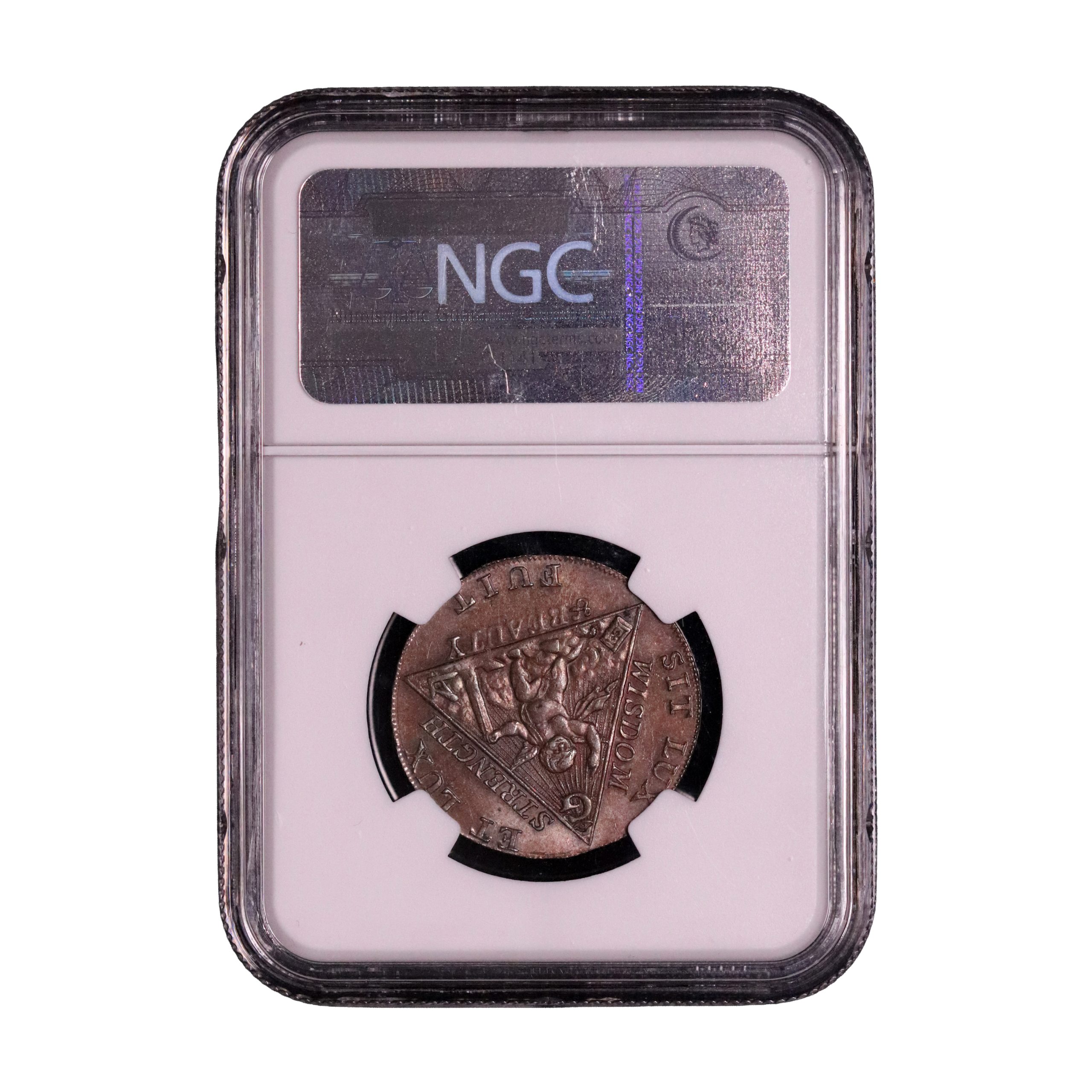 Middlesex, Masonic, James Sketchley; D&H 370a, halfpenny struck in copper. Sharp example with evenly toned reflective fields. Extremely fine and currently housed in an NGC 65BN holder.