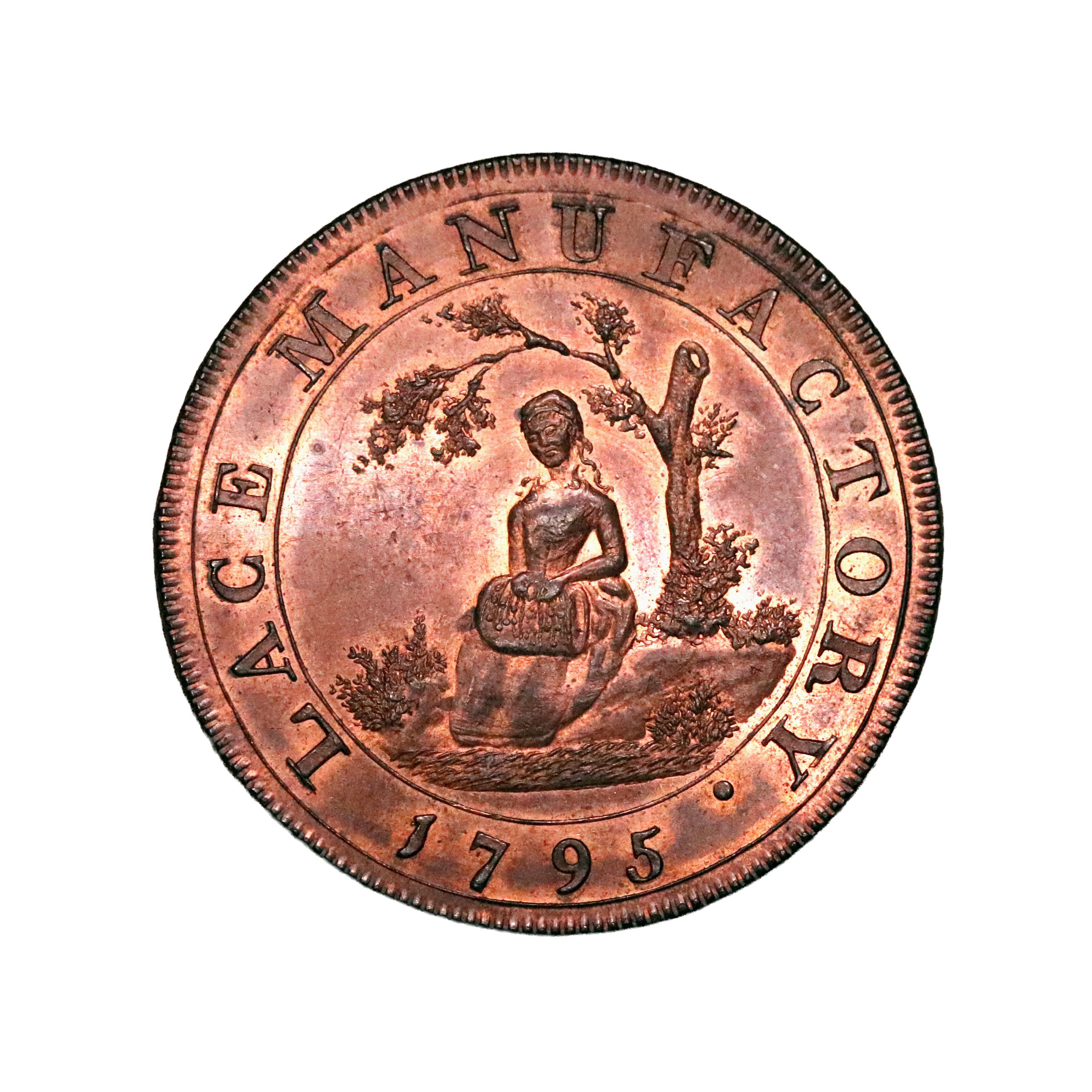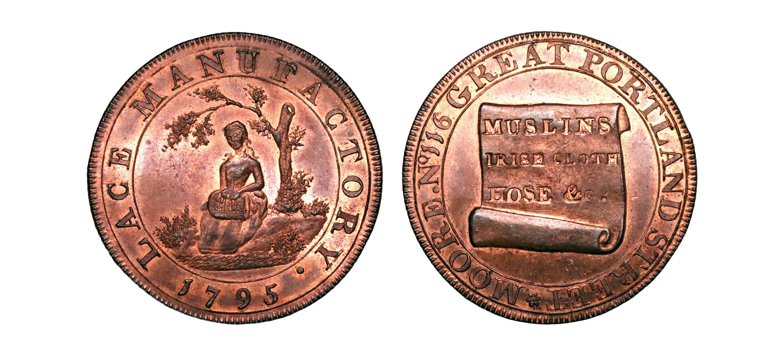 Middlesex, Portland Street, Joseph Moore; D&H 389?, halfpenny struck in copper. Sharp with substantial original colour and flash, mint state (Gem).