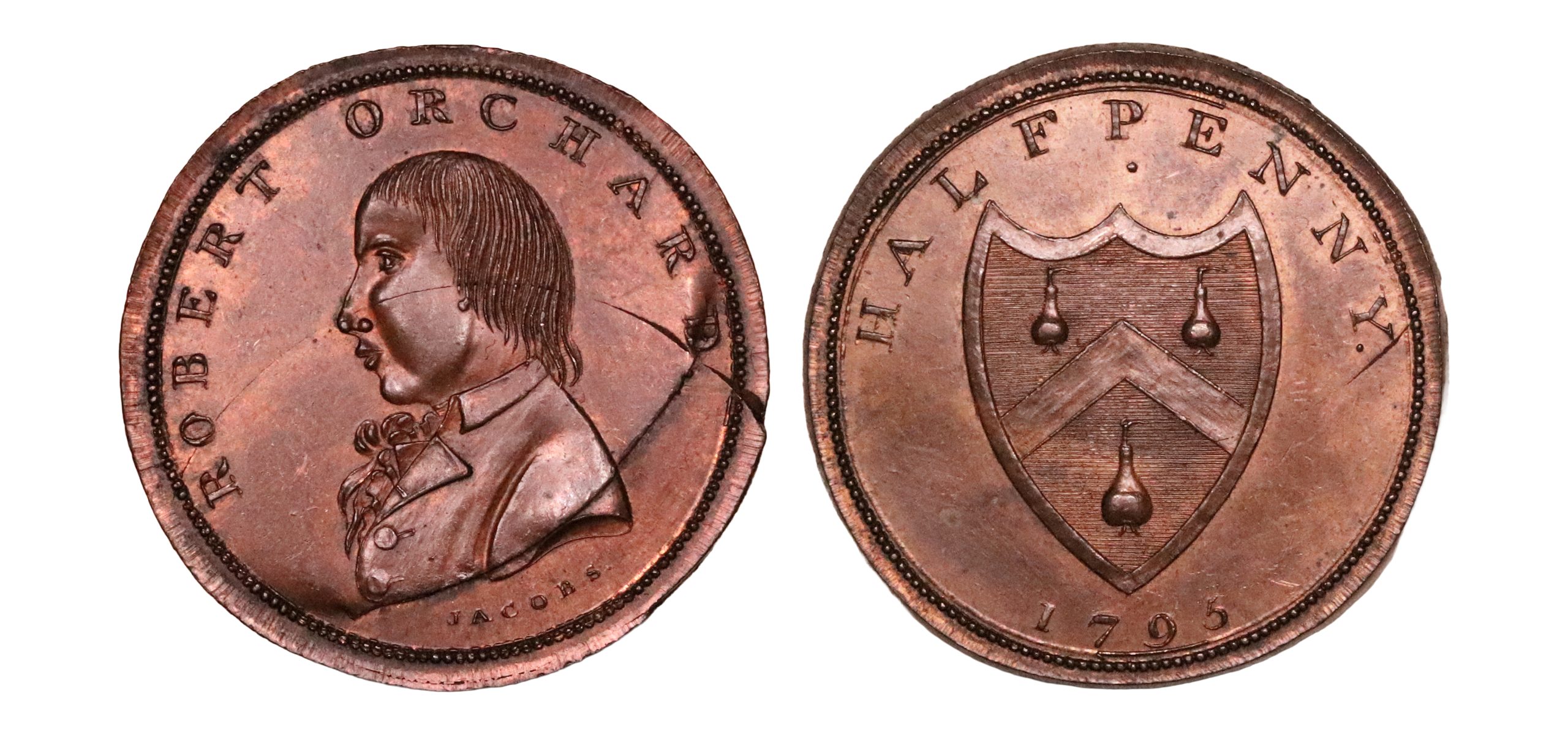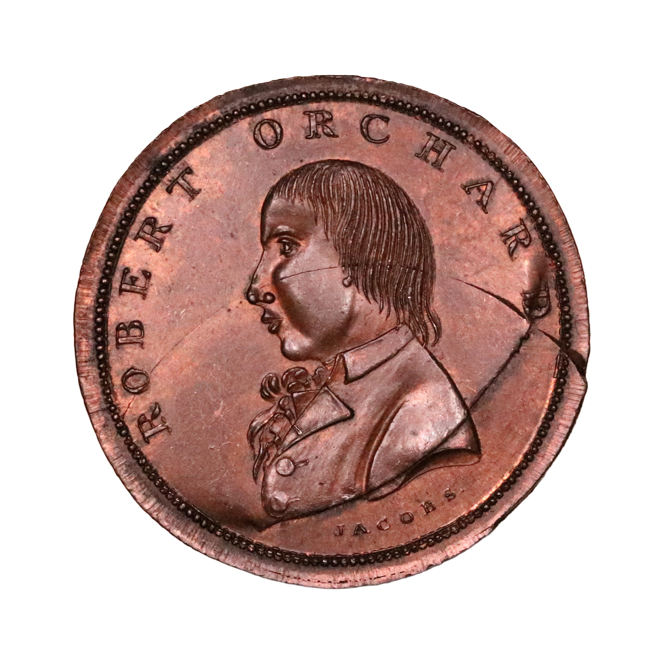 Middlesex, Soho, Robert Orchard; D&H 399, halfpenny struck in copper. Dies as previous, struck on a large and heavy planchet. Flaw across the obverse and parts of the reverse otherwise, sharp with golden-brown surfaces. Extremely fine or better. Rare.