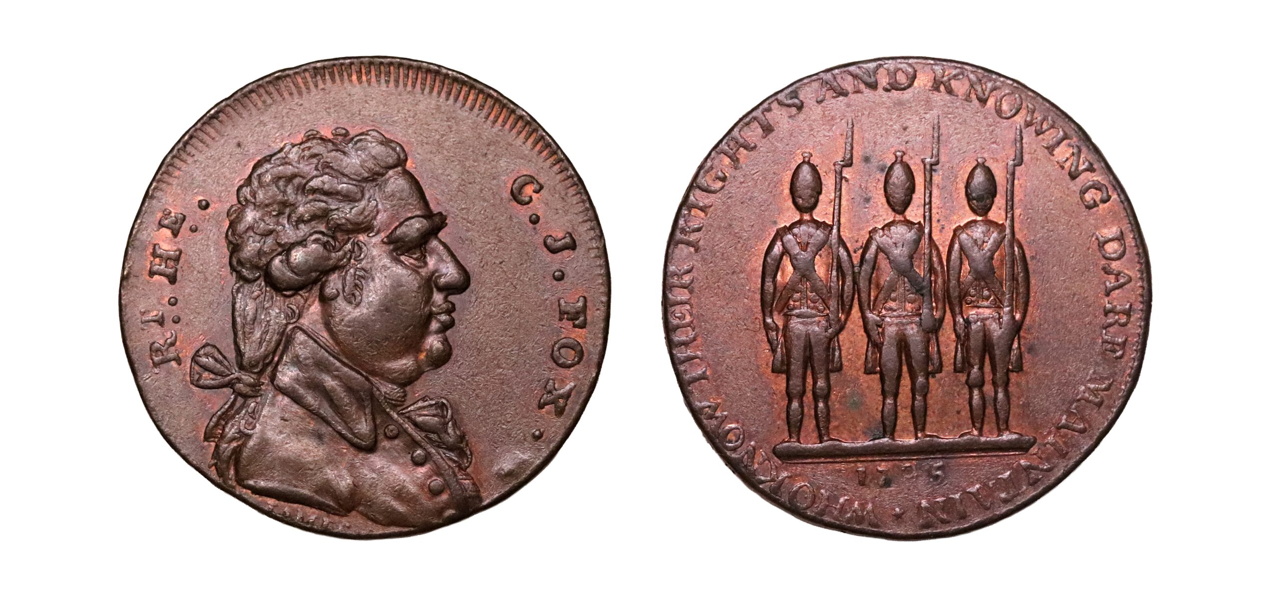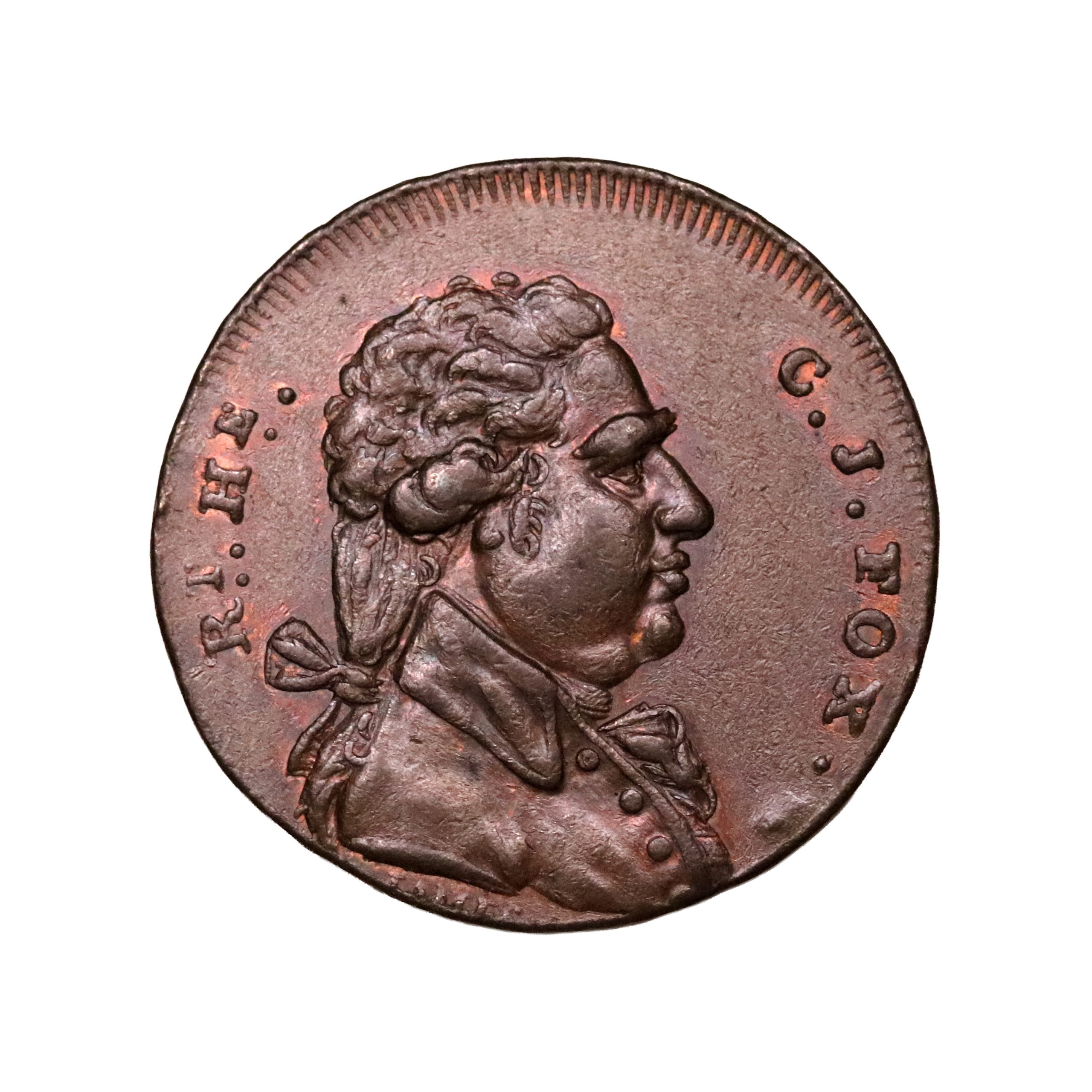 Middlesex, Little Turnstile, Thomas Spence; D&H 764, halfpenny struck in copper. Some softly struck areas, surface with some roughness (not through handling). Otherwise, even brown with red devices. Good very fine.