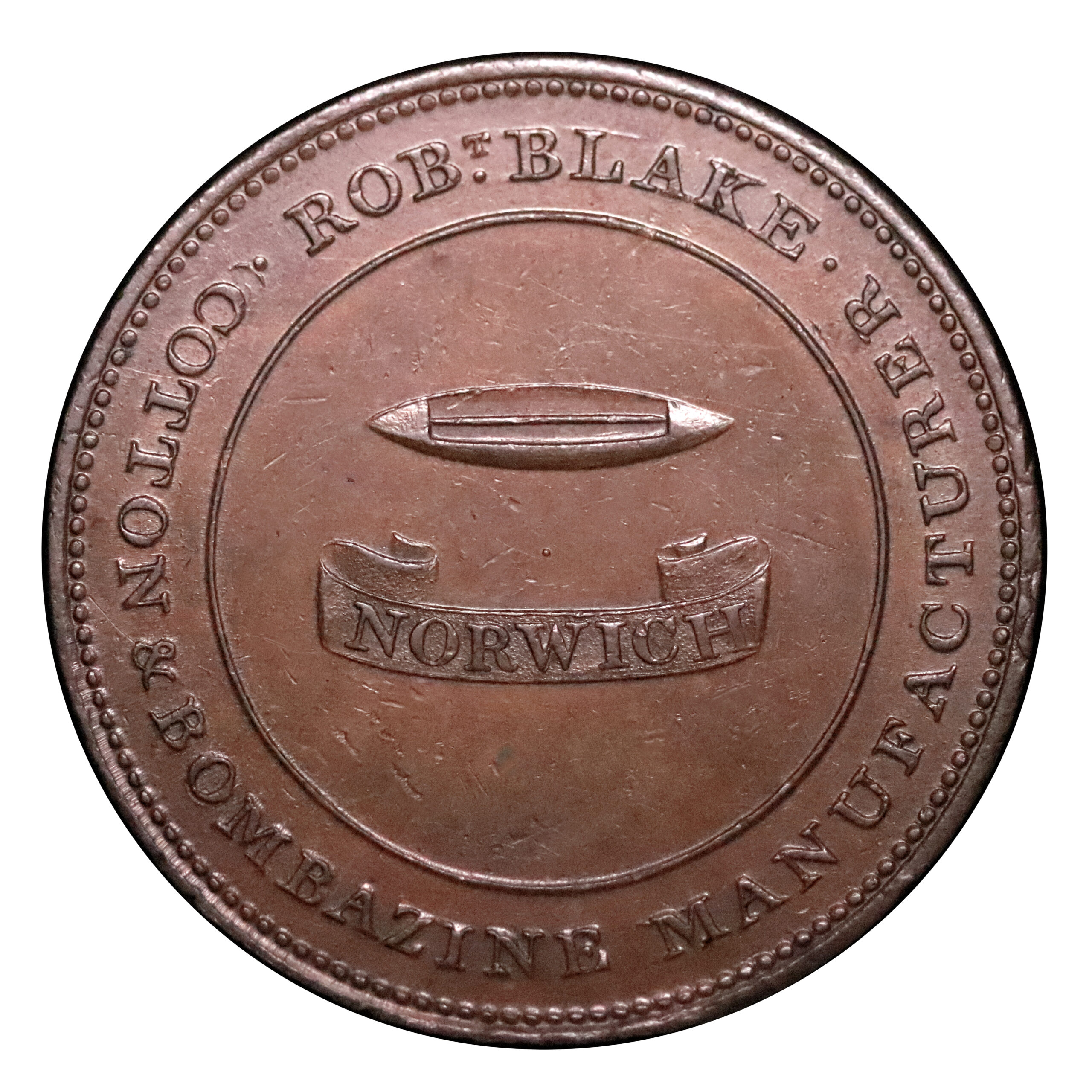 Norfolk, Norwich, Robert Blake; W910, copper twopence, 45.53g. Very sharp example for this type, very seldom seen in higher grades. Fascinating flaw to obverse rim as struck otherwise good very fine, perhaps better. Perhaps a high AU on the Sheldon grade, possibly squeeze into a low MS. Quite scarce as such.
