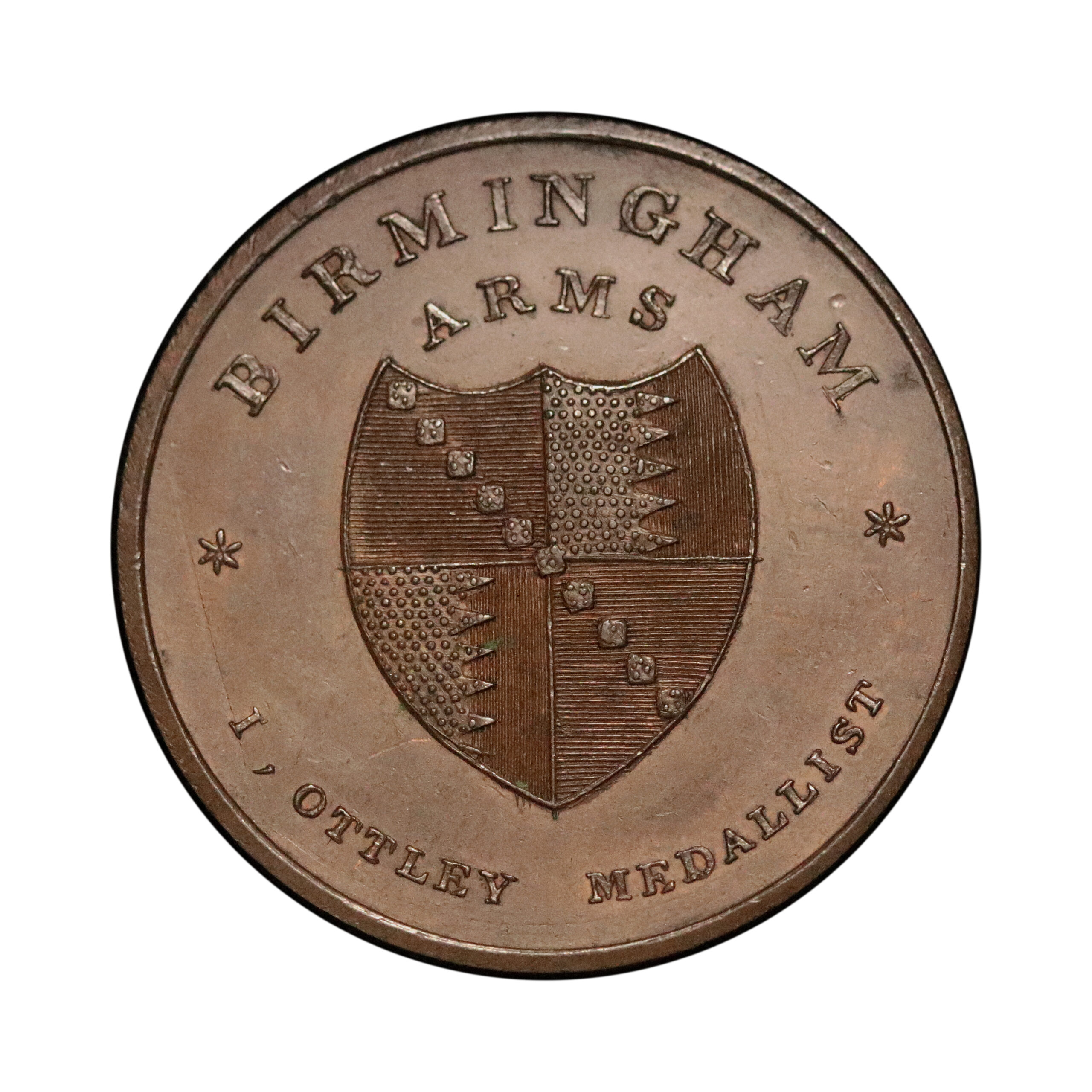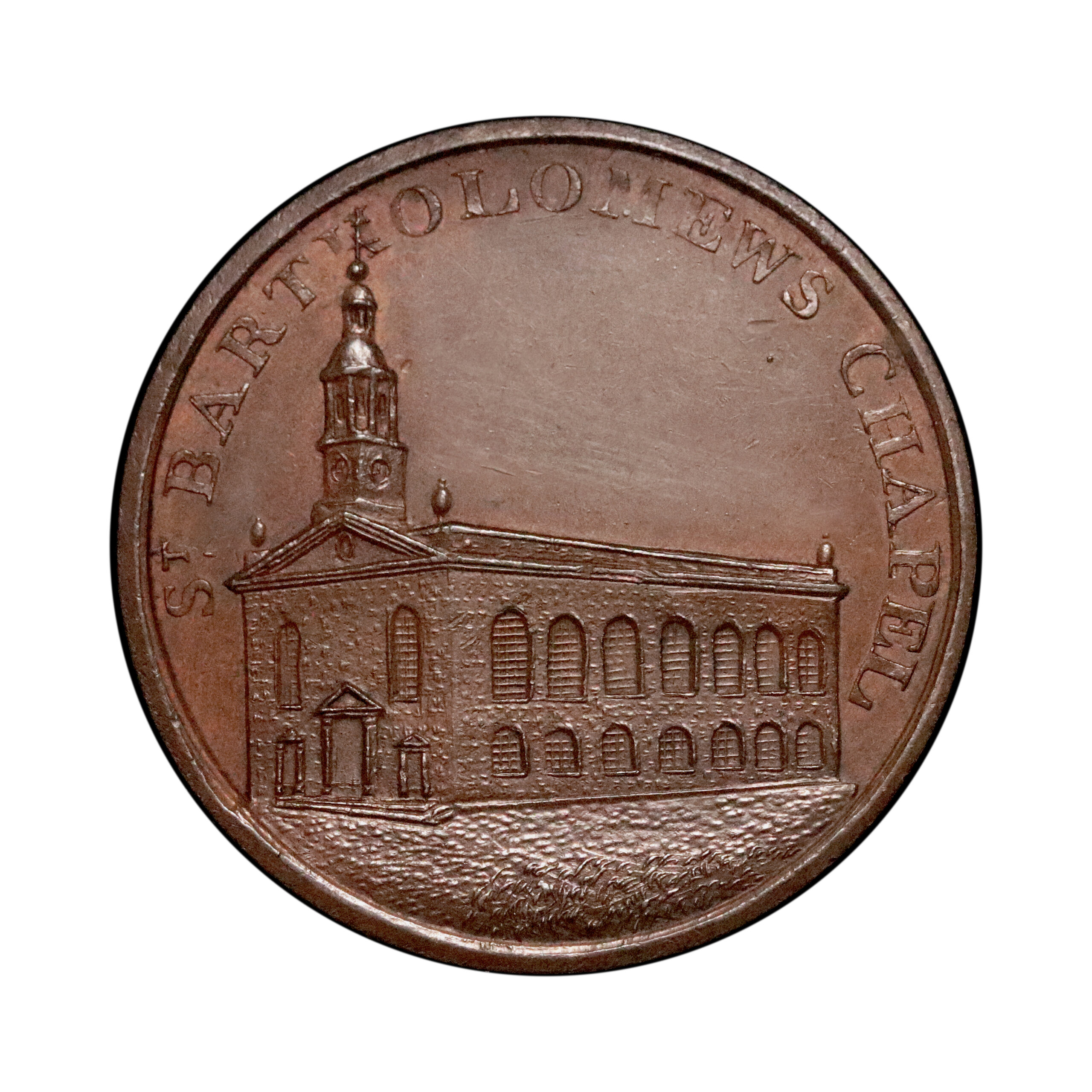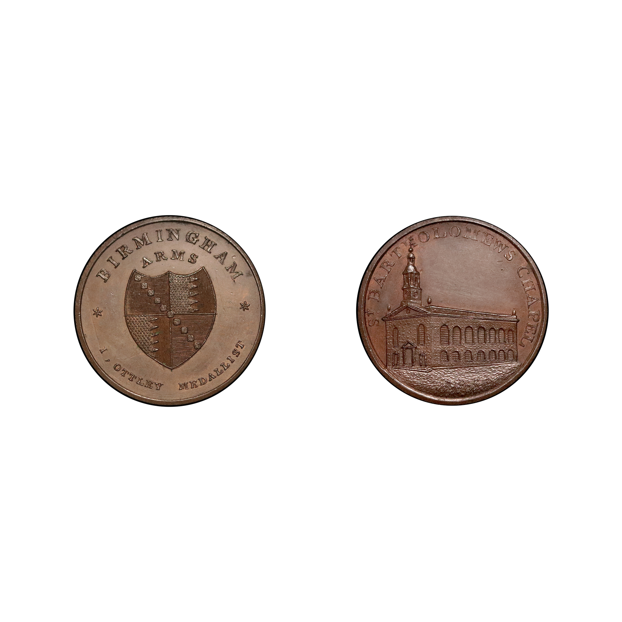 Birmingham, John Ottley, D&H 152; Series of Birmingham Buildings halfpenny struck in copper, 9.72g. Some light scuffing in the obverse fields otherwise bold, exceedingly rare in copper. Good very fine.