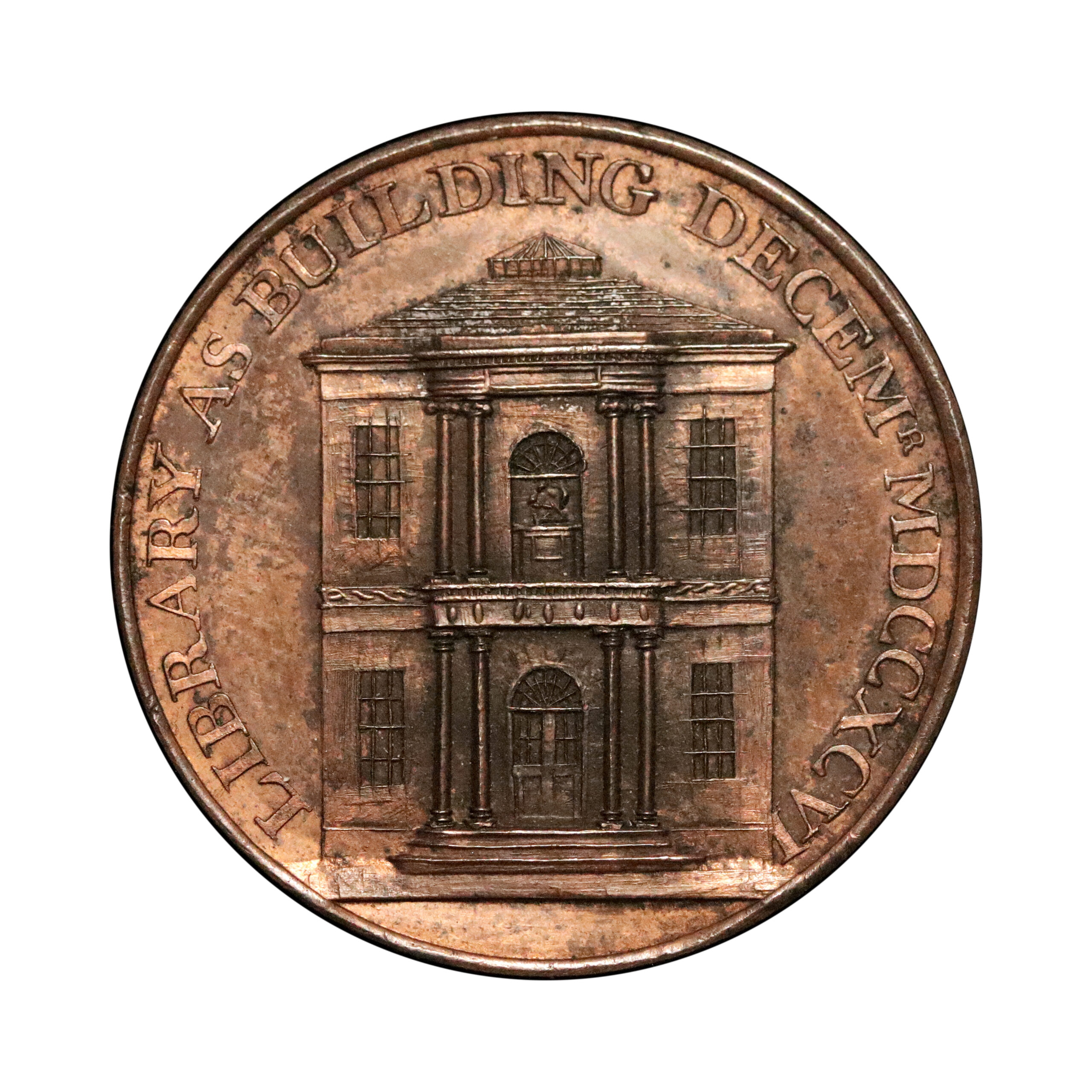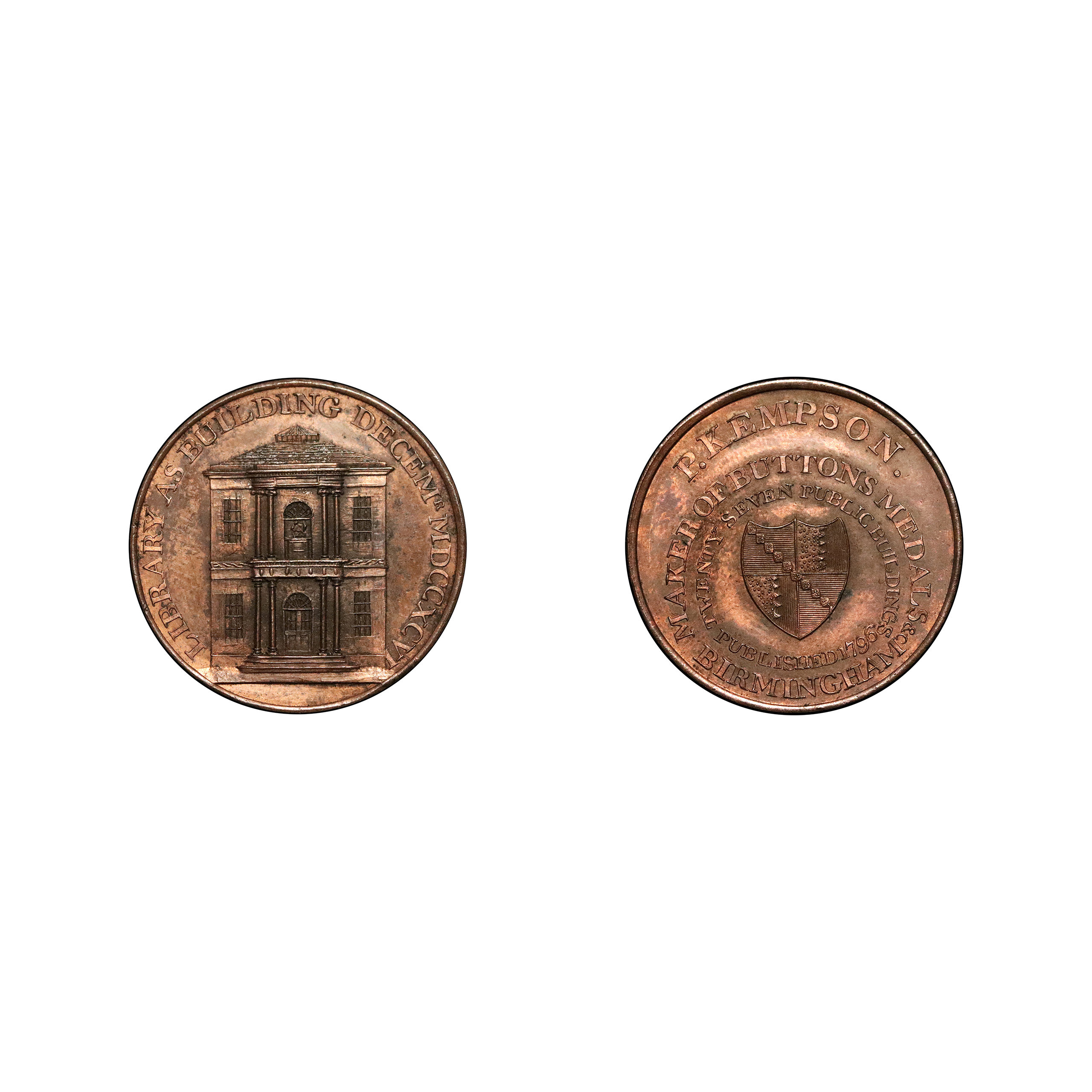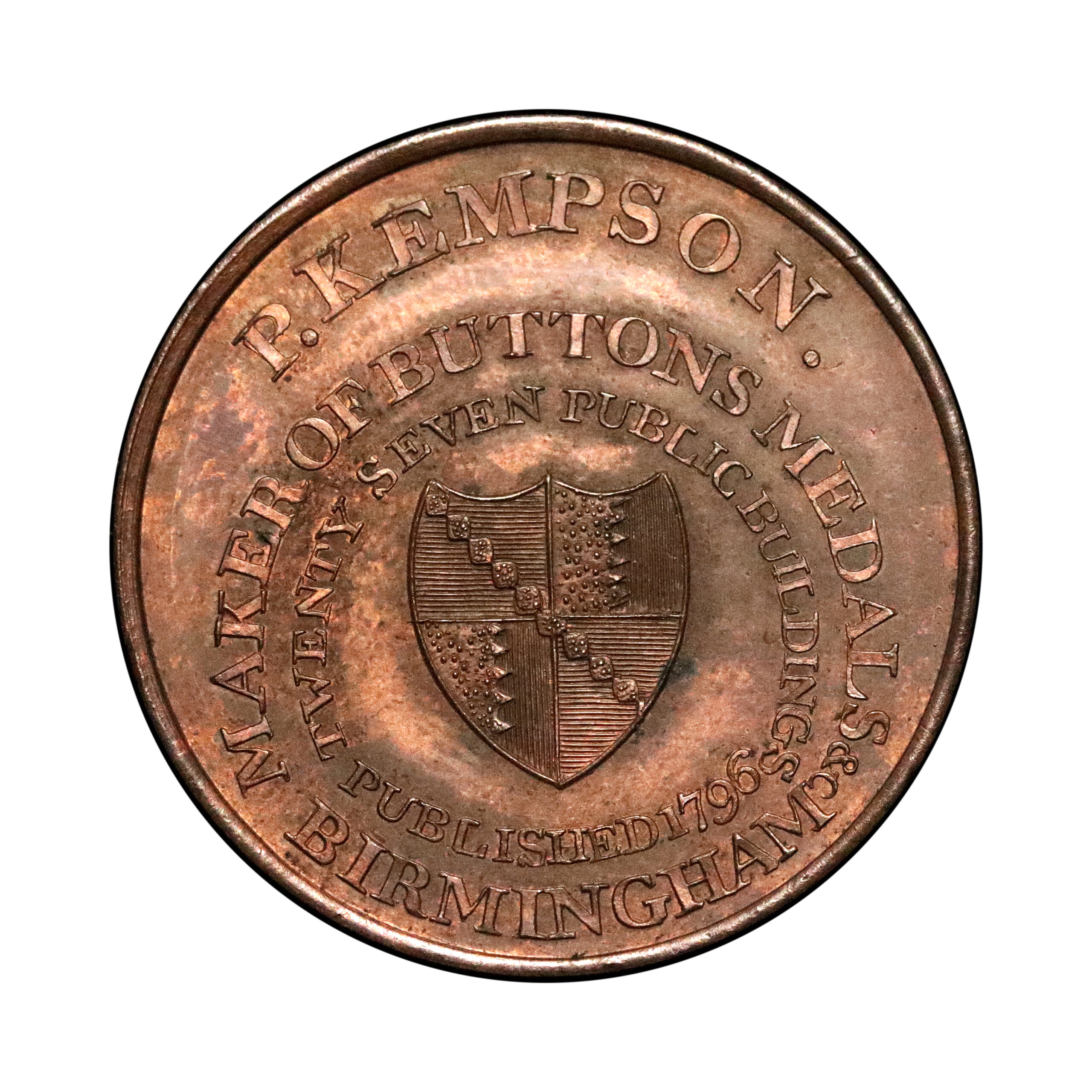 Birmingham, Peter Kempson, D&H 184a, Series of Birmingham Buildings halfpenny struck in brass, 11.94g. Surfaces a little dulled otherwise sharp, very rare in brass. Extremely fine.