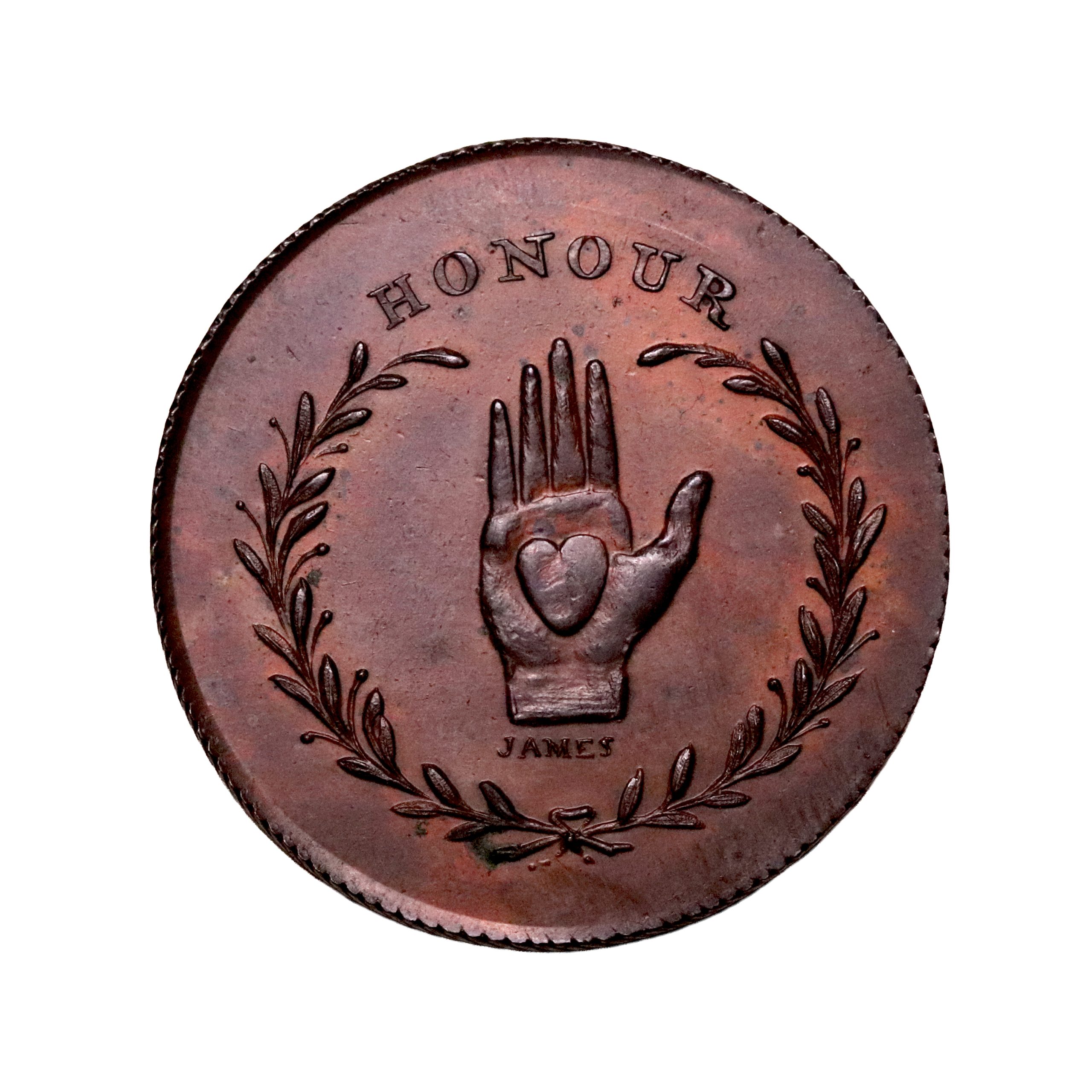 R : Heart in hand between two laurel branches, HONOUR above, signed JAMES below