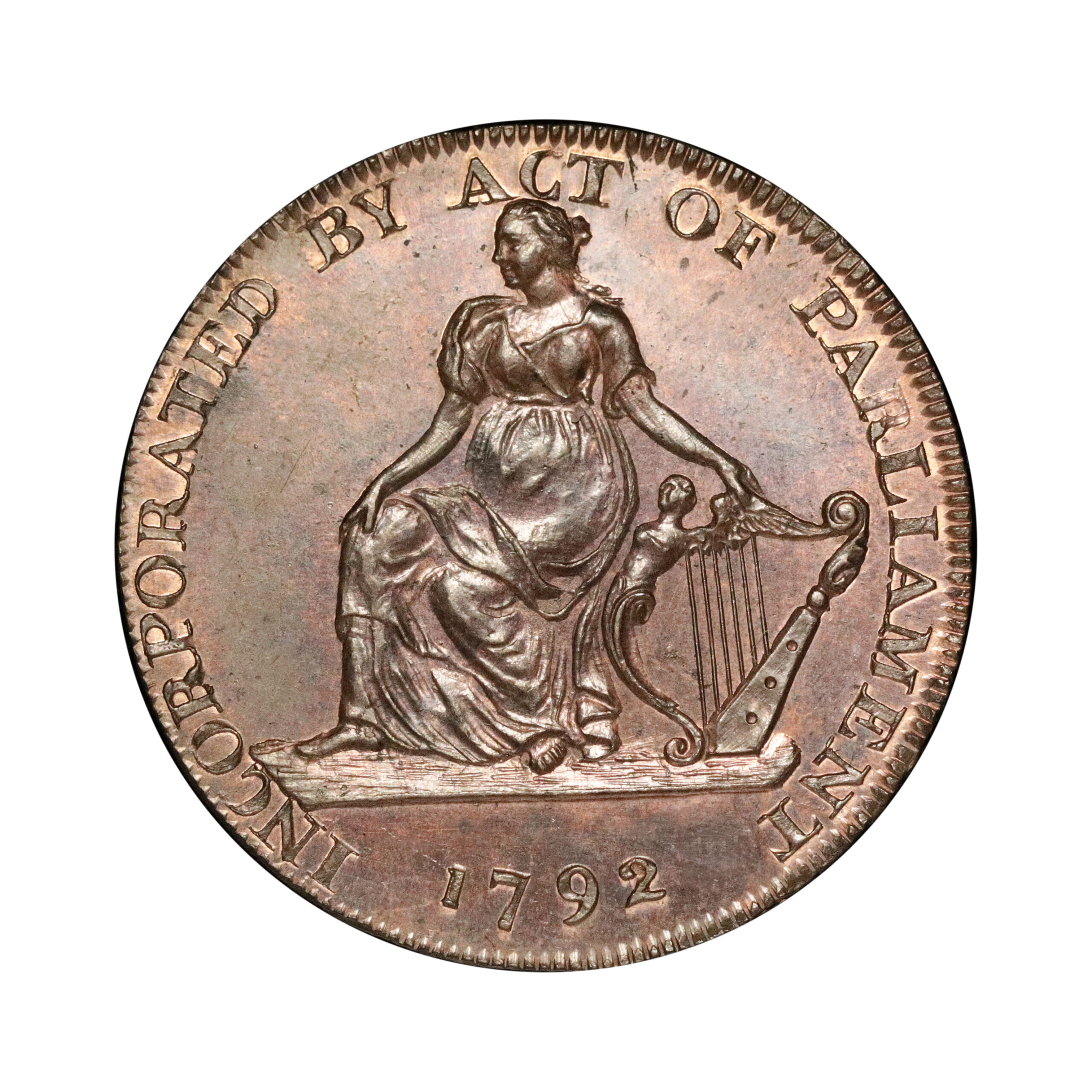 County Wicklow, Hibernia Mines Company, D&H 42, halfpenny struck in copper, 9.29g. Typical die flaw to the N of AND otherwise sharp with golden-brown reflective fields and original colour. Good extremely fine.