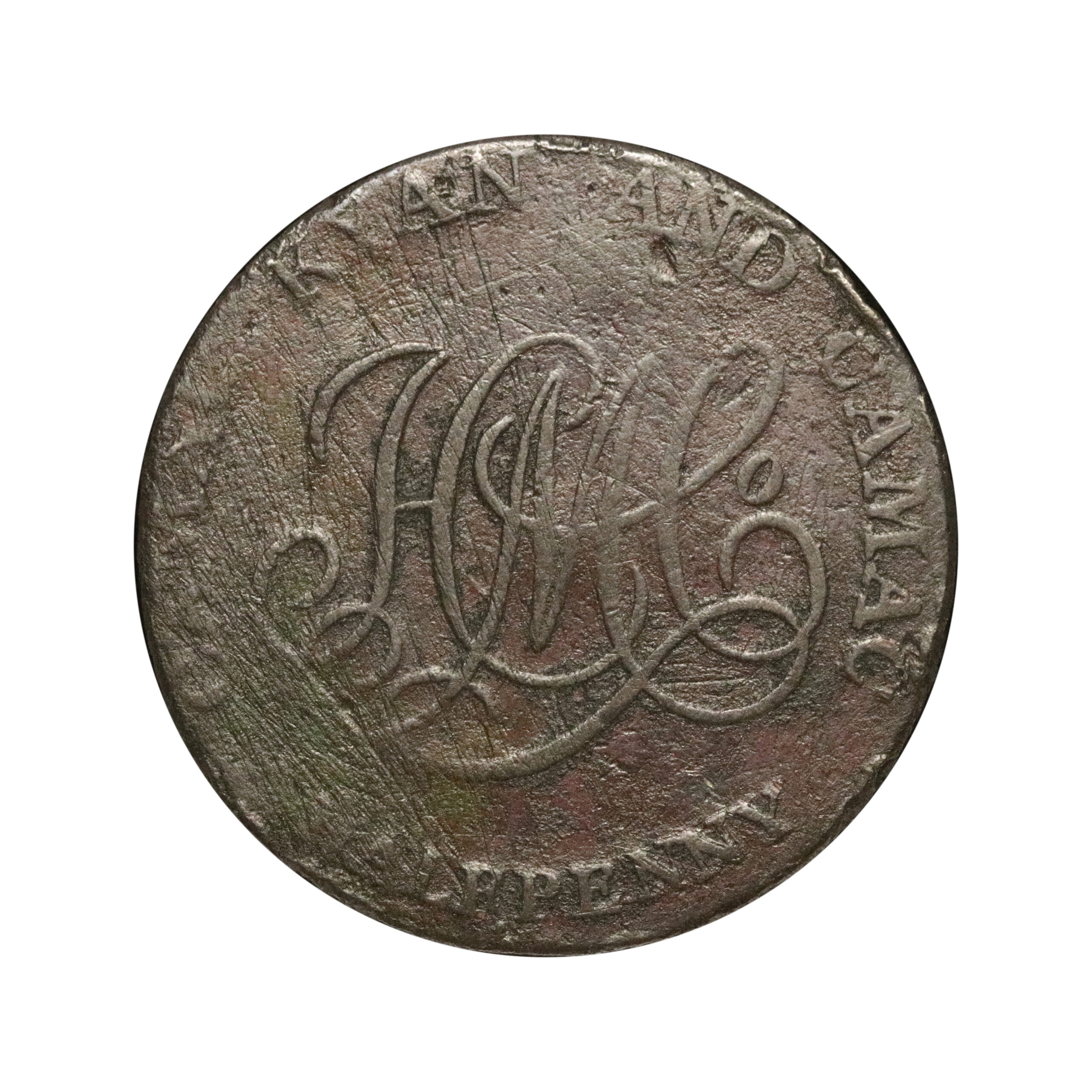 County Wicklow, Hibernia Mines Company, D&H 72a, halfpenny struck in copper, 10.46g. Although mostly blundered, the edge appears as number 2 edge variety. Crude, reverse with some scratches, extremely rare. Fair.