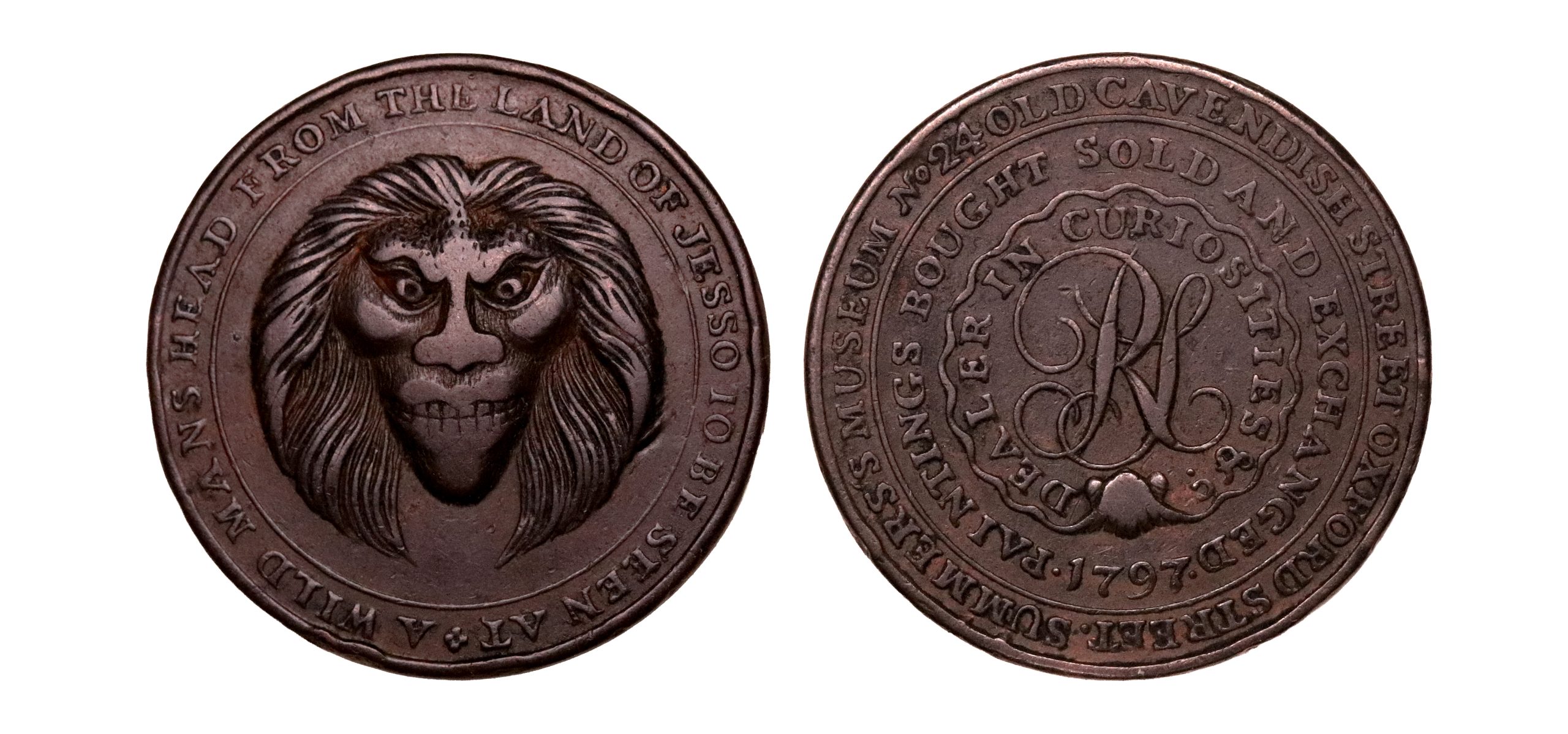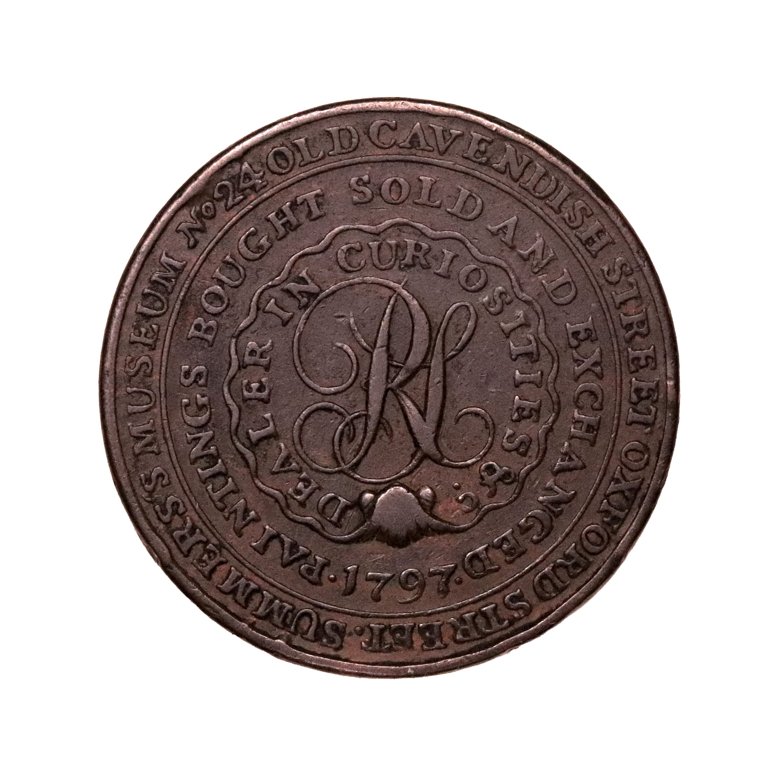 Middlesex, Cavendish Street, Richard Summers; D&H 905, halfpenny struck in copper. Iconic Wildman variety, this the scarcer variety. This piece, quite possibly a pocket piece, even wear and evenly patinated. Good fine.