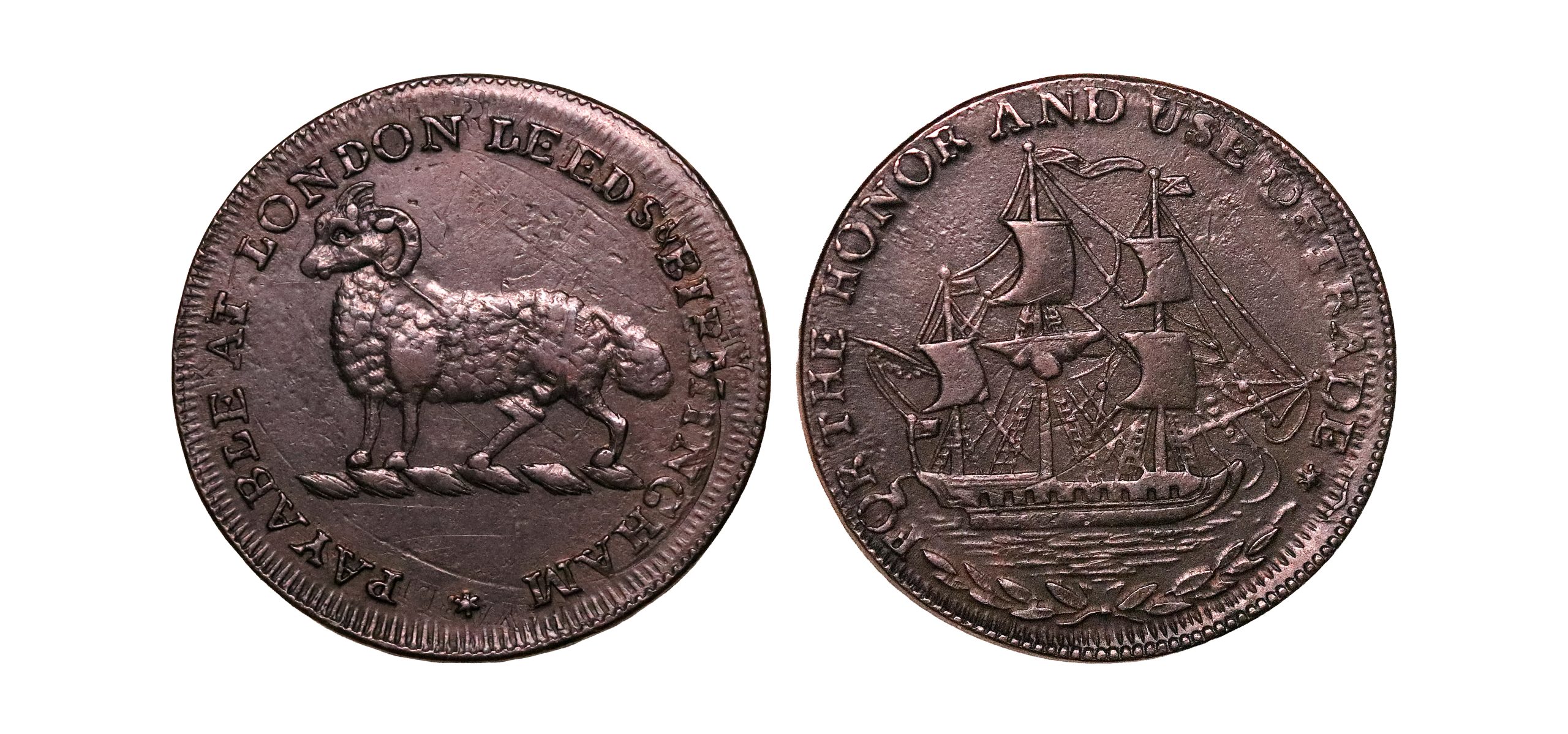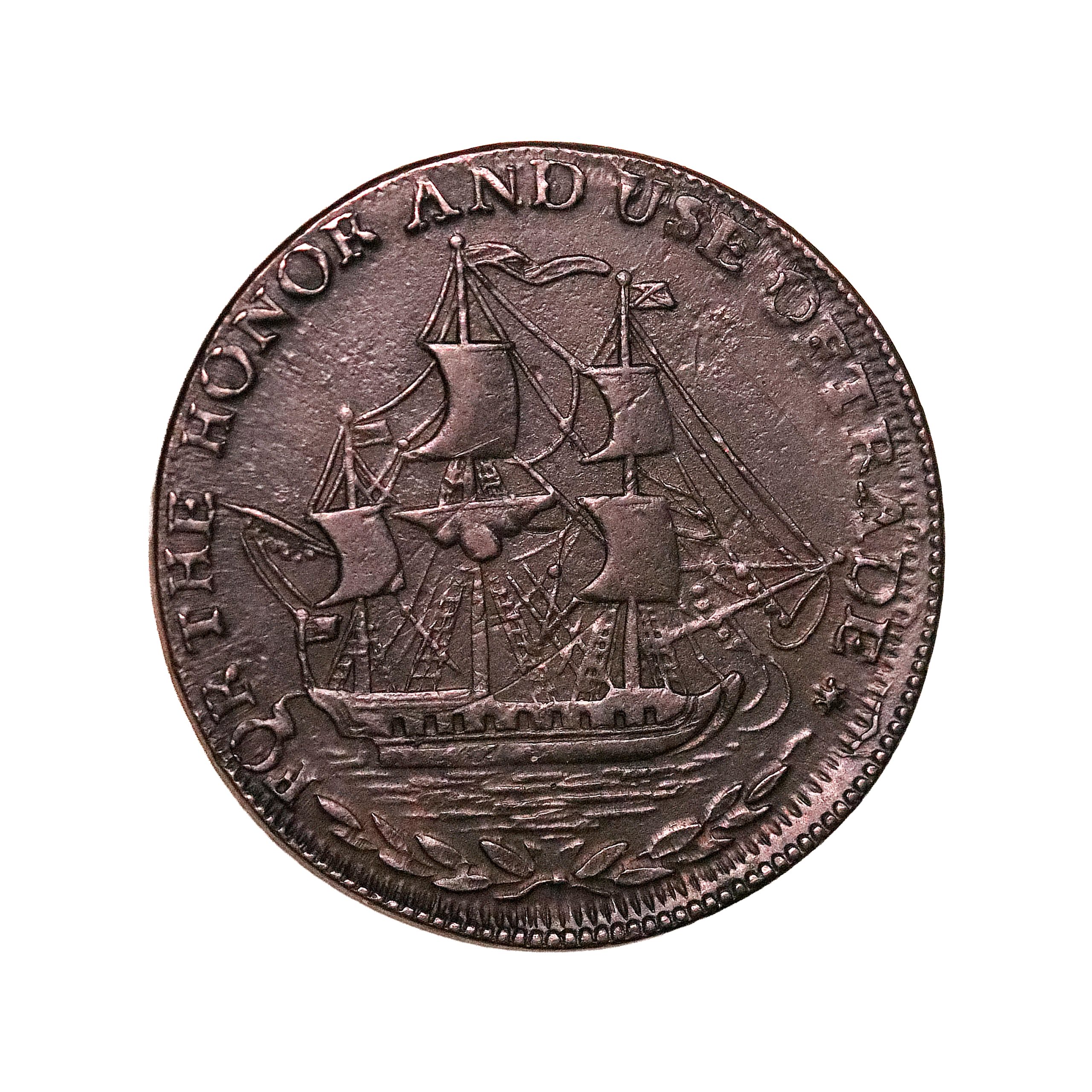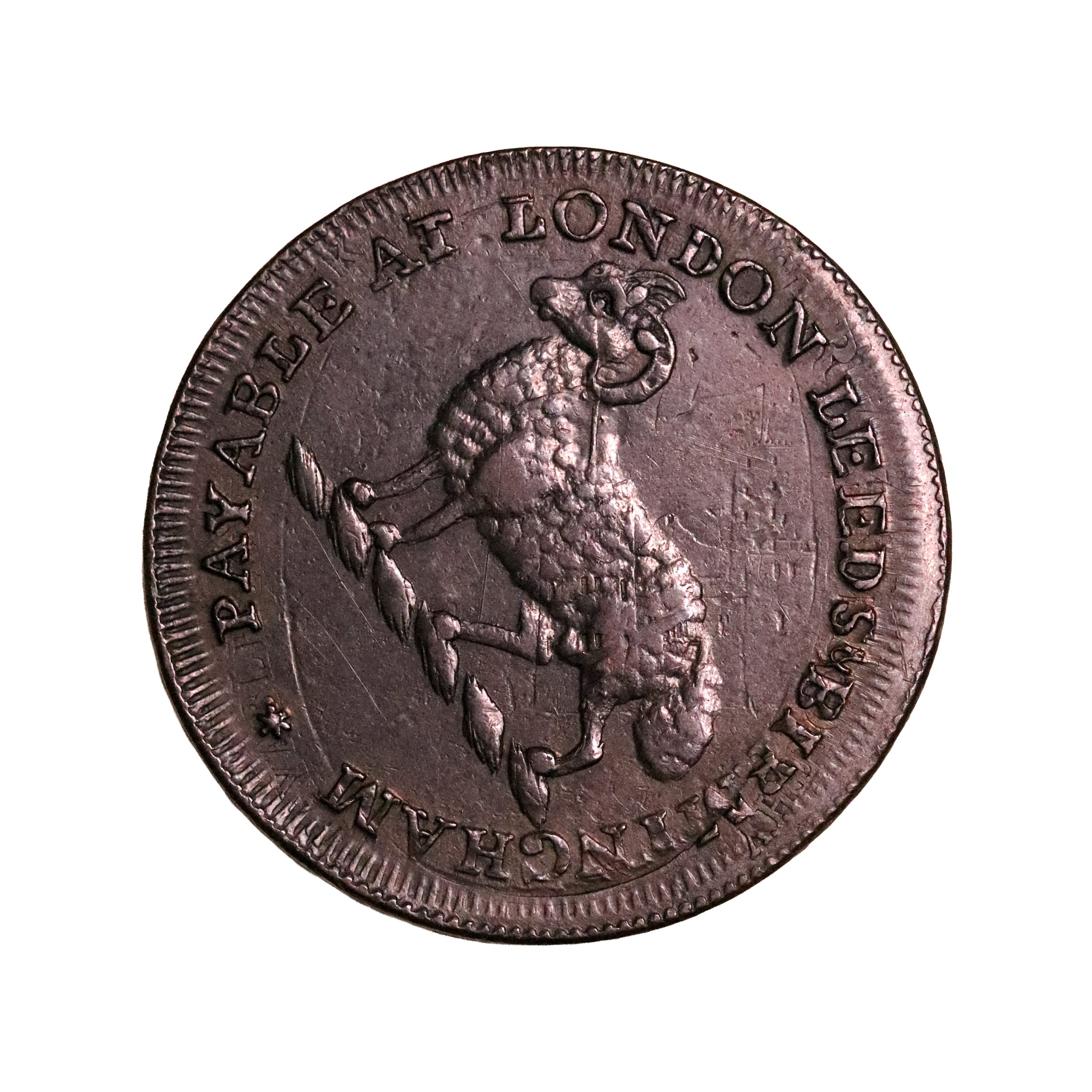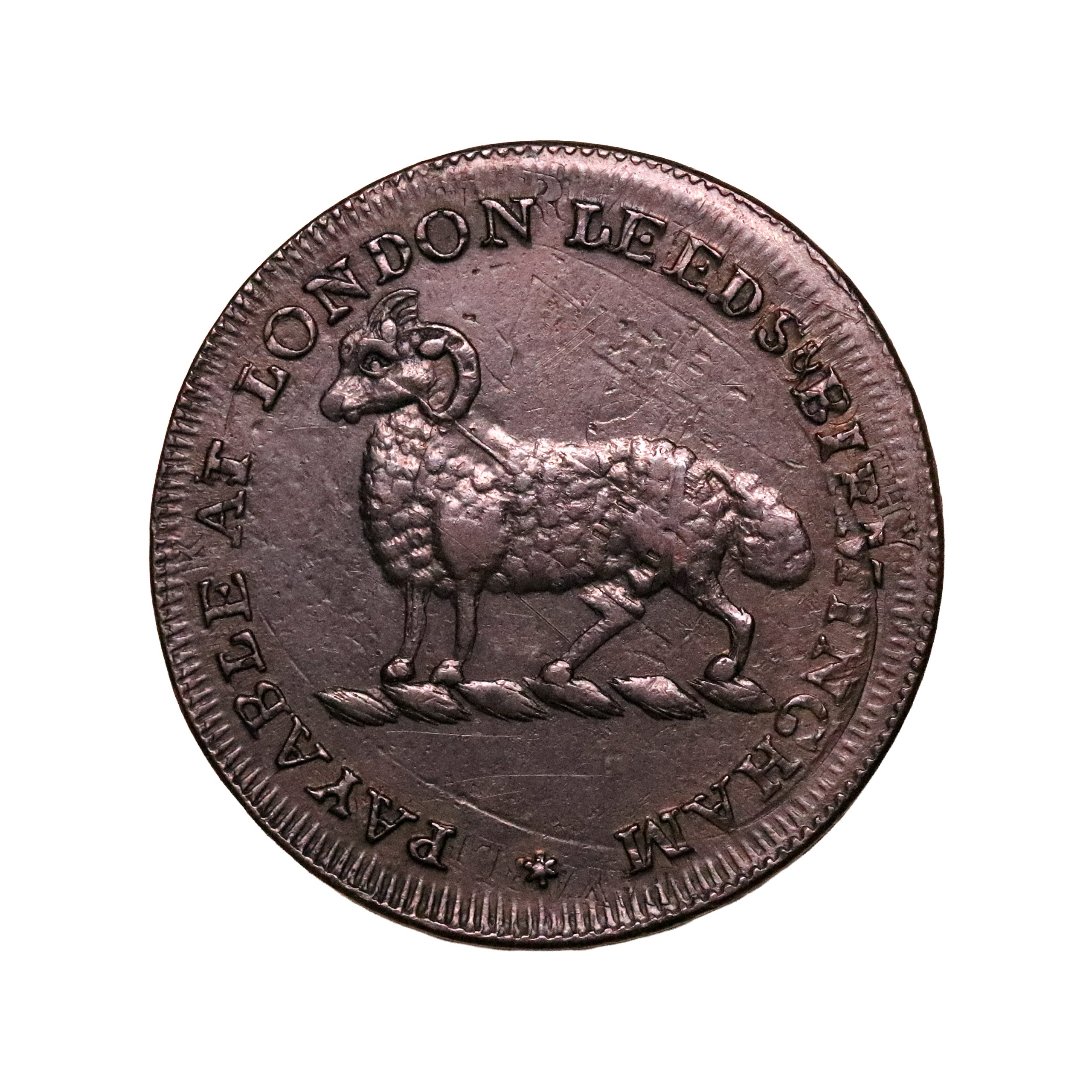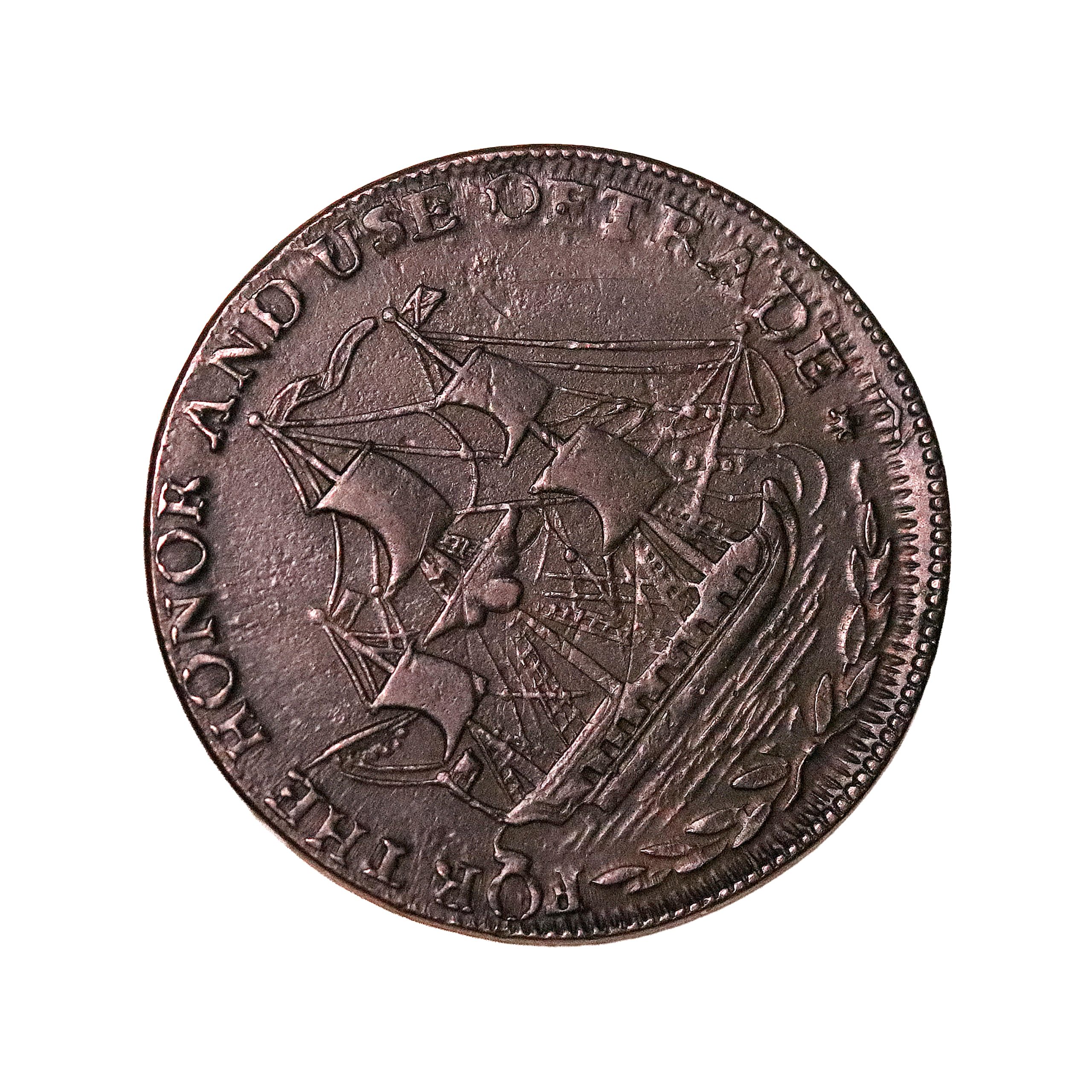 Middlesex, Miscellaneous, Issuer Uncertain; D&H 925, halfpenny struck in copper. London, Essex, and Norfolk variety. This, a very strong example of the overstrike, clearly showing in the fields, more so in the obverse since it has greater surface area. ENNISCORTHY can be clearly seen underneath LEEDS & BIRM. See last two photos for best zoom ability. Evenly patinated, very little handling and the best example we’ve handled. Good very fine for issue. Scarce.