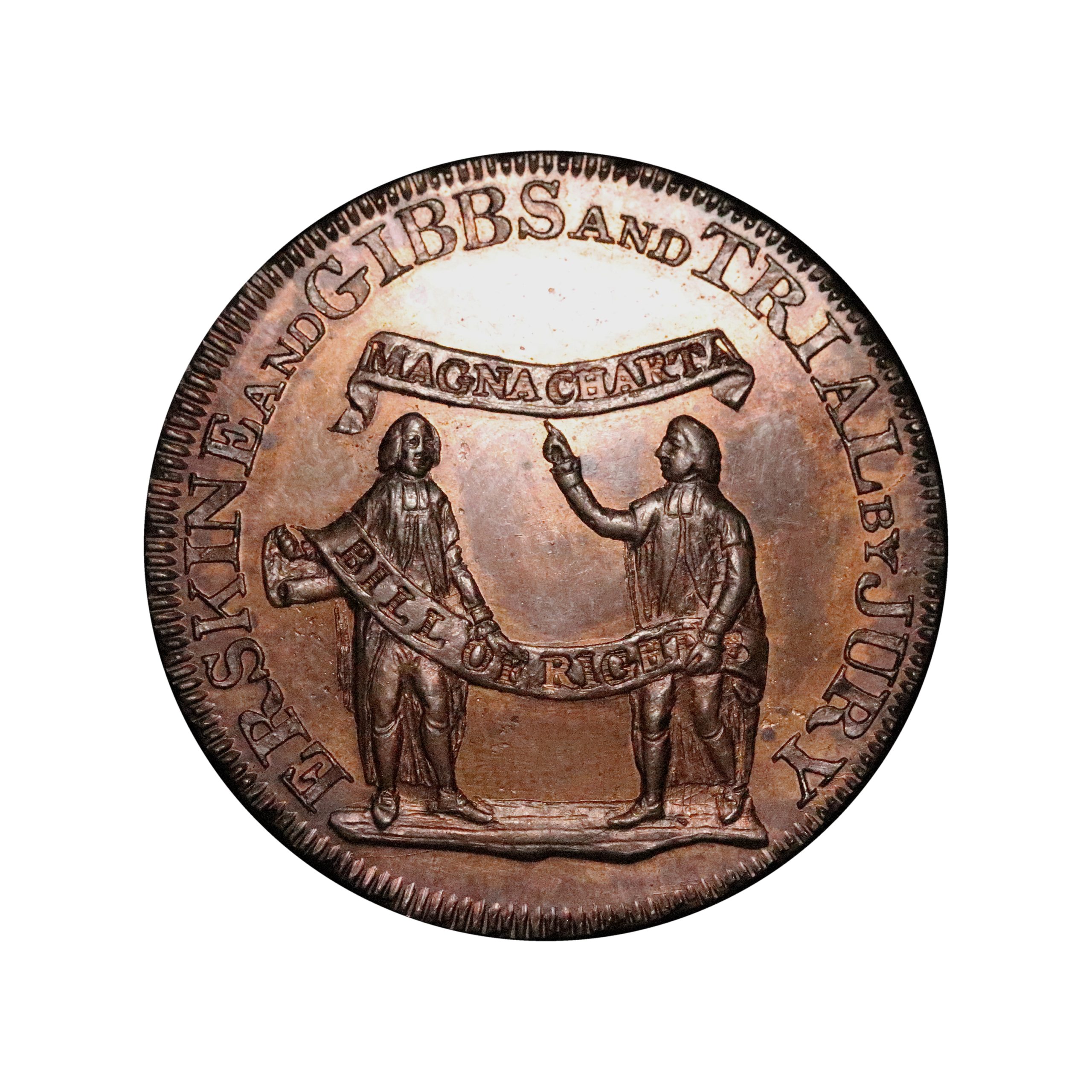 Middlesex, Not local, Erskine & Gibbs Trial; D&H 1011, halfpenny struck in copper. Scarcer variant to the 1012 and struck from polished dies. Fields subsequently proof-like with brilliant red surfaces. Mint state.