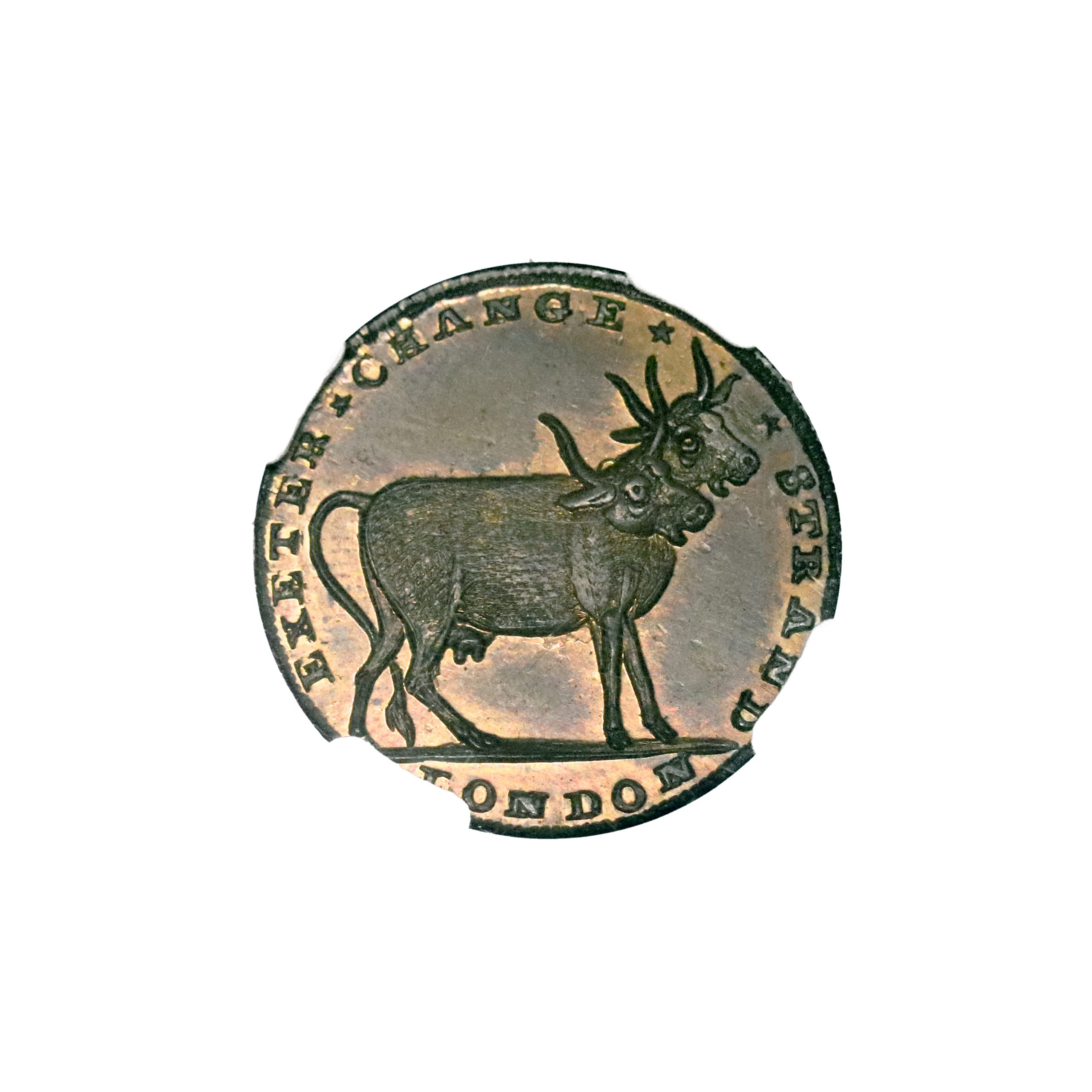 Middlesex, The Strand, Gilbert Pidcock; D&H 1065, farthing struck in copper. A crisp, example with flashy fields and substantial original colour – obverse with full brilliance. About mint state (Gem) and currently housed in an NGC 64RB holder..
