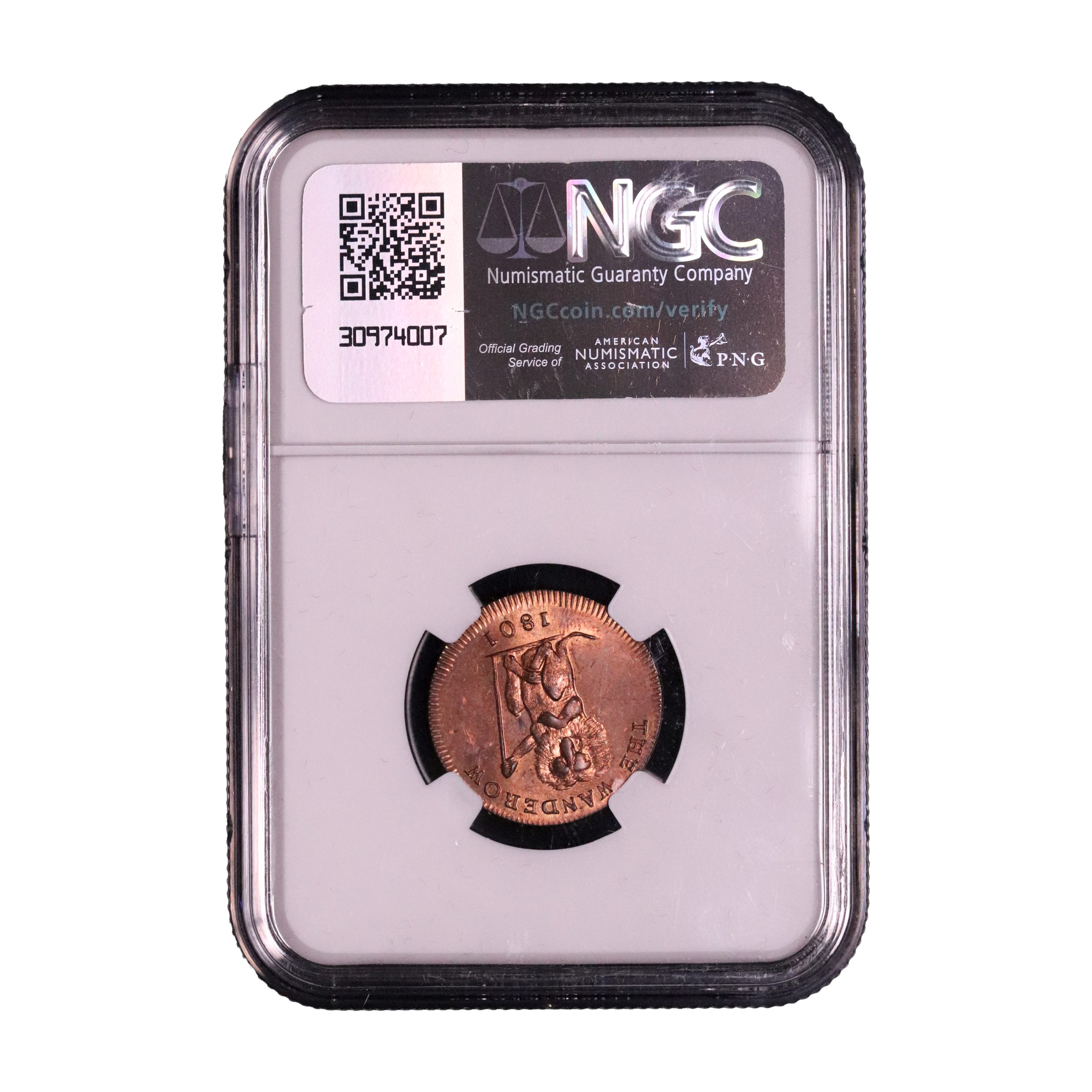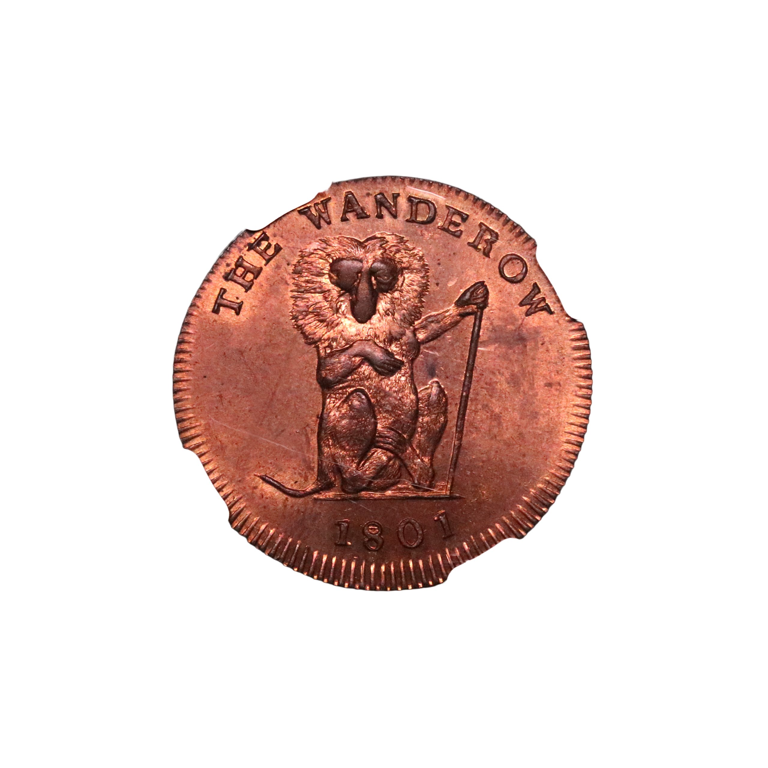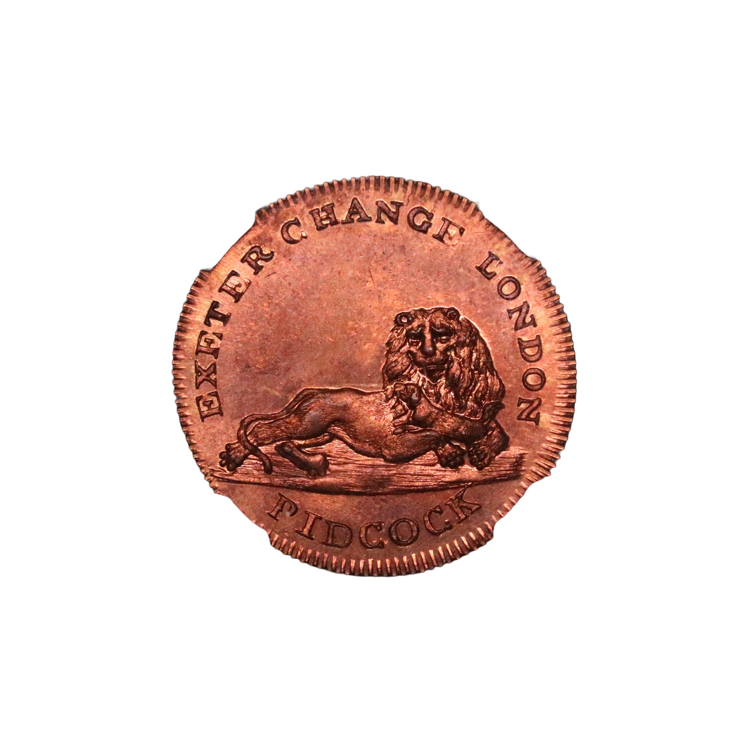 Middlesex, The Strand, Gilbert Pidcock; D&H 1070, farthing struck in copper. Completing the trio of lustrous birds and beasts, a full red lion and Wanderow. The sharpness and eye appeal making it the finest we’ve handled. Mint state (Gem) and currently housed in an NGC 65RB holder..