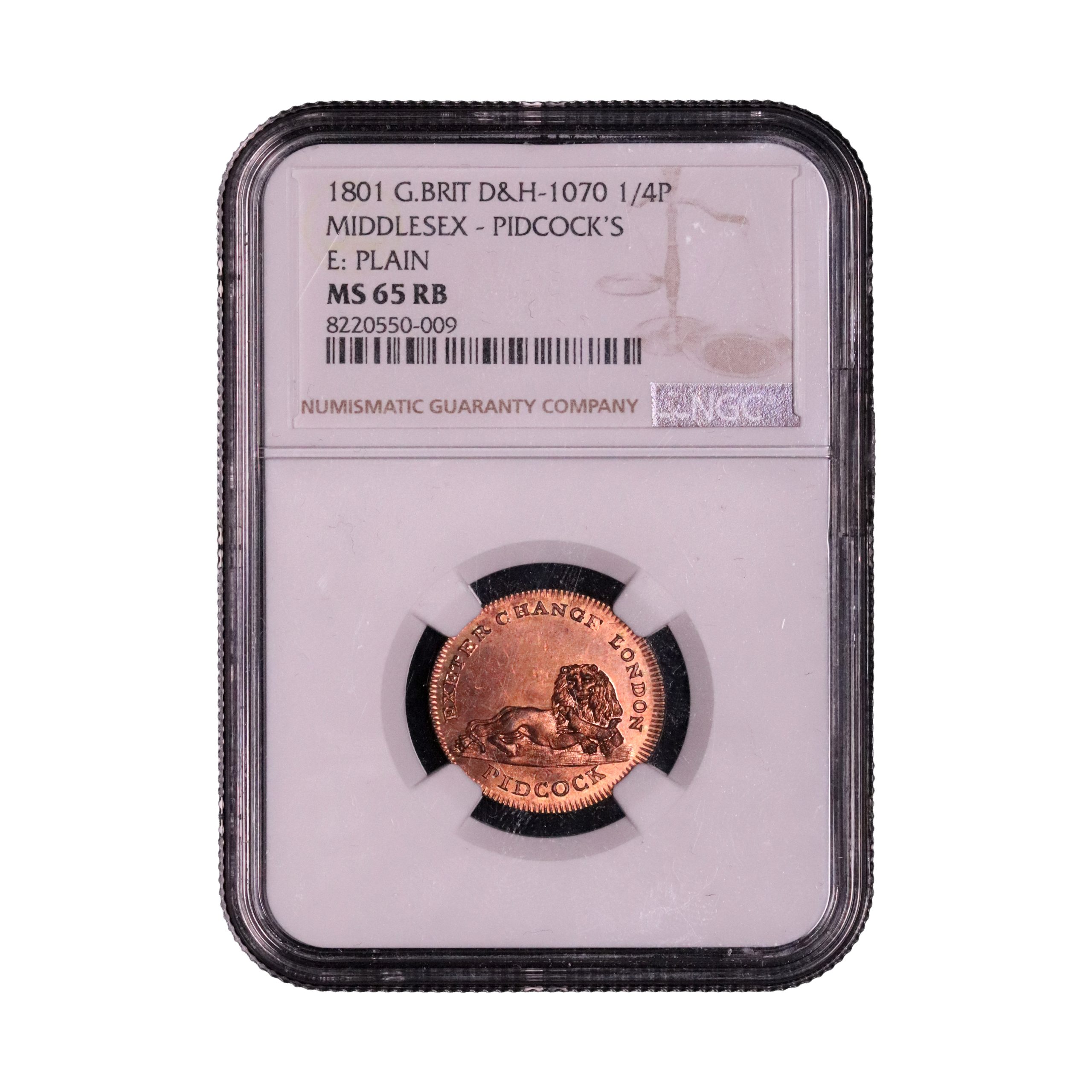 Lot 216 – Middlesex Pidcock’s Farthing D&H 1070, full red Gem, NGC 65RB