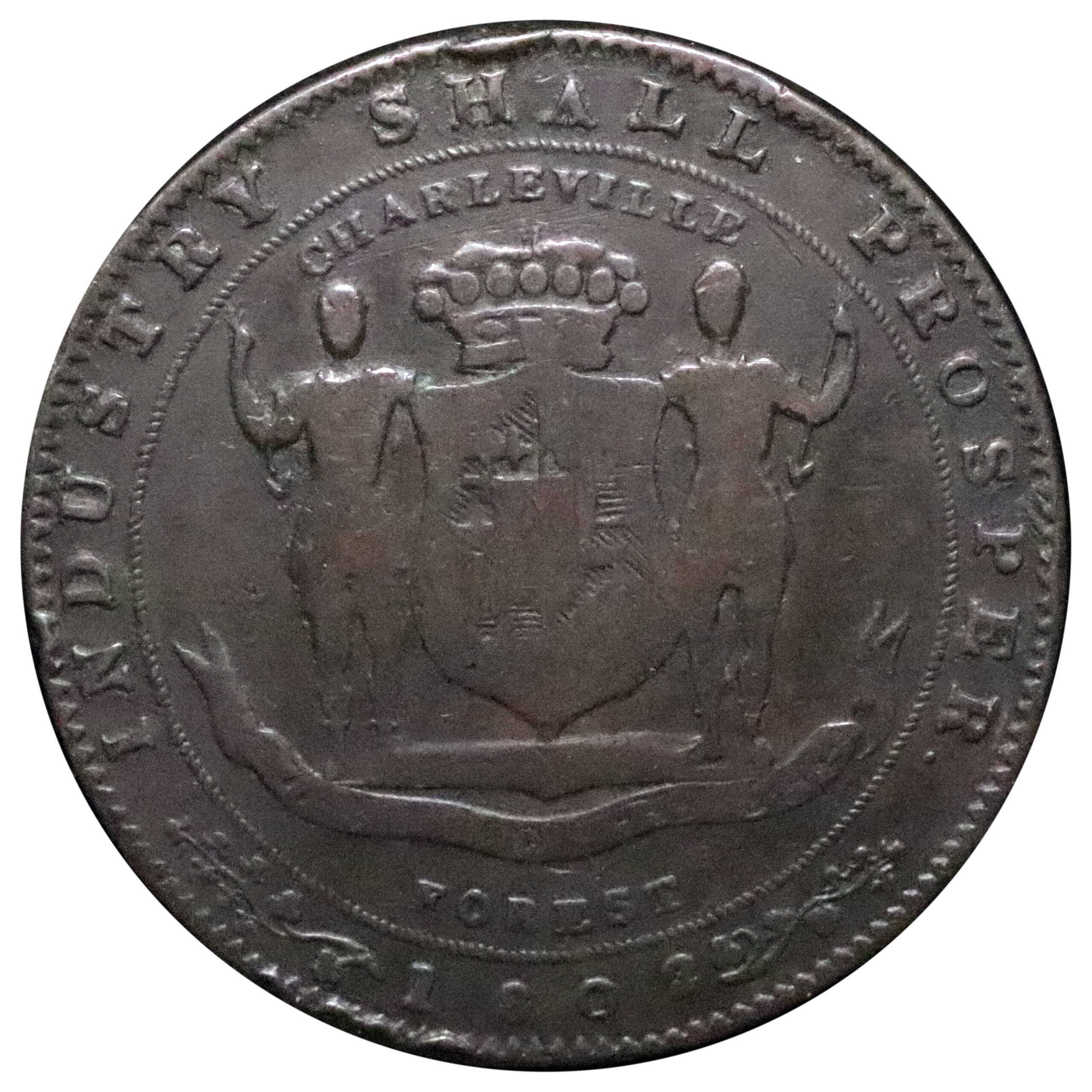 Tullamore, Viscount Charleville; D&H 4; Thirteenpence struck in copper. 20.16g. Some rim nicks, toned and evenly worn. D&H 1 and 2 do turn up with some frequency, some in exceptional grade. This variety, very seldom seen in any grade. Extremely rare, about fine.