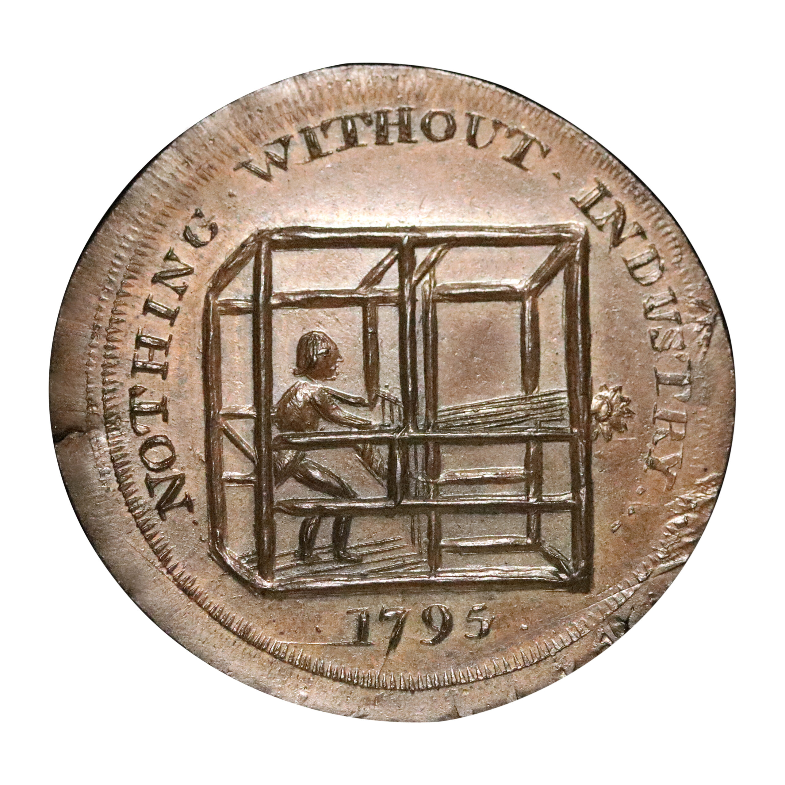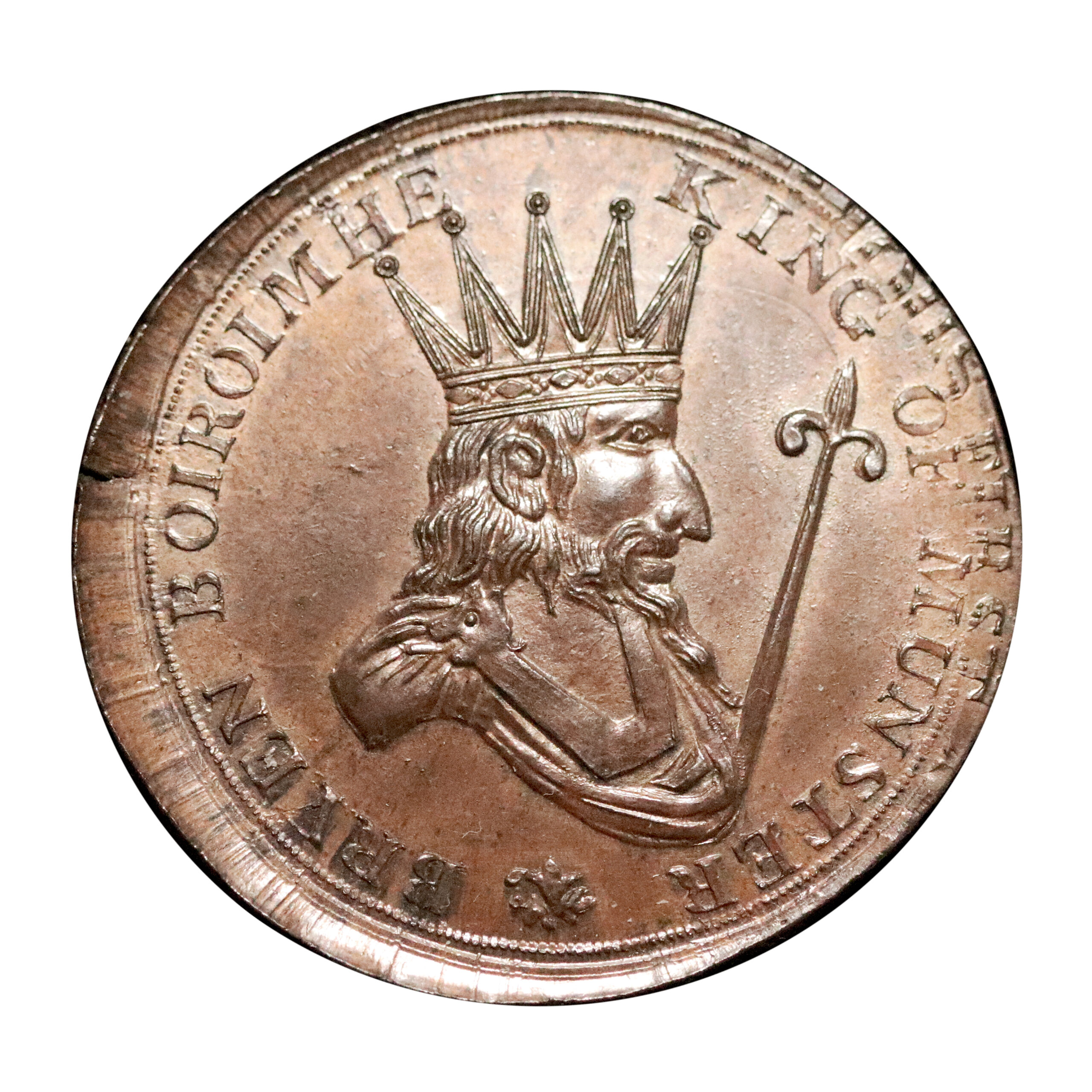 Clare, Cork, Kerry, Thomas Prattent; D&H 7b – variety overstrike; halfpenny mule struck in copper. 8.98g. This piece, the Baldwin Basement and ex-Dalton specimen. Overstruck on a Hampshire 16 host with planchet broadly expanded as a result of the forceful strike with resulting fracture. Otherwise, bold with even brown fields and parts of the host clearly visible throughout. Extremely rare variety, possibly unique. Good extremely fine.
