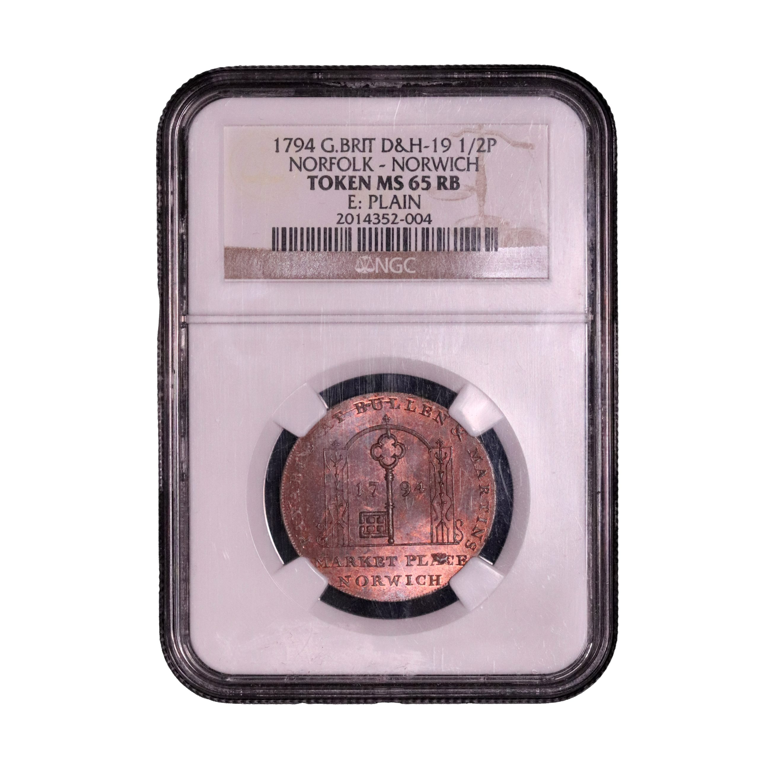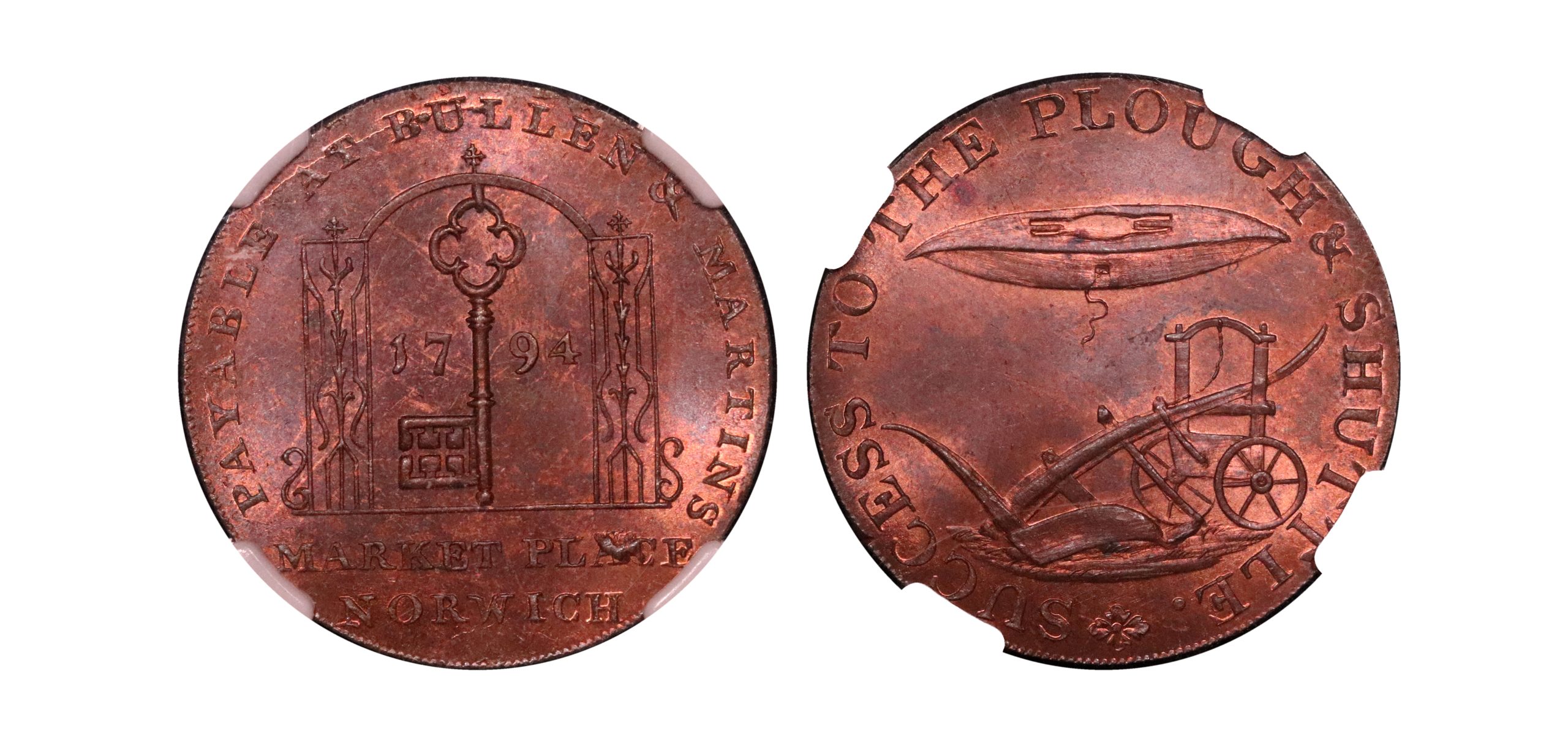 Norfolk, Norwich, Bullen & Martins; D&H 19, halfpenny struck in copper. Typical obverse die cud. Sharp, with substantial red with flash, about mint state (Gem UNC) and currently housed in an NGC 65RB holder.