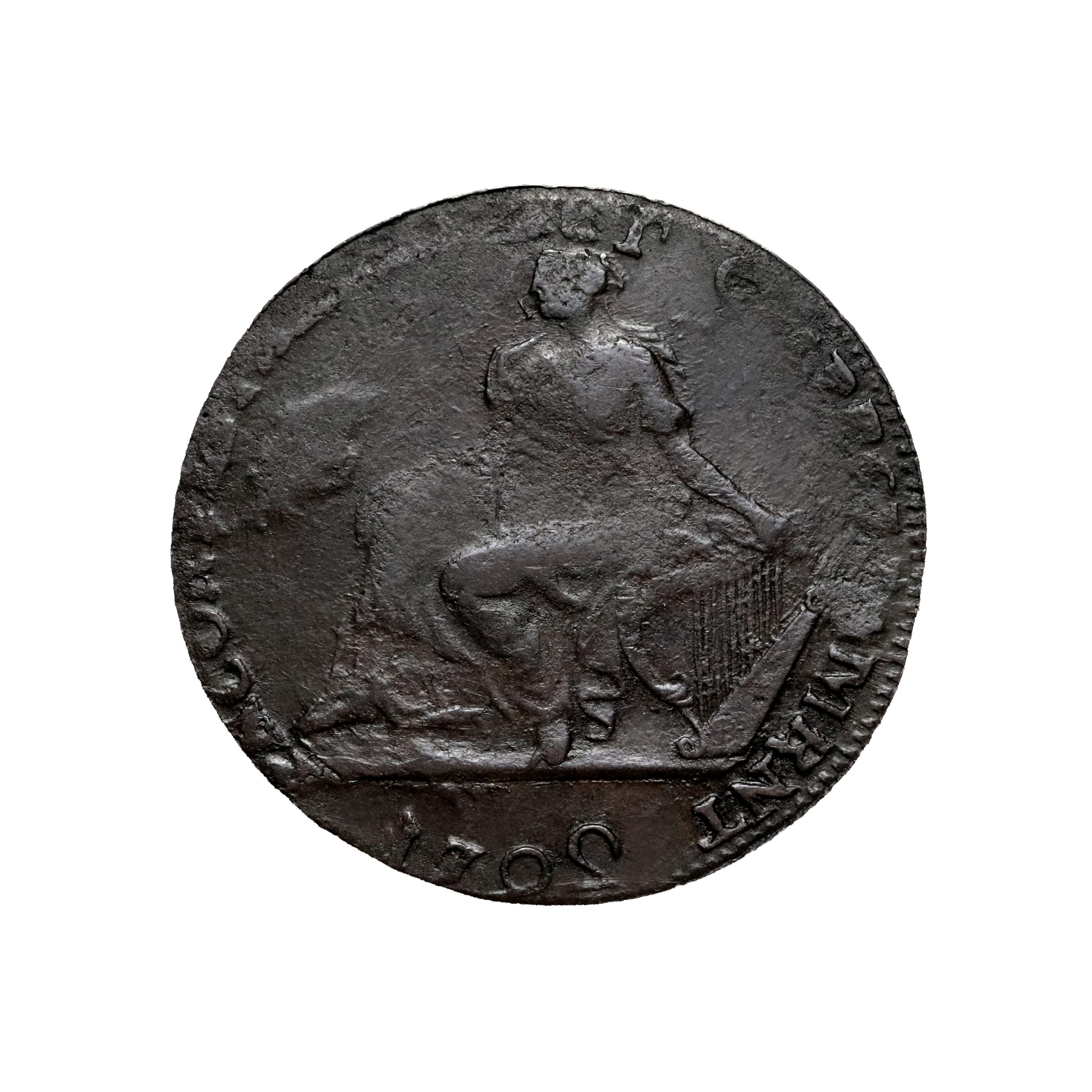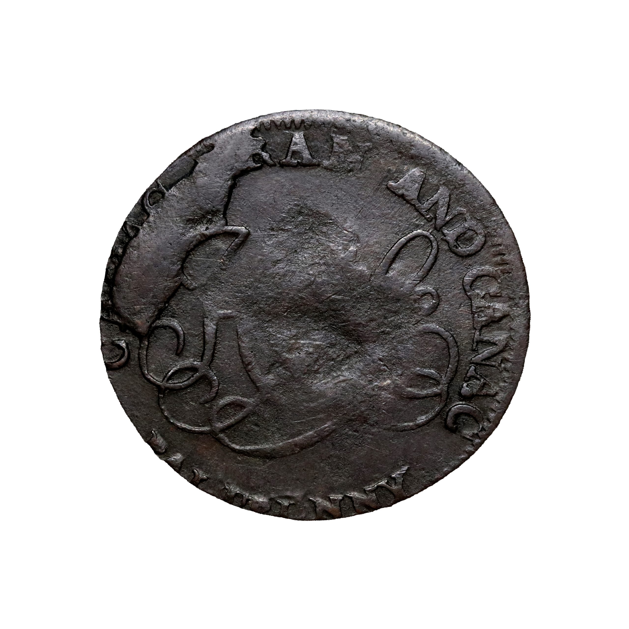 County Dublin, Dublin, Issuer Uncertain; D&H 202, imitation halfpenny struck in copper. Reverse legends as CANAC KRAN AND CANAC PALFPLNNY with retrograde date. Struck from late die state with reverse die cud dominating the upper-left rim area, double the size of that of the D&H plate. Thin planchet, a terminal die state, very fine for issue. Very rare.