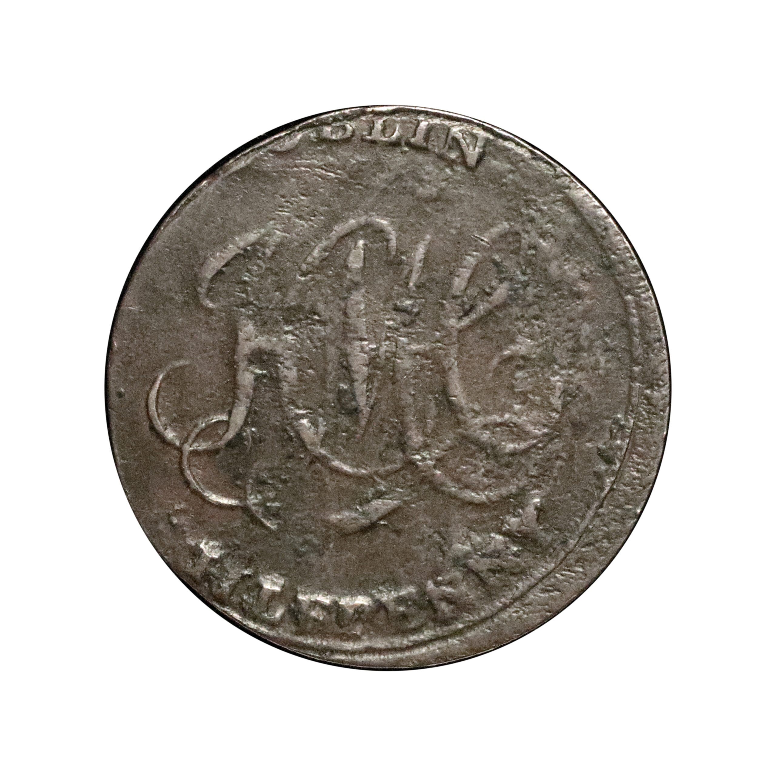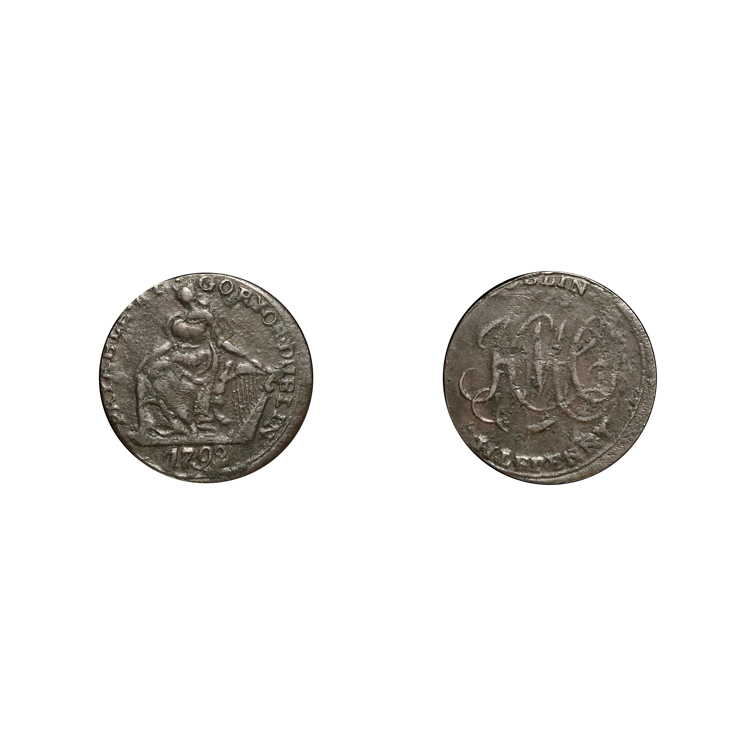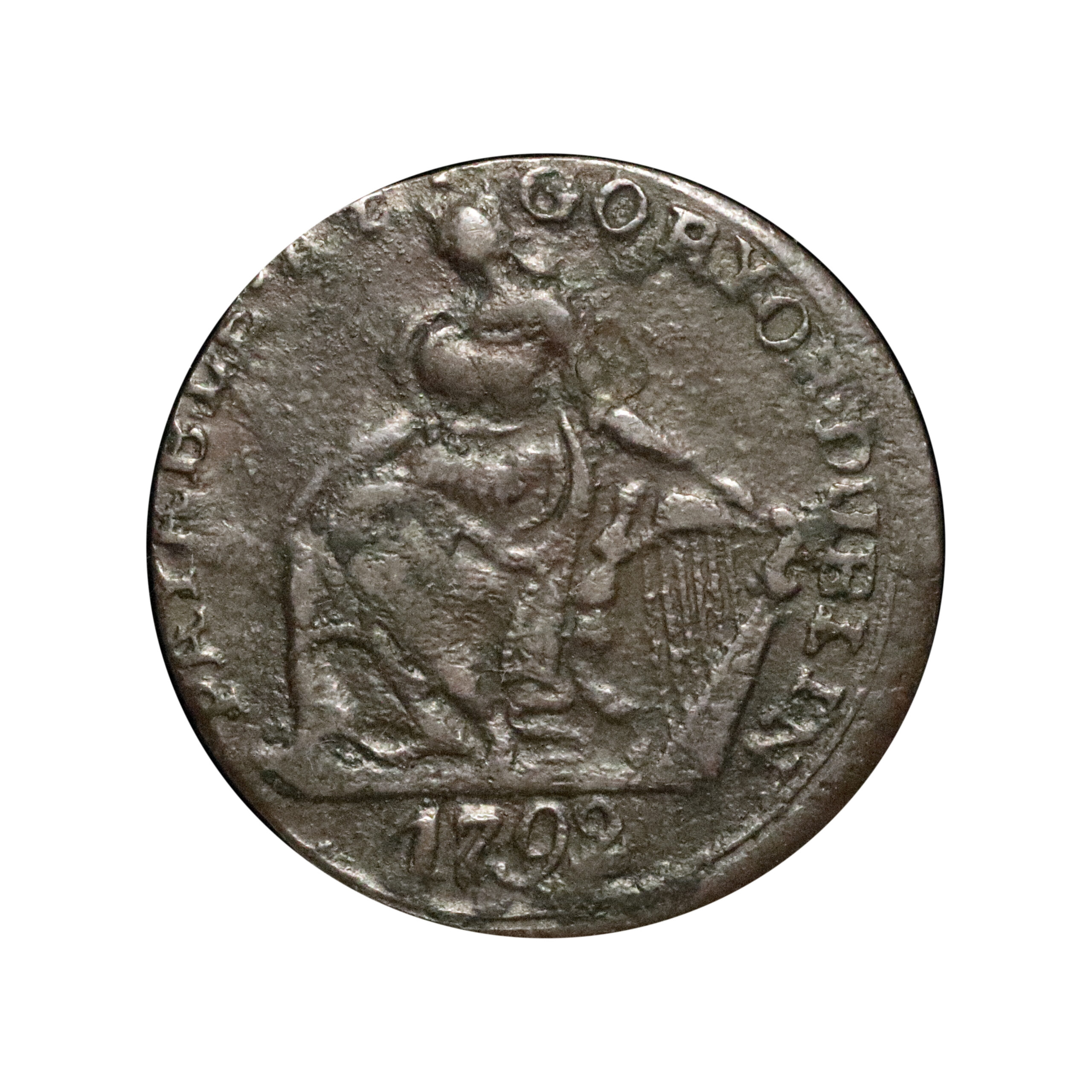 Gorey, Issuer Uncertain; D&H 18; halfpenny struck in copper. 3.95g. Crude imitation variety with reverse clearly spelt as HLFPENNY. Unevenly struck as usual with some bold details. Listed as extremely rare but probably not quite that. Fine or better for issue.