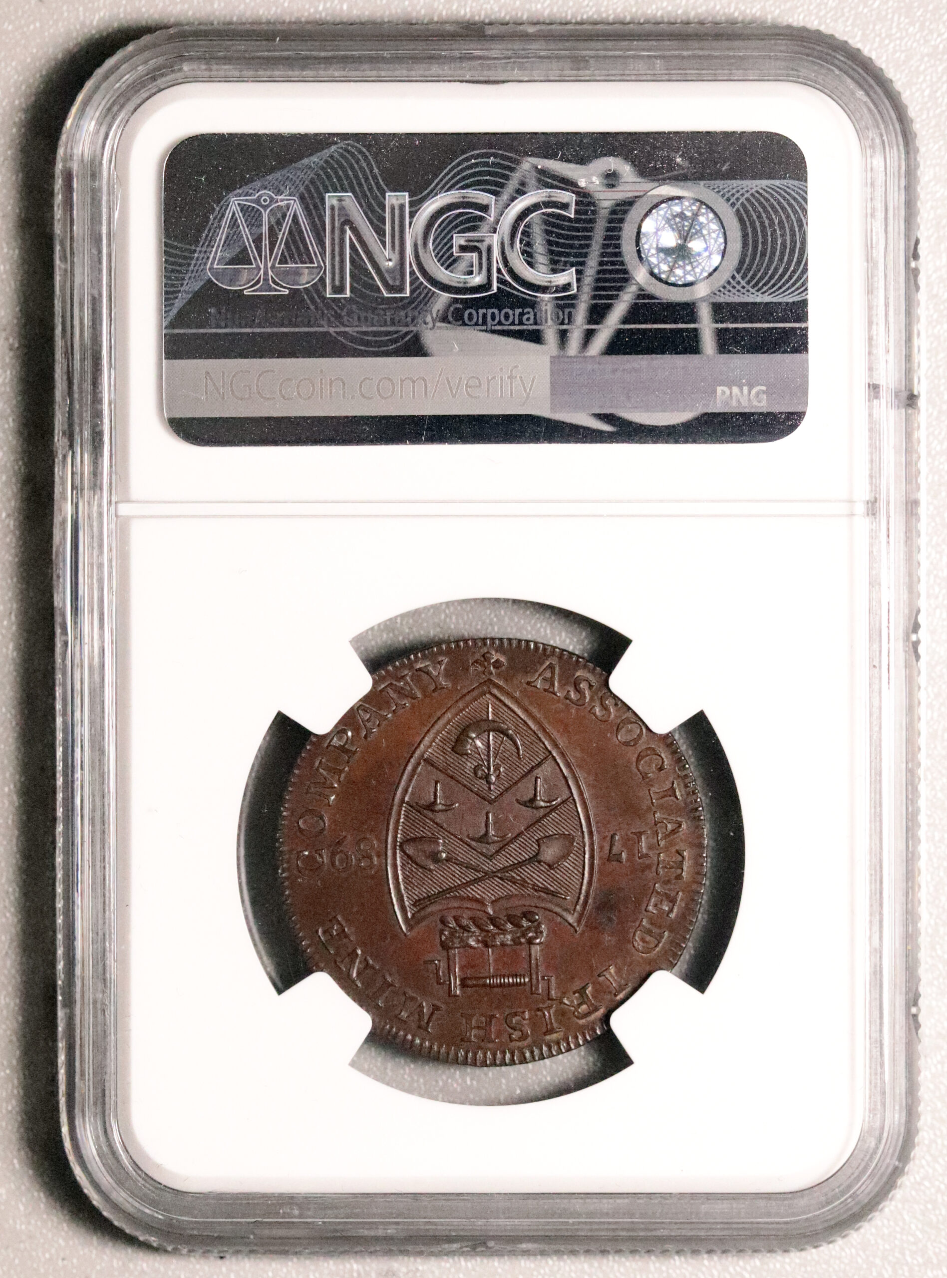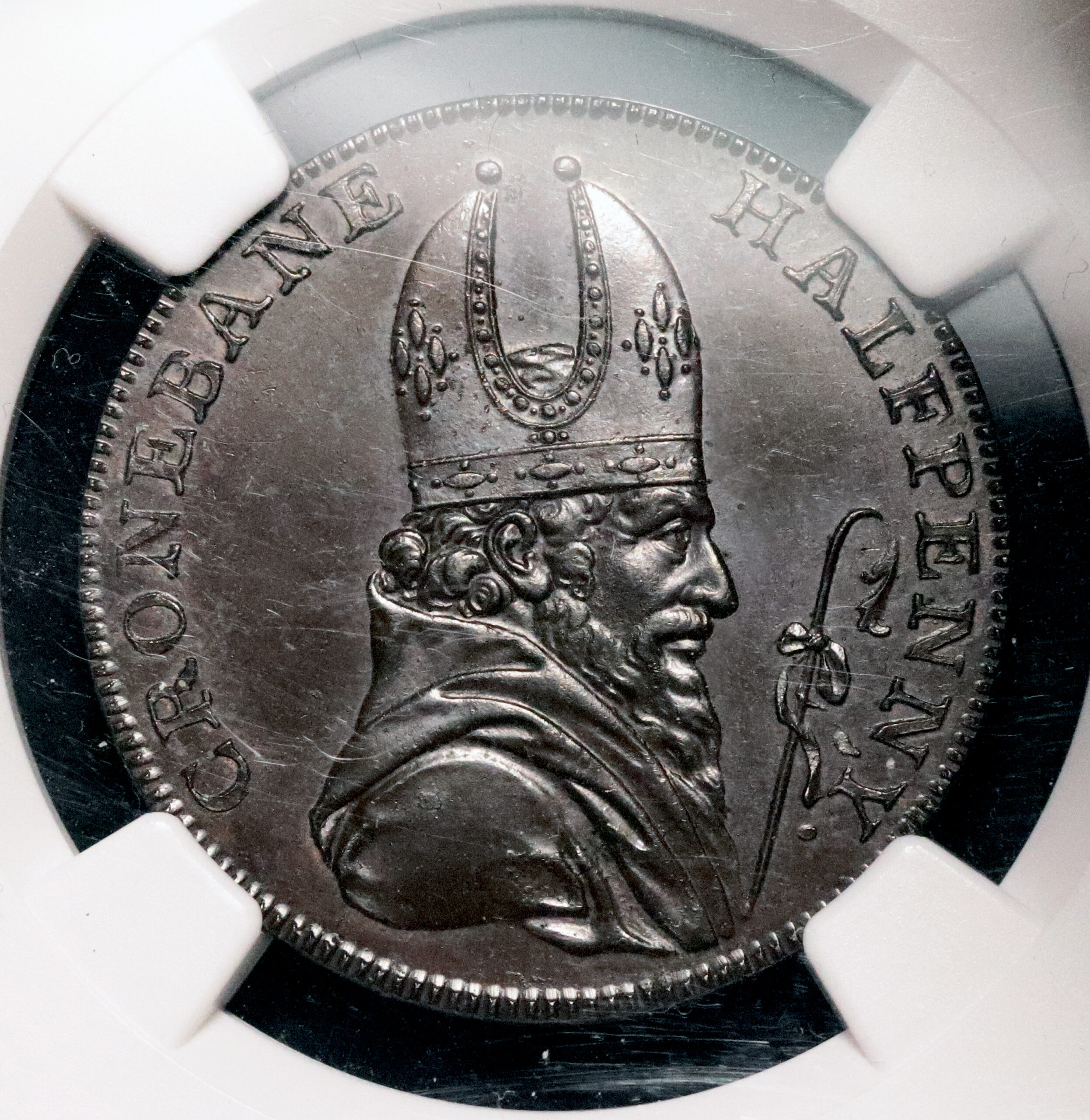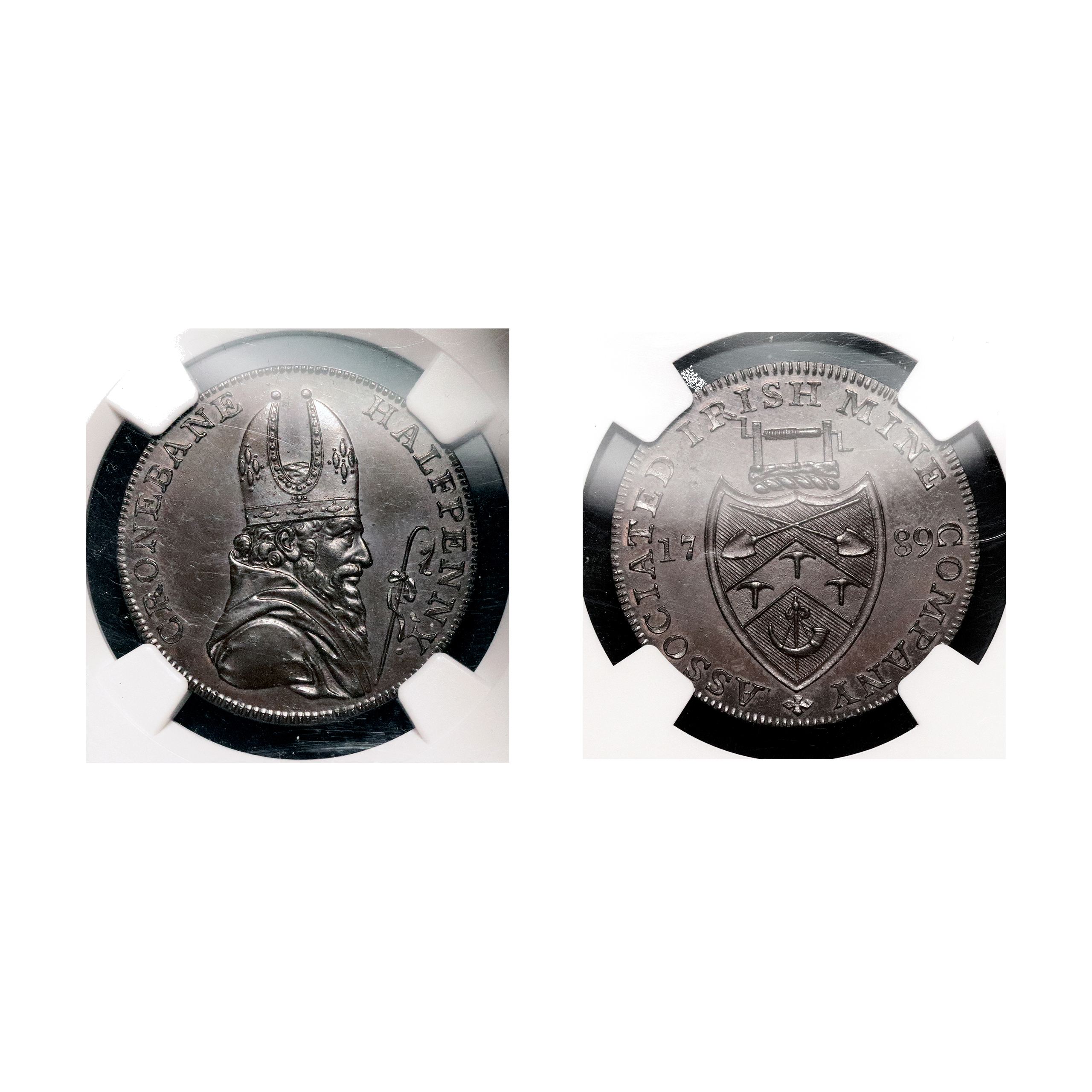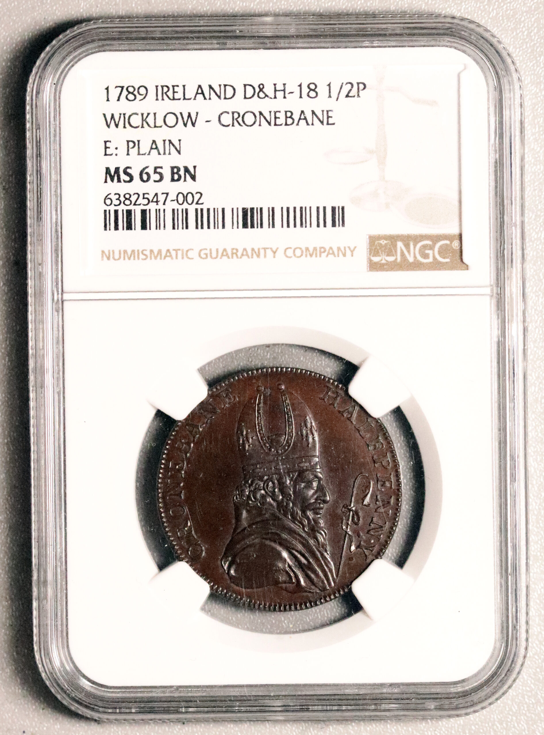 Cronebane, Irish Mines Company; D&H 18; bronzed halfpenny with plain edge. Obverse with attractive reflective fields. Currently housed in an NGC MS 65 BN holder. Extremely fine or better for issue.