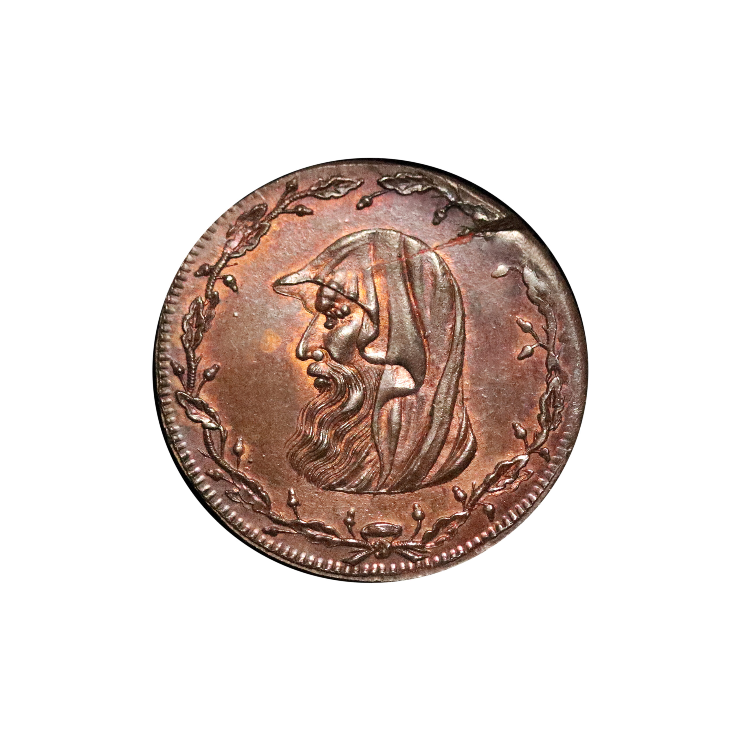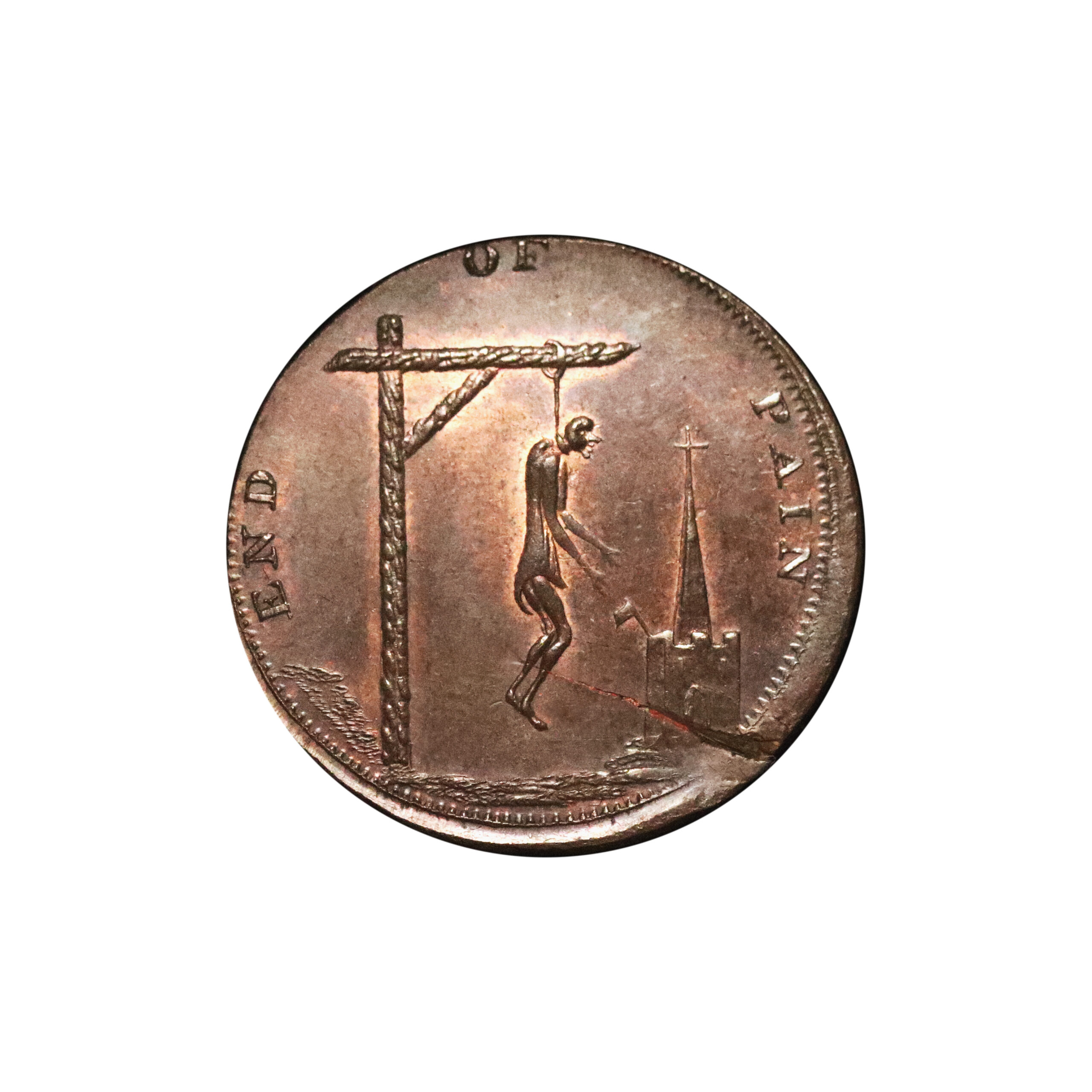 Amlwch, Skidmore; D&H 459, End of Pain copper mule farthing struck in copper, 3.21g. Planchet crack due to forceful strike otherwise. Struck slightly off-centre otherwise sharp with attractive golden-brown fields and substantial original colour. Rare. Good extremely fine.