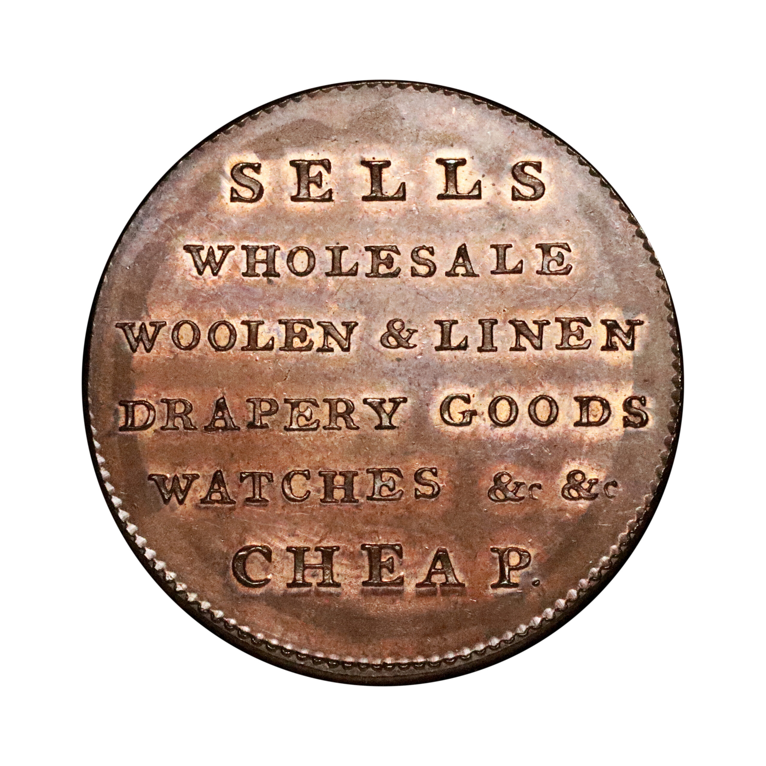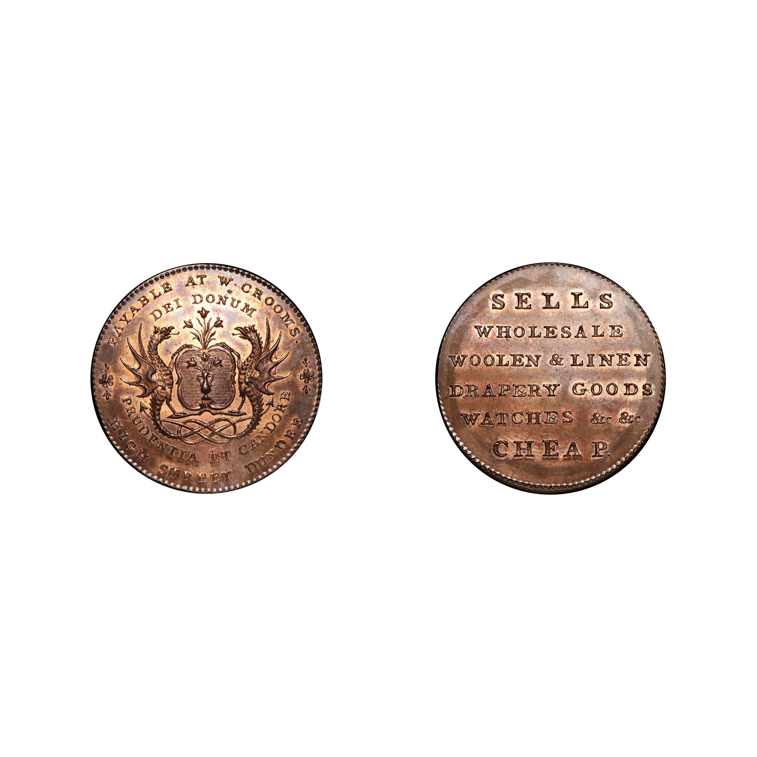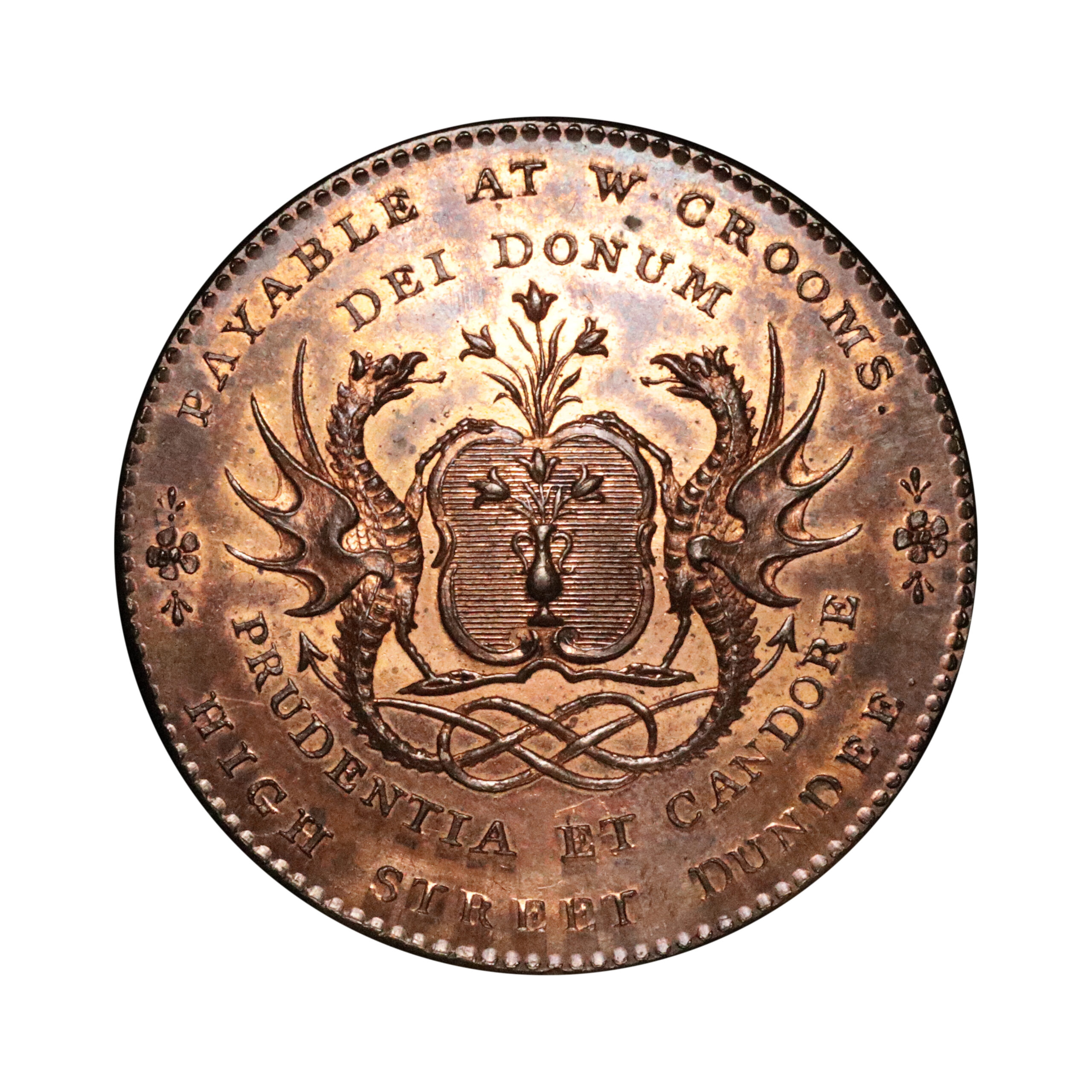 Dundee, William Croom; D&H 14, Kempson’s copper halfpenny, 10.14g. Trivial spot above the N of DONUM in the obverse field otherwise substantial amount of original colour with brilliant reflective fields. Comparable to the Michael Patterson specimen* sold in recent times. About mint state.