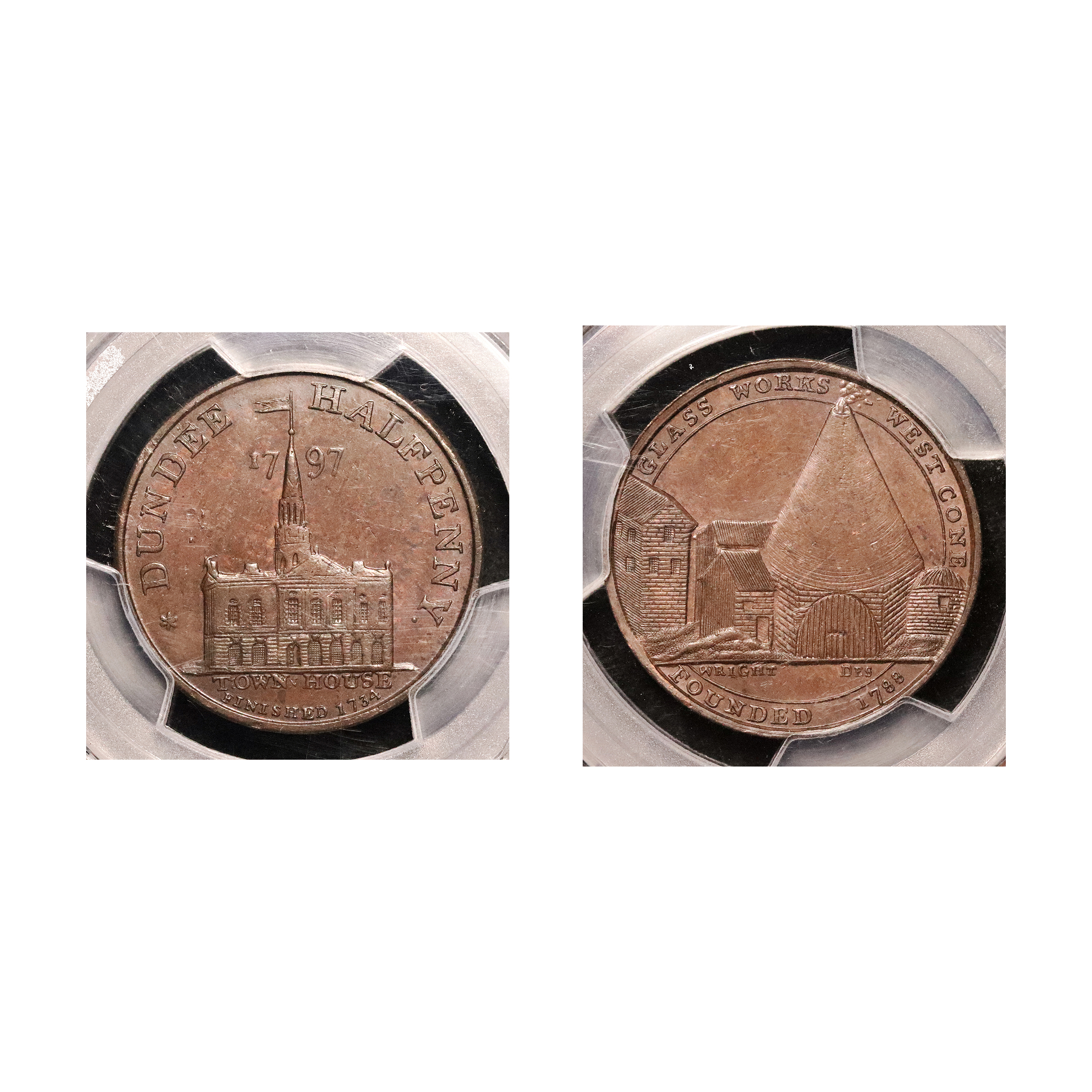 Dundee, John Pilmer; D&H 17, copper halfpenny. Struck from early die states, especially the reverse which develops a substantial cud in later issues. Sharp details with attractive light brown appearance. Currently housed in an MS 63 BN holder. Extremely fine.