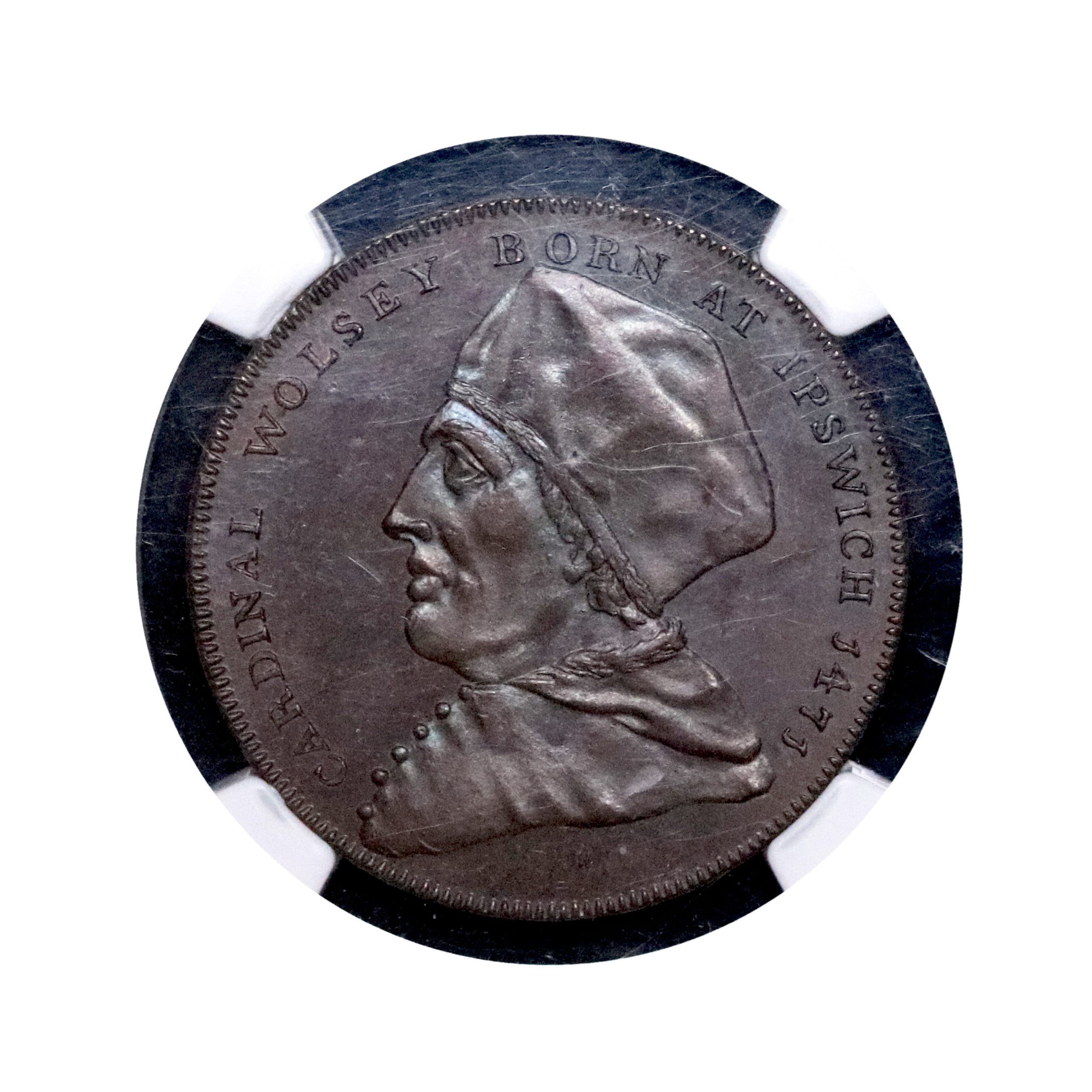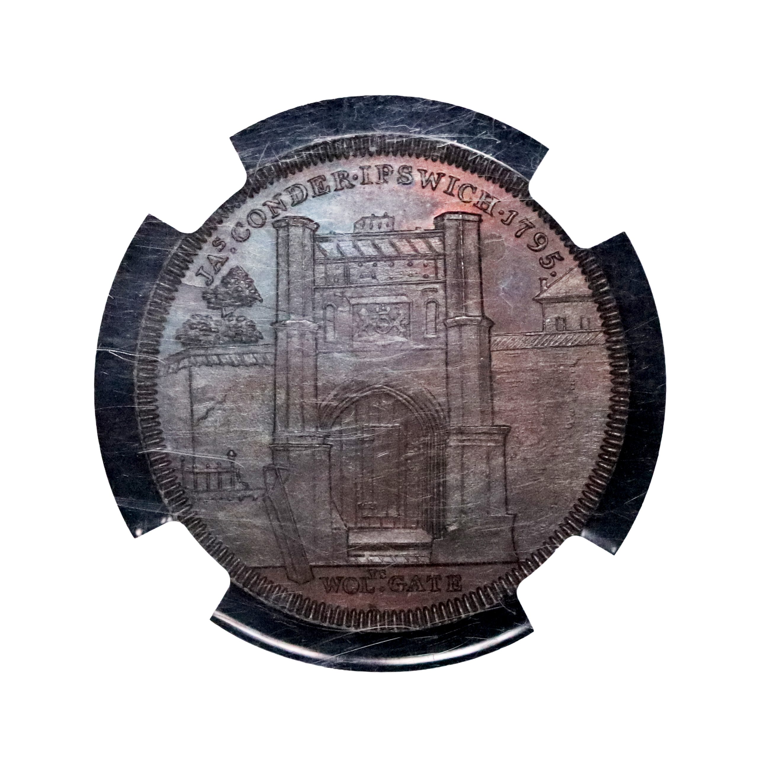 Suffolk, Ipswich, James Conder; D&H 10, penny struck in copper. Photo obscured by the scratches on the holder. Sharp, bronzed with some splashes of red to the reverse. Good extremely fine and currently housed in an NGC 65BN holder.