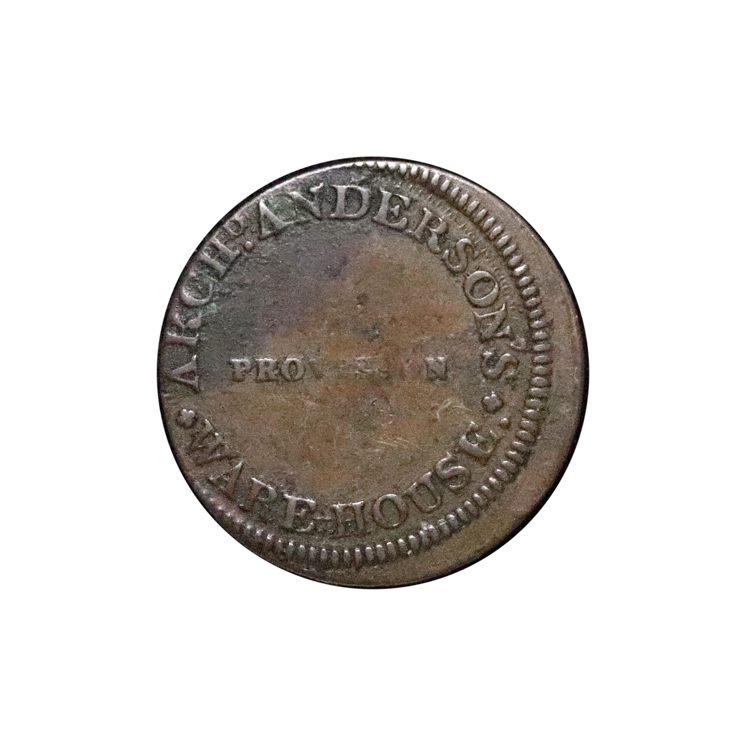 Glasgow, Archibald Anderson; D&H 13, farthing struck in copper, 2.29g. Obverse struck a little off-centre, detritus patches on both sides otherwise bold legends, scarce. Fine or better.