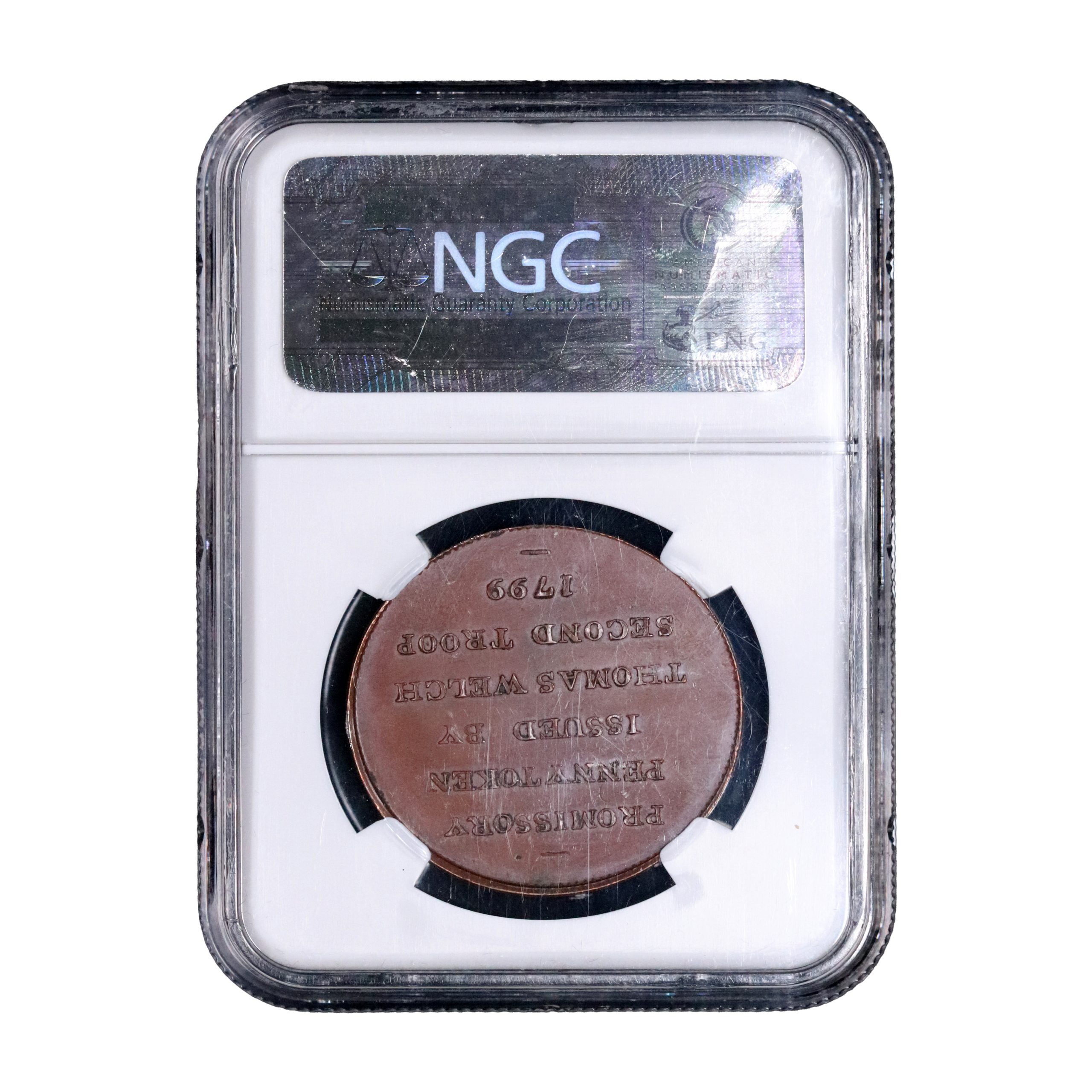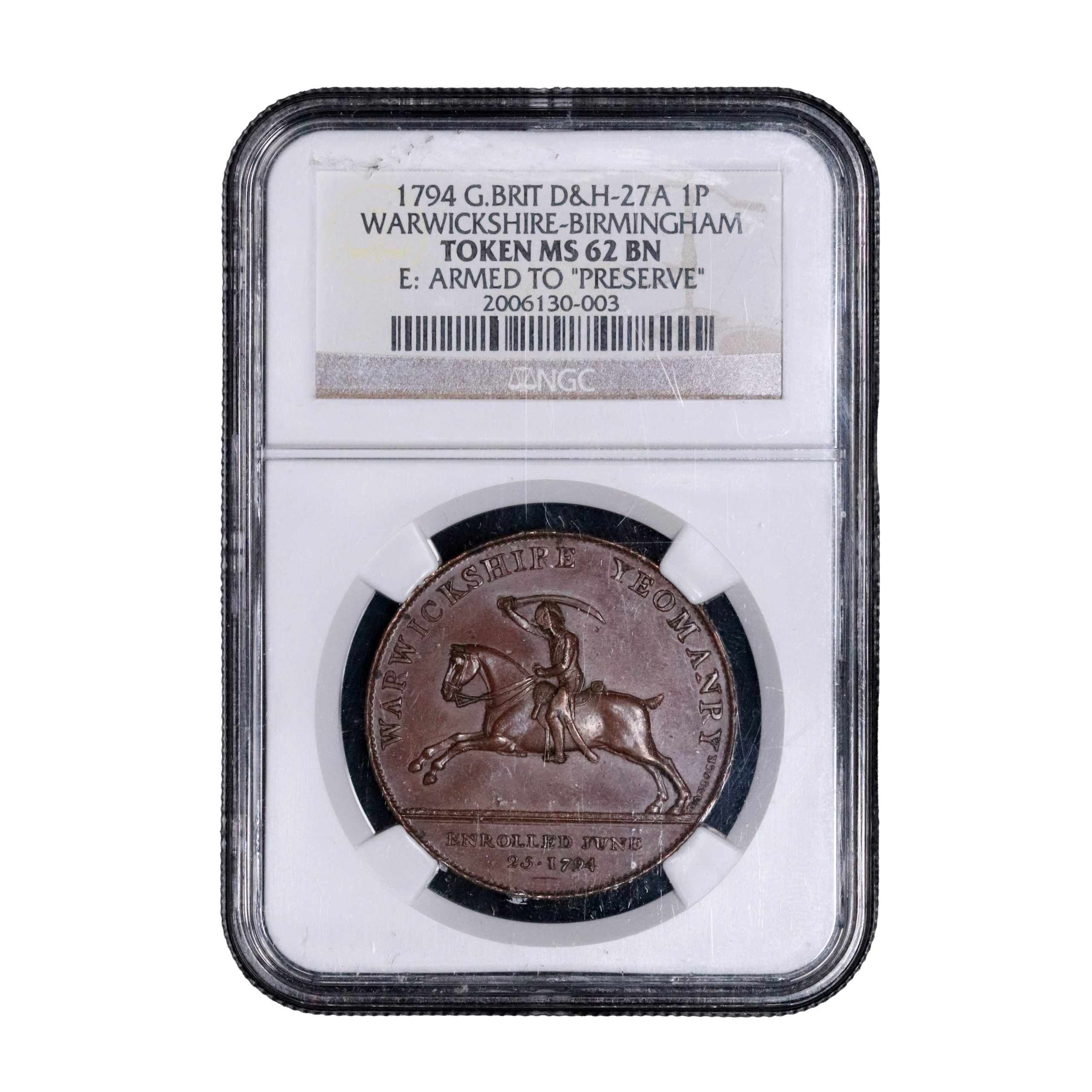 Warwickshire, Birmingham, Thomas Welch; D&H 27a, penny struck in copper. Classic variety, struck on a thick planchet, required in order to fit the ornate edge device – ARMED TO PRESERVE OUR LIVES PROPERTY AND CONSTITUTION AGAINST FOREIGN AND DOMESTIC ENEMIES. Some light rub to the high points and small spotting otherwise, about extremely fine and currently housed in an NGC 62BN holder. Very rare.