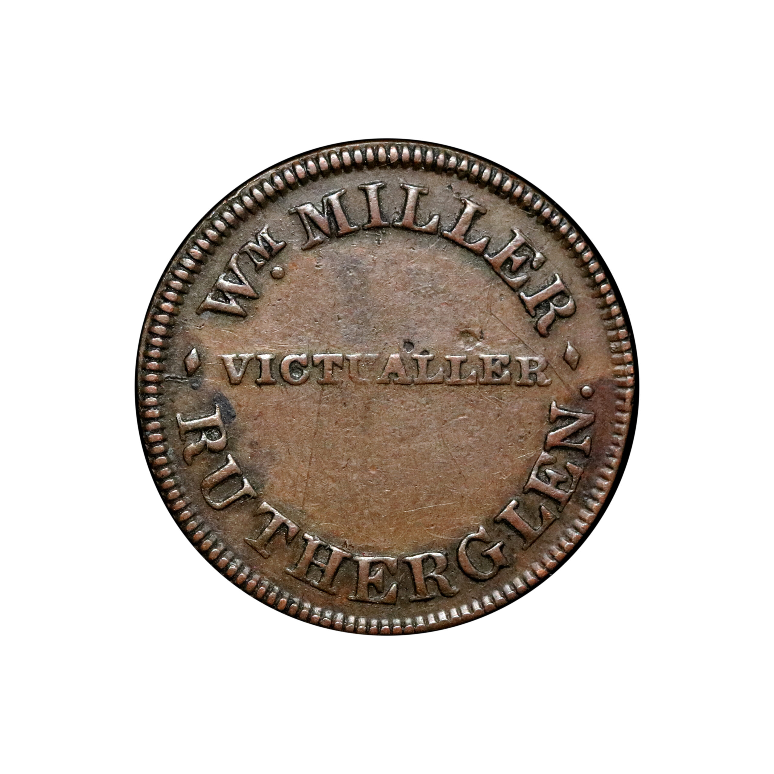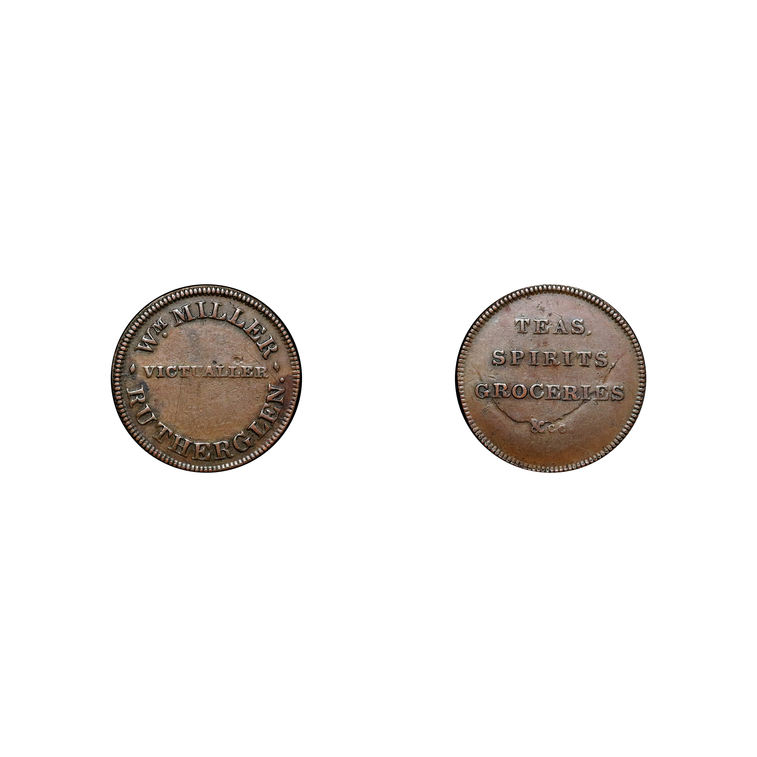 Rutherglen, William Miller; D&H 52, farthing struck in copper, 2.44g. Legends bold, even brown with reverse die break, very rare. About very fine for issue.