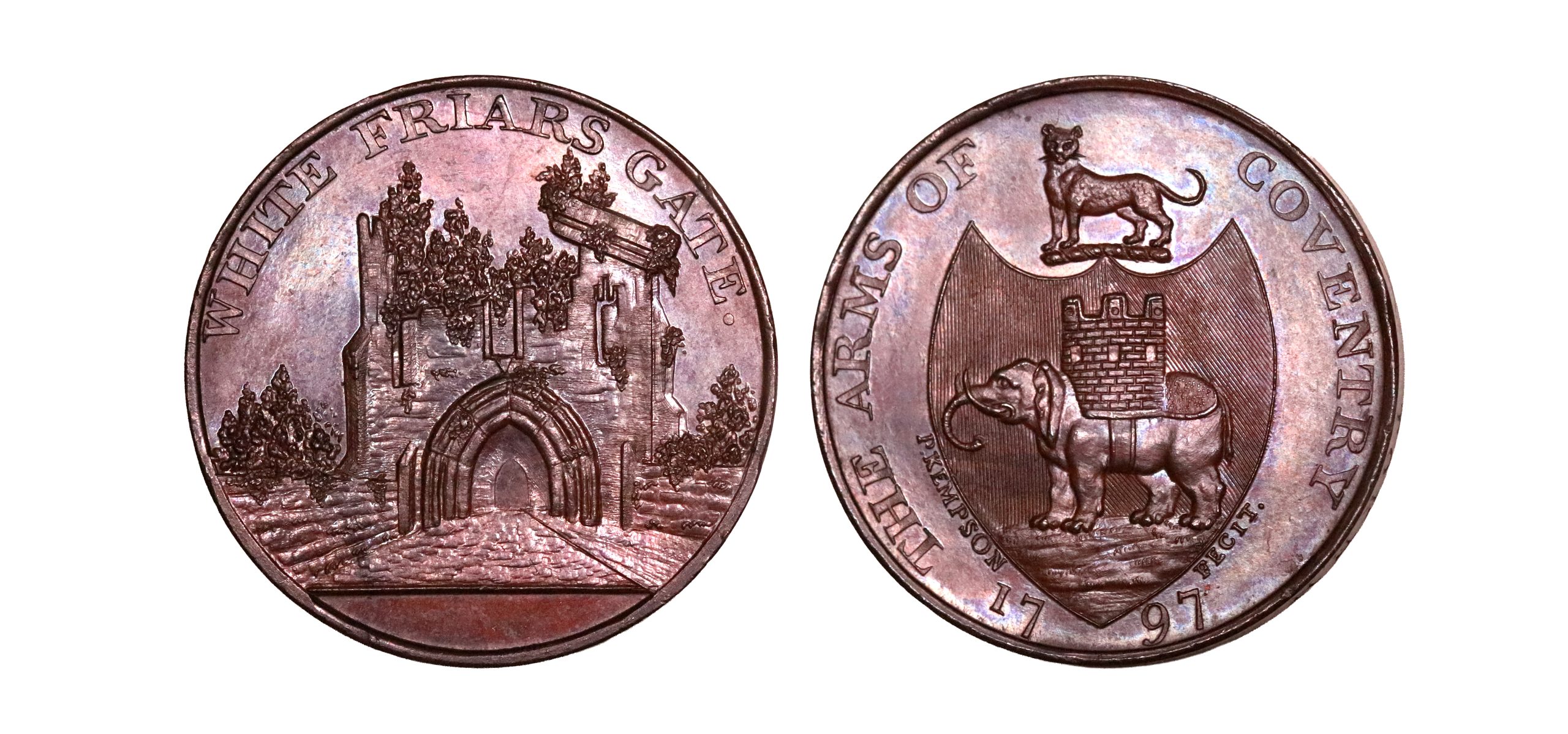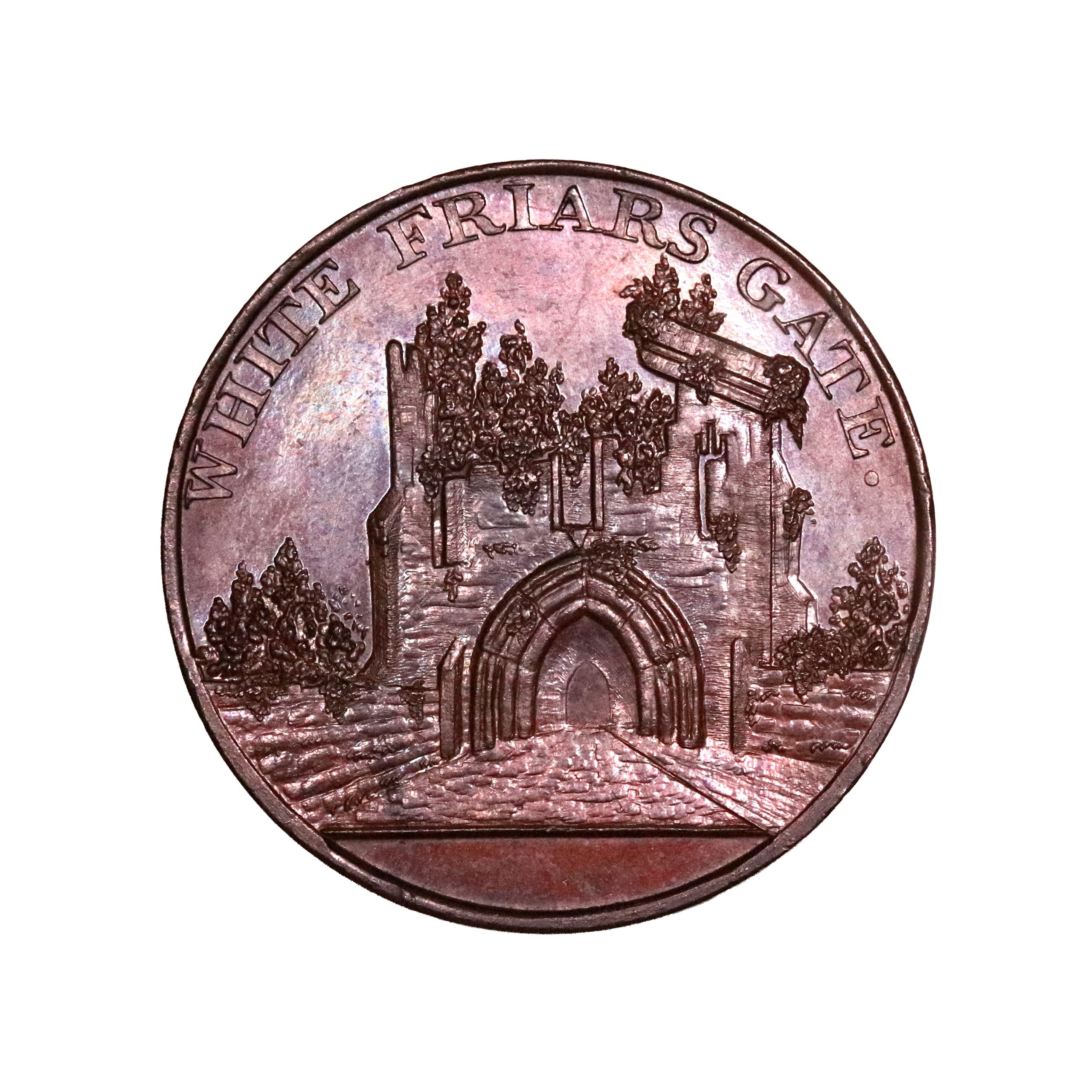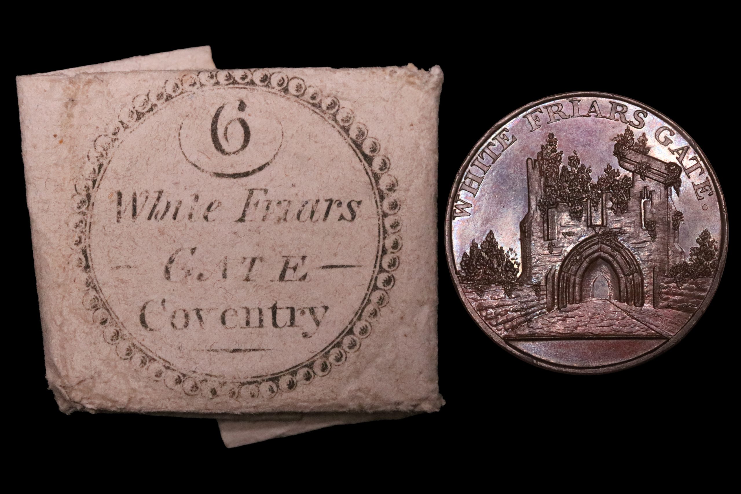 Warwickshire, Coventry Buildings Series, Peter Kempson; D&H 280, halfpenny struck in copper. Finally, number 6, White Friars Gate. More reflectivity, bronzed and extremely fine. Rare.