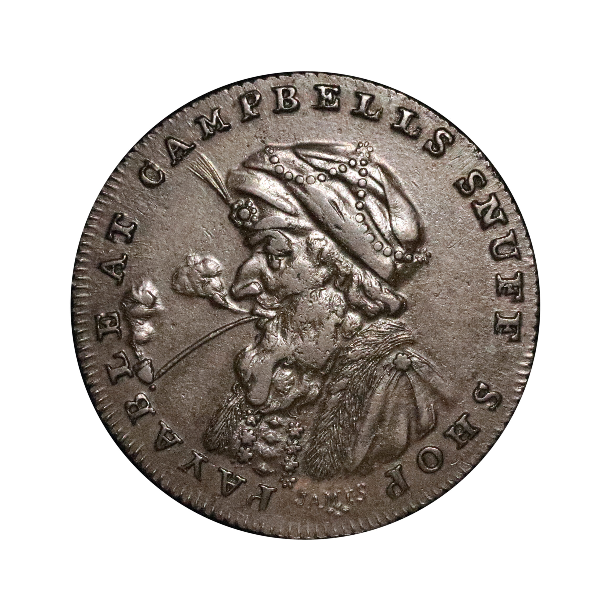 Edinburgh, Euphame Campbell; D&H 15, halfpenny struck in copper, 8.16g. Obverse die as previous but struck from advanced die state. Reverse with softly struck 37 as usual and about the same as the D&H plate. Some planchet flaws around the peripherals otherwise even chocolate brown surfaces, very rare. Very fine or better.