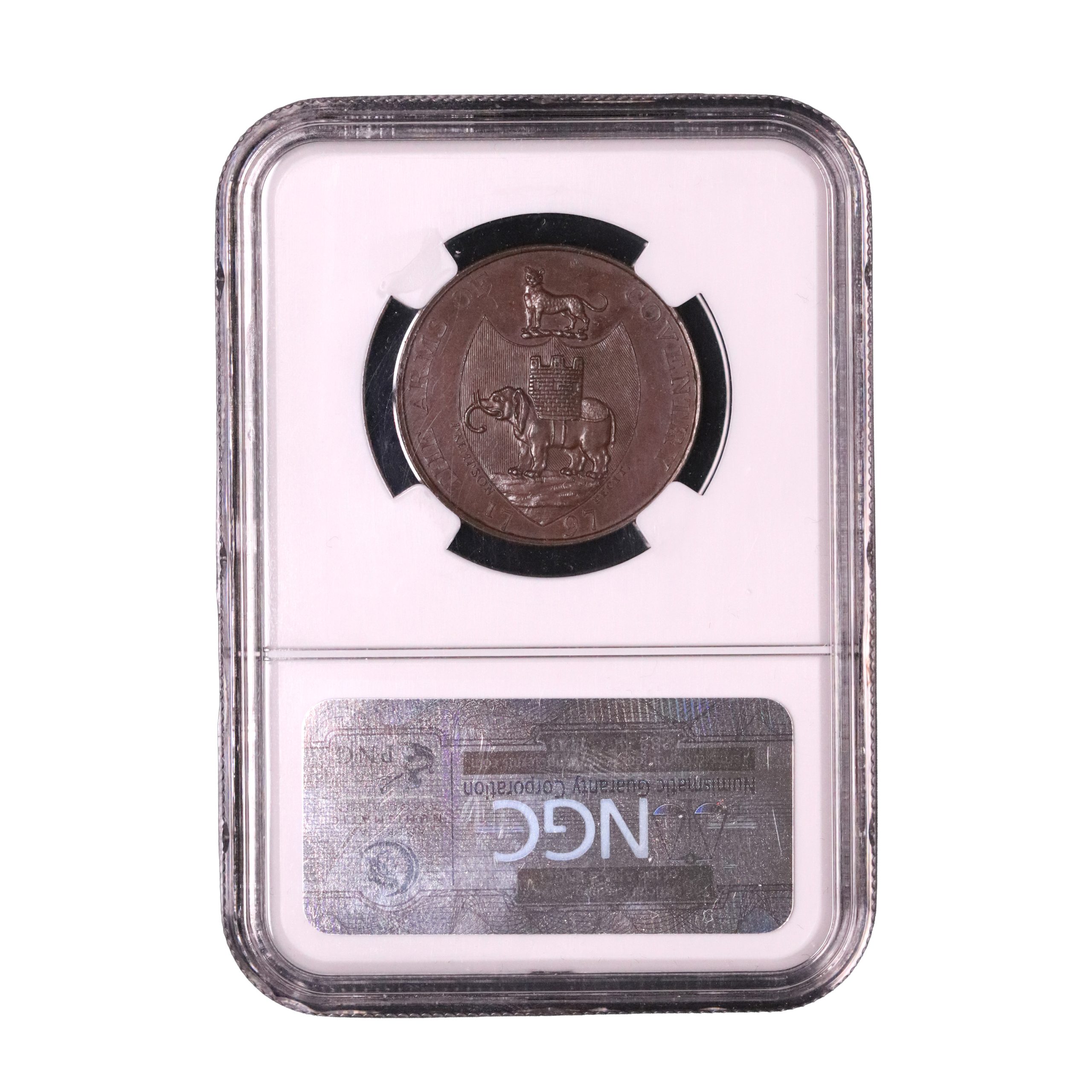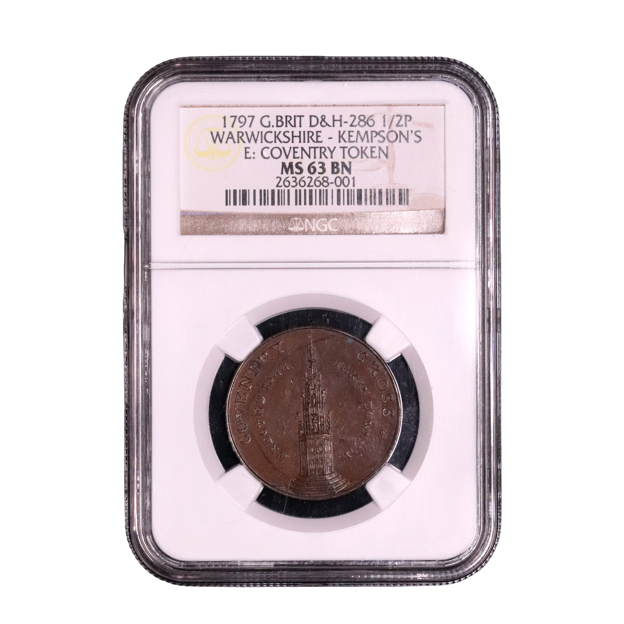Warwickshire, Coventry Buildings Series, Peter Kempson; D&H 286, halfpenny struck in bronzed-copper. A brief interruption with a bronzed Coventry Cross. Some light spotting with minor handling in the fields. Extremely fine and currently housed in an NGC 63BN holder. Scarce.