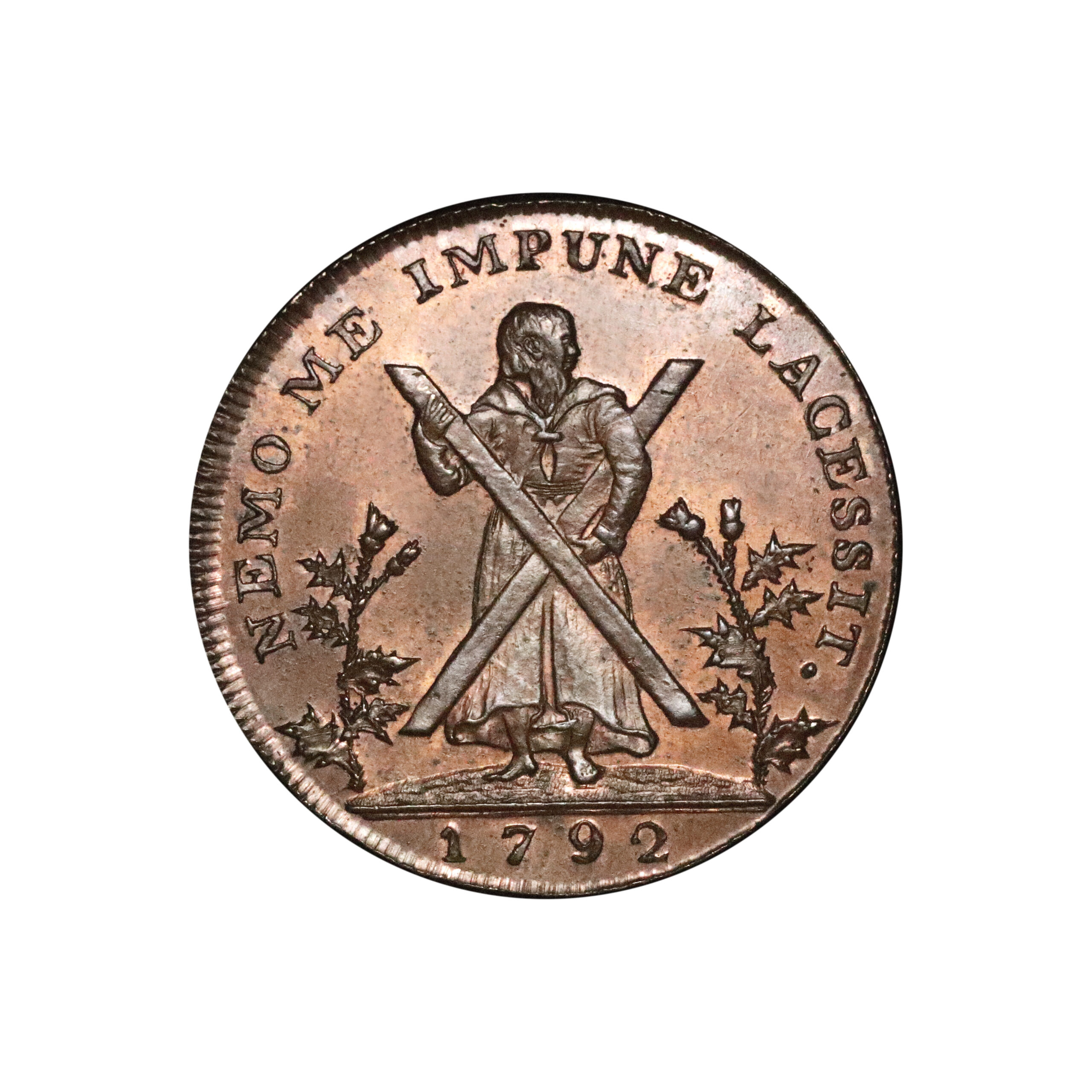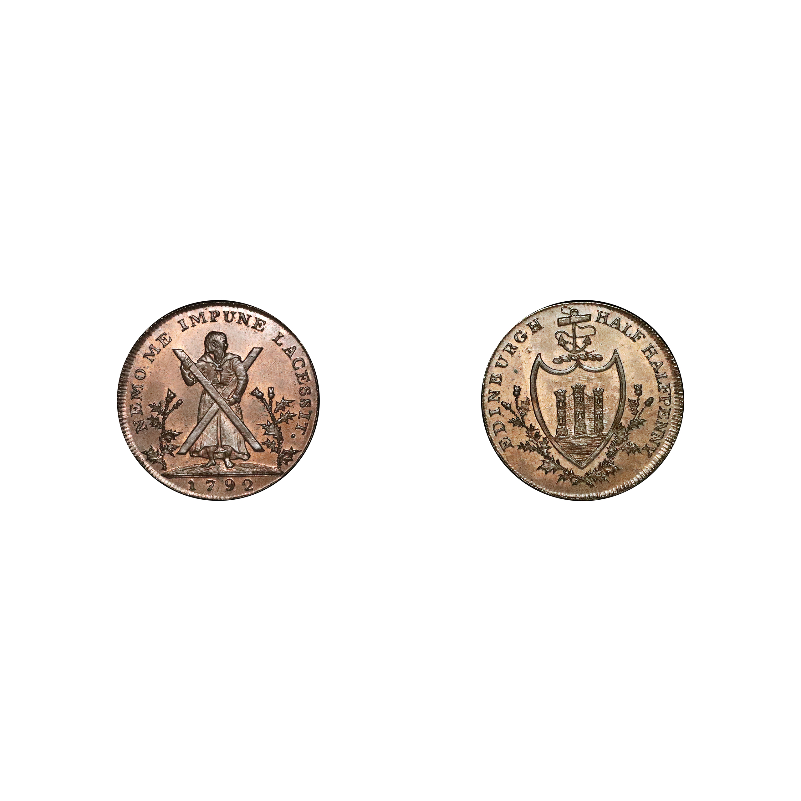 Edinburgh, John Westwood; D&H 64, Westwood’s half-halfpenny struck in copper. 5.59g. Struck slightly off-centre otherwise glossy fields with original colour, scarce. Extremely fine.