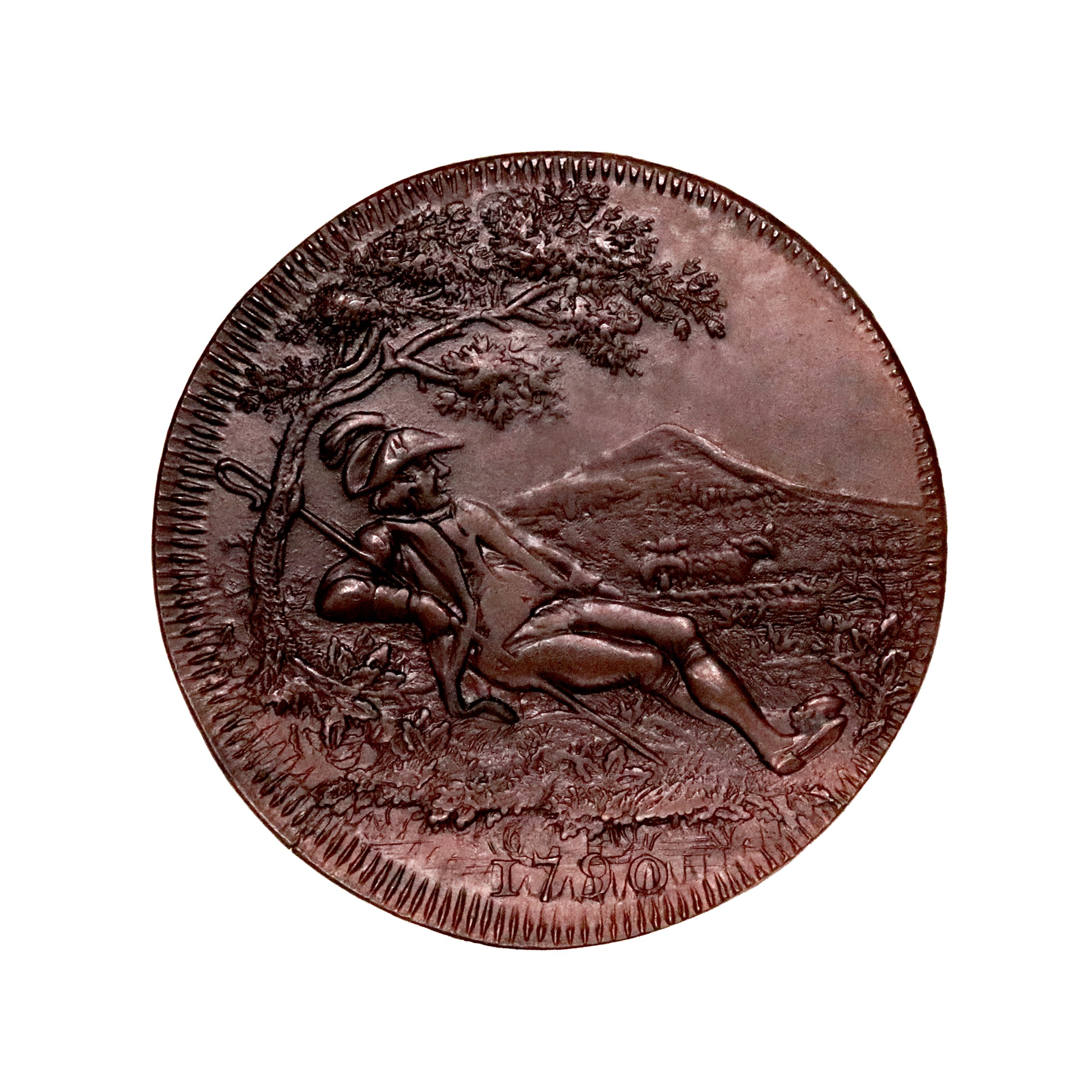 Worcestershire, Hagley, Thomas Spence; D&H 22a, halfpenny struck in copper. Another, this with Spence edge. A little more softly struck than previous with darker bronzed patina. Extremely fine or better. Rare.