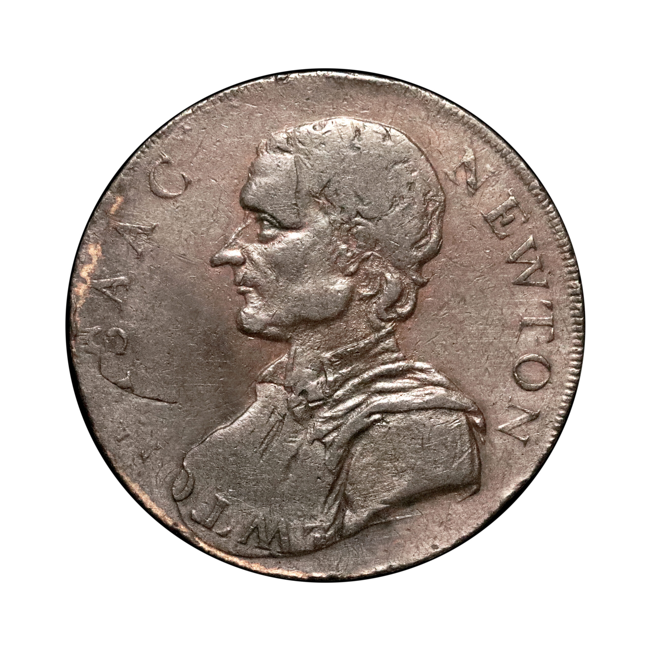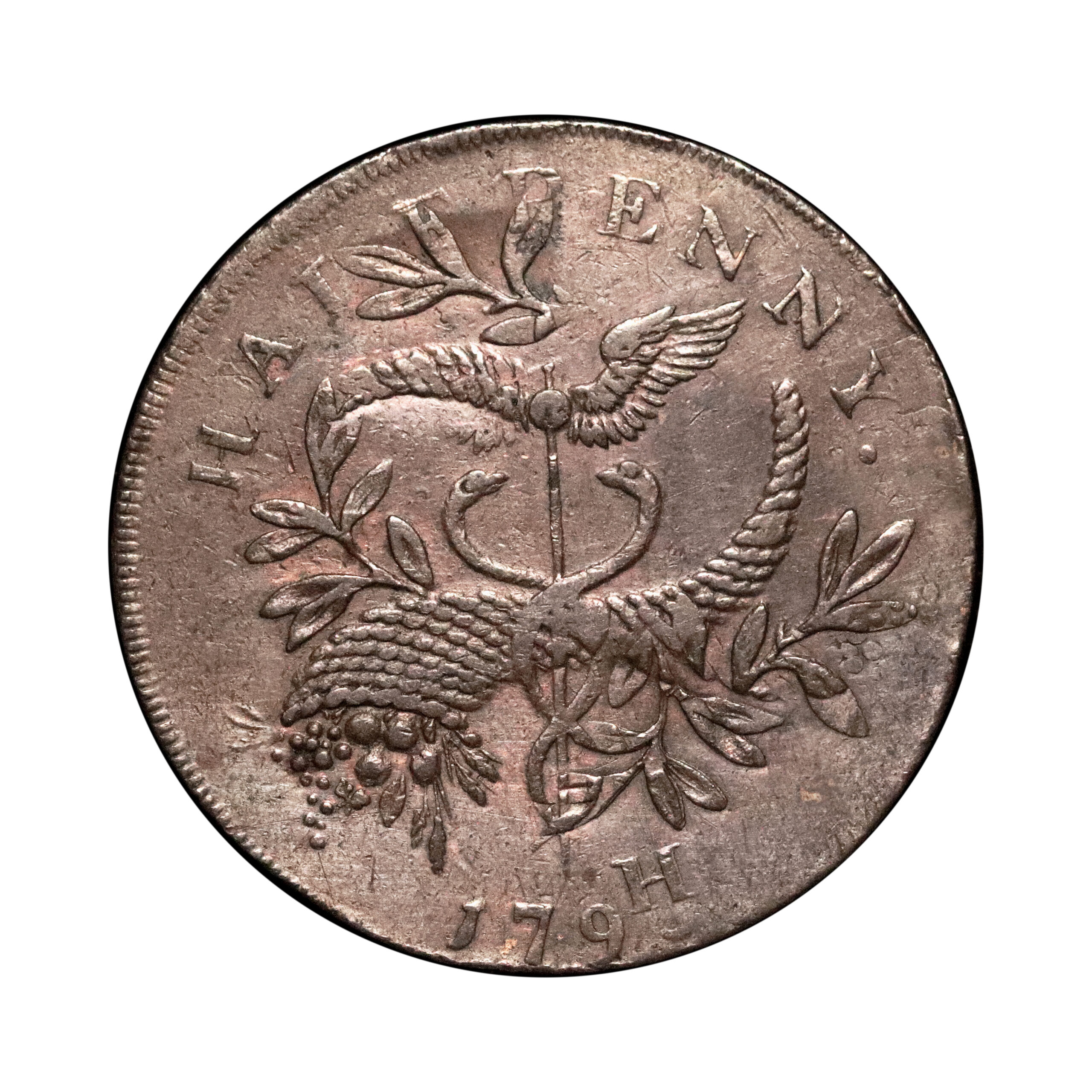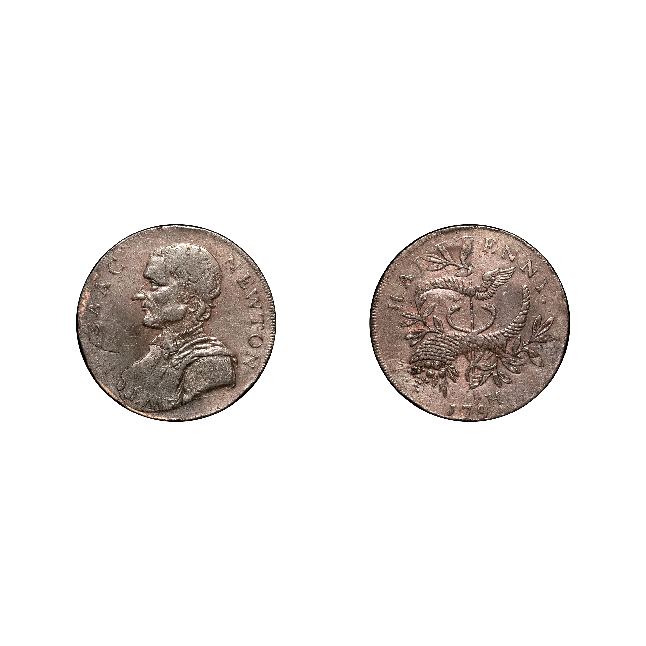 Middlesex, Political & Social Series; D&H 1035c copper halfpenny, 9.69g. Very cool rotated die with obverse showing WTO of NEWTON appearing again under the bust. The reverse is dated 179H with the olive branches and cornucopia tip running wild. Fair to fine.