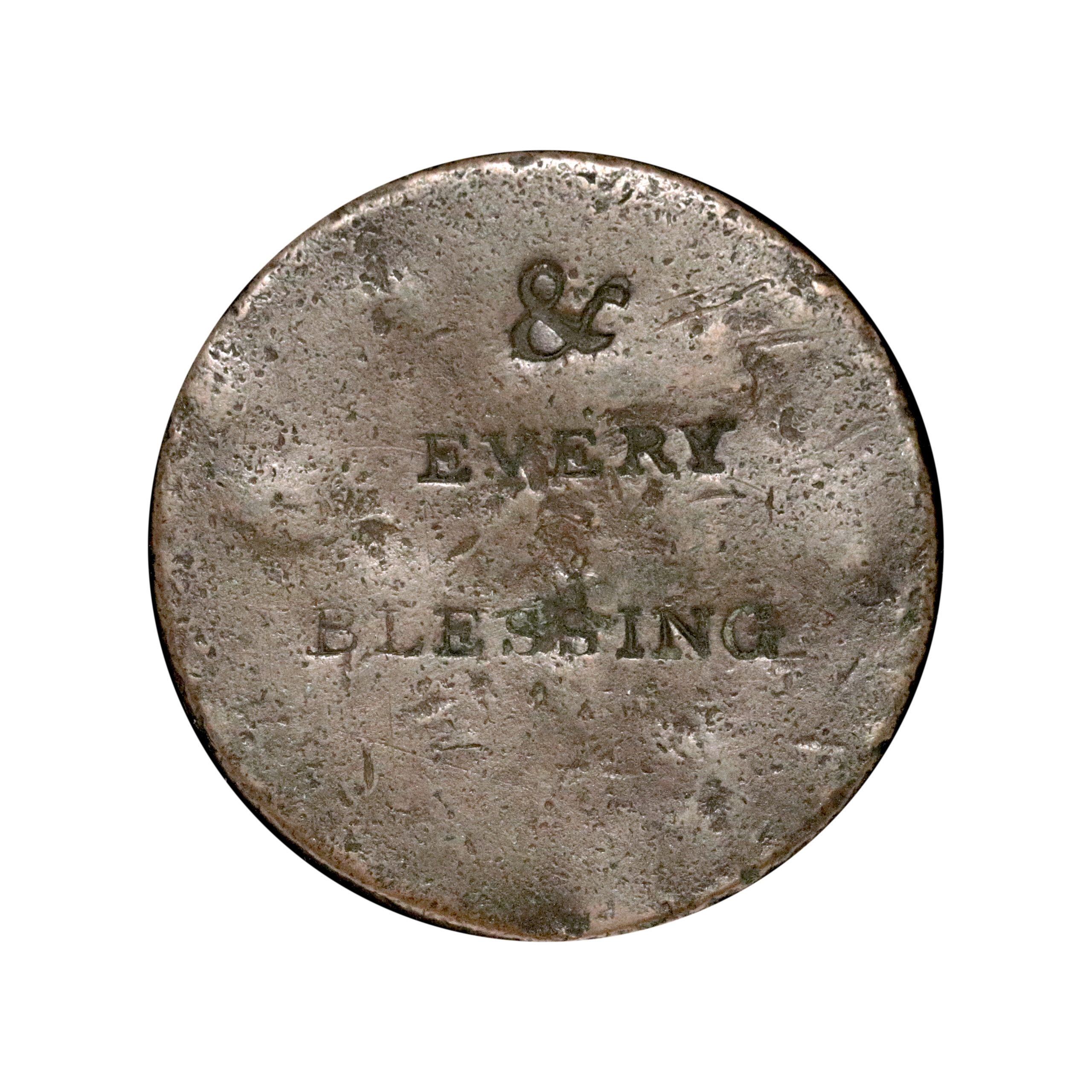 London, Thomas Spence; countermark struck on a blank halfpenny planchet, 6.45g. SPENCE’S PLAN SPENCE’S YOU FOOLS & EVERY BLESSING. Battered planchet, countermark about fine.