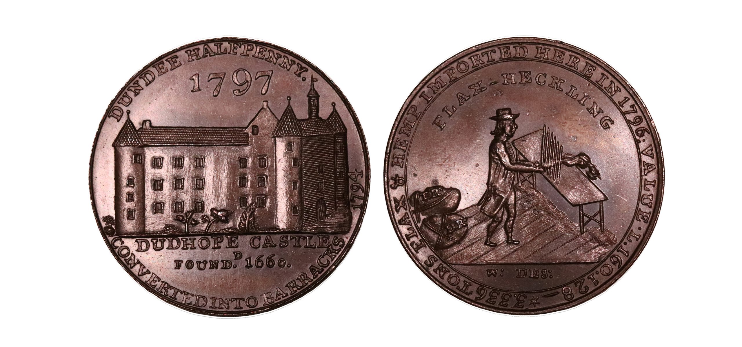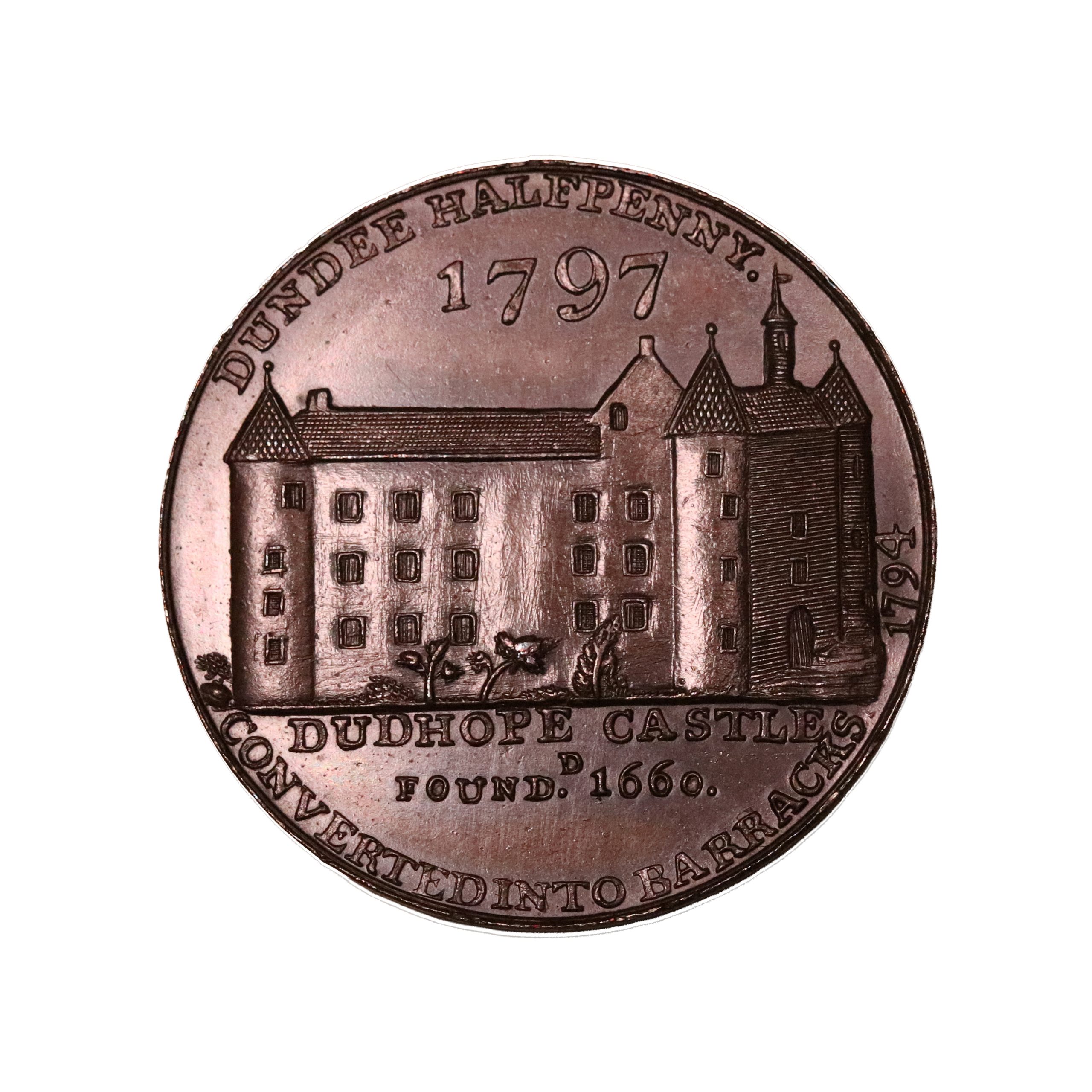 Angusshire, Dundee, James Wright Jnr; D&H 18, Matthew Boulton’s bronzed proof halfpennyA superb example, trifling marks that do not distract. Very sharp and choice, with wonderful eye appeal. About as struck (Gem).