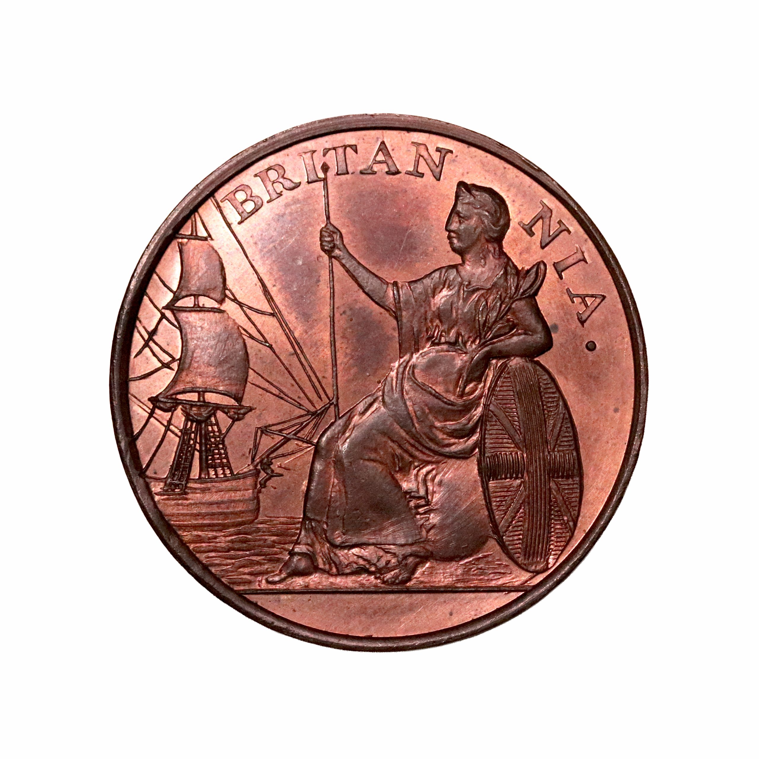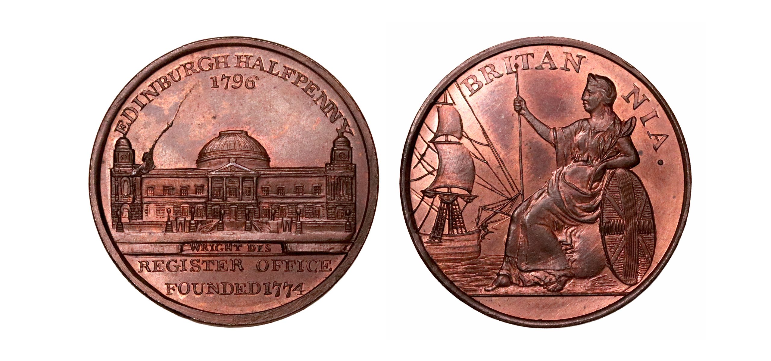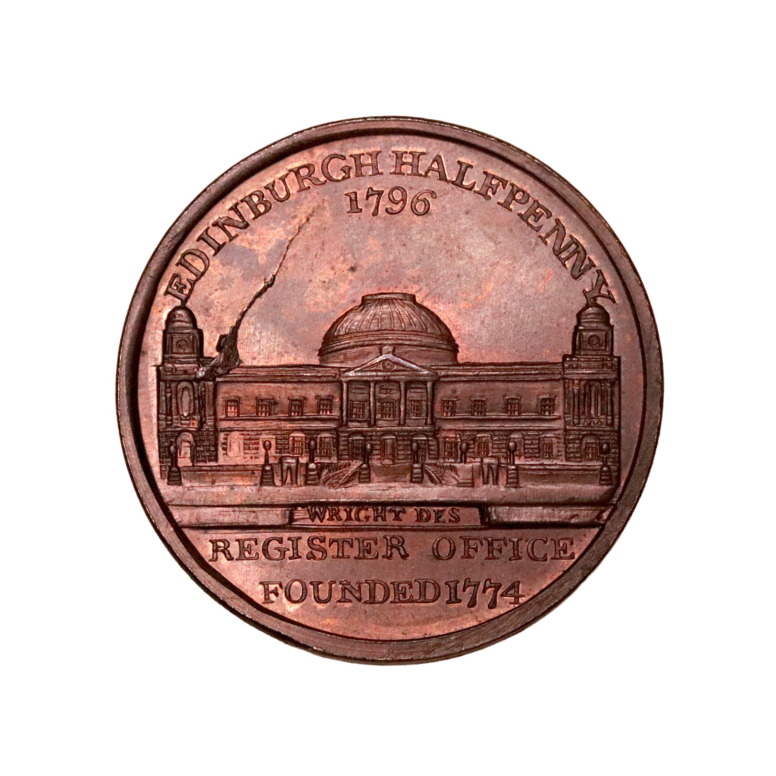Lothian, Edinburgh, James Wright Jnr; D&H 52, halfpenny struck in copper. Struck from a mid-state of the obverse die. Sharp with virtually full original colour faded red, good extremely fine or better. .