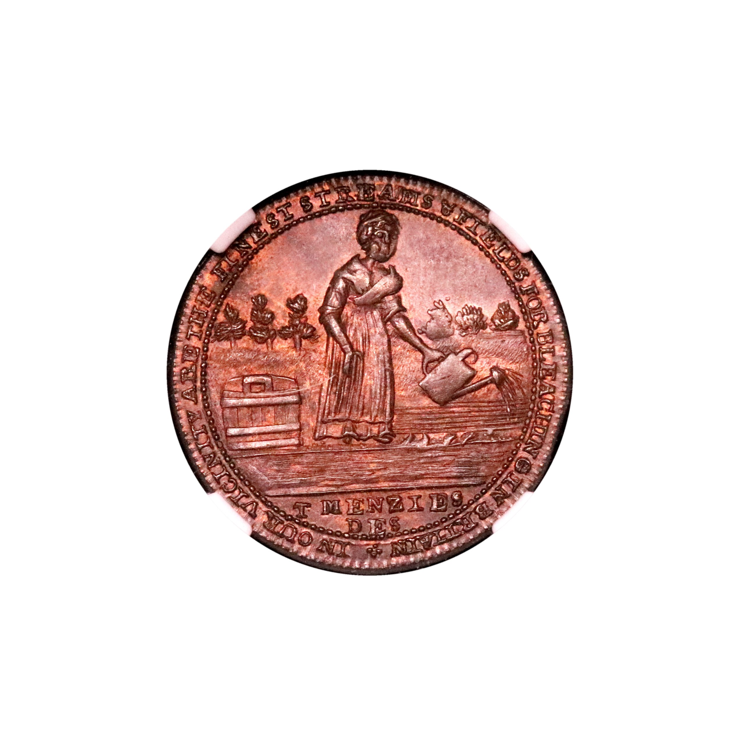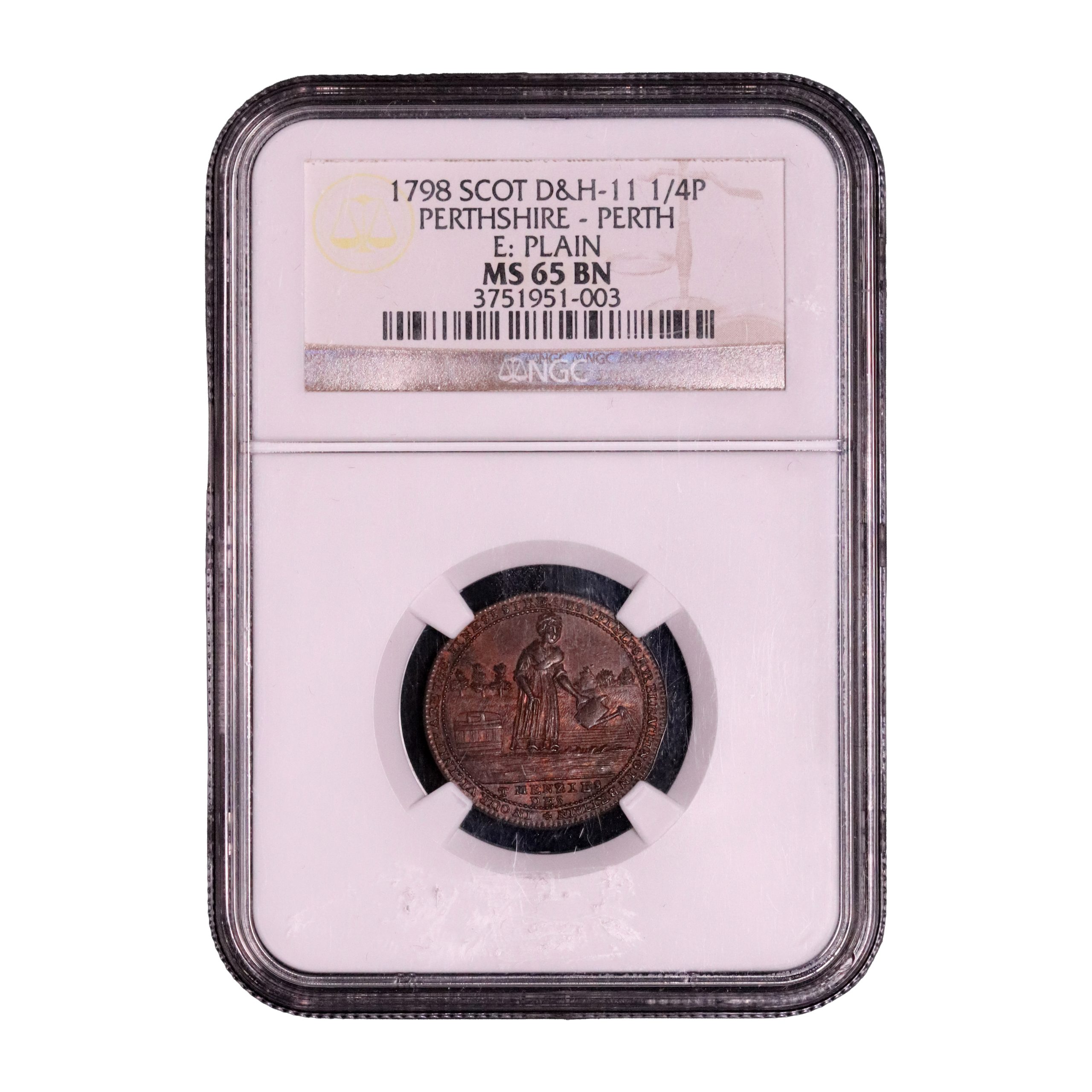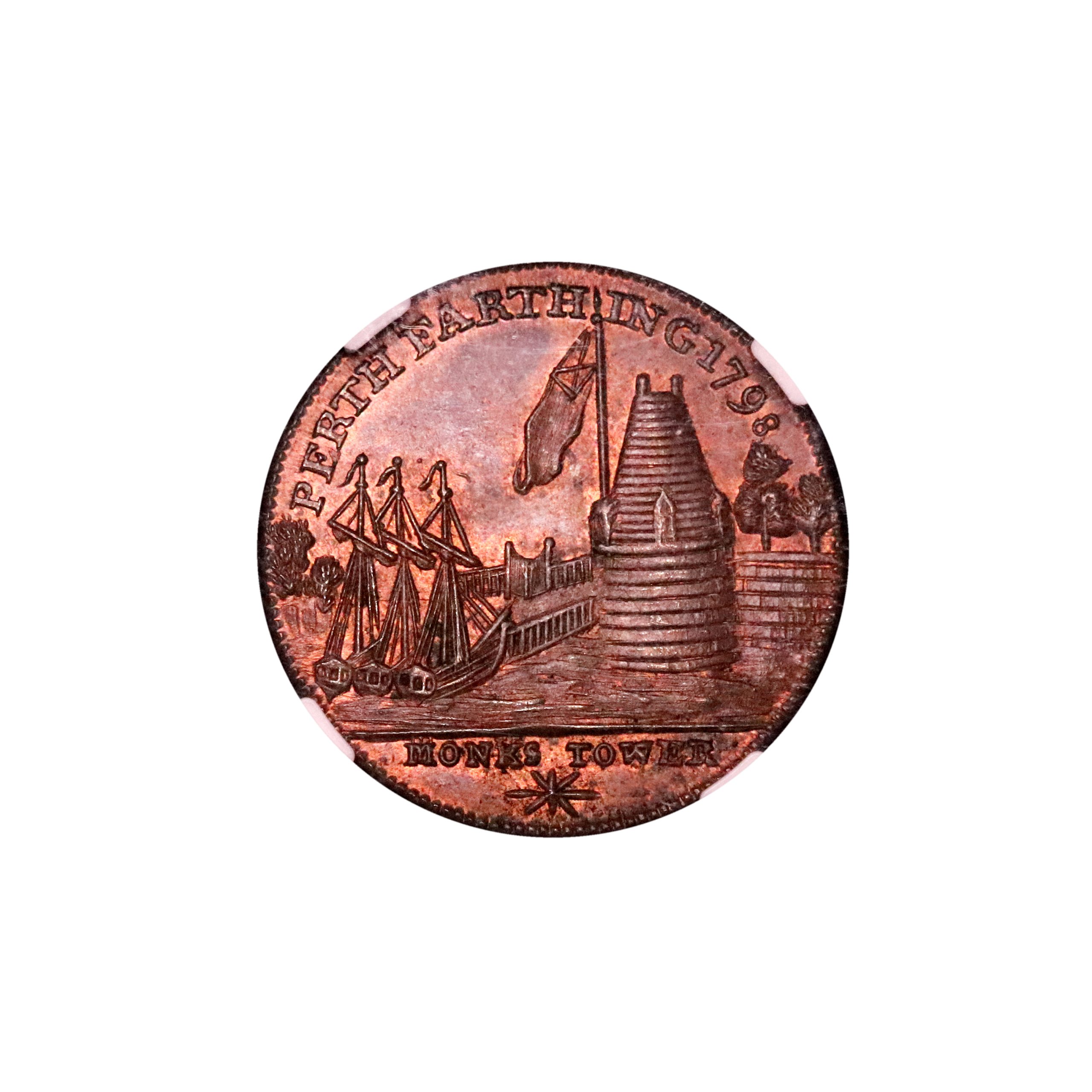 Perthshire, Perth, John Ferrier; D&H 11, farthing struck in copper. To conclude the sale, a lovely choice Perthshire farthing. A wonderful example of this intricately engraved variety with details all fully struck up, quite scarce as such. Red and brown surfaces, about as struck and currently housed in an NGC 65BN holder. Again, should be RB.