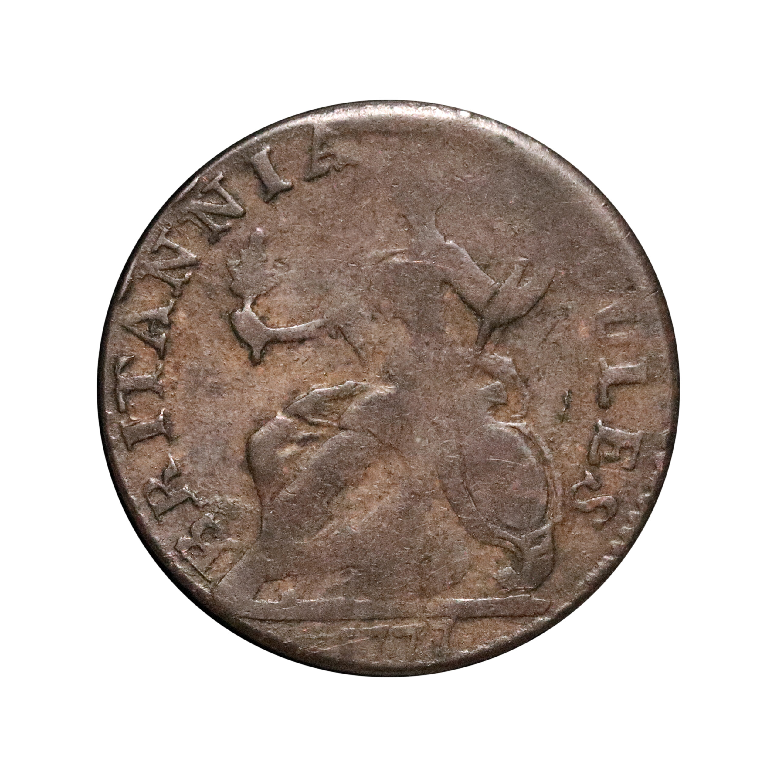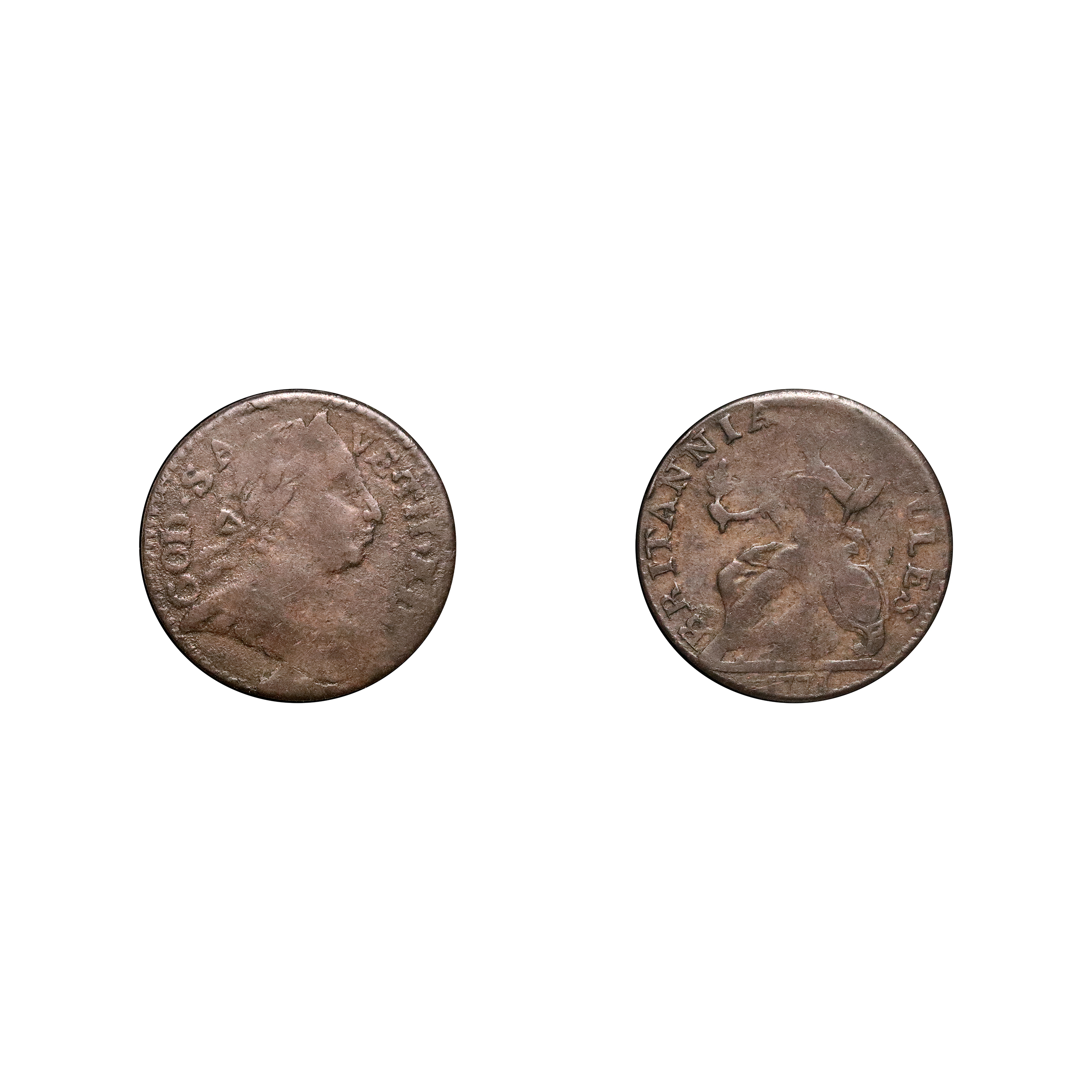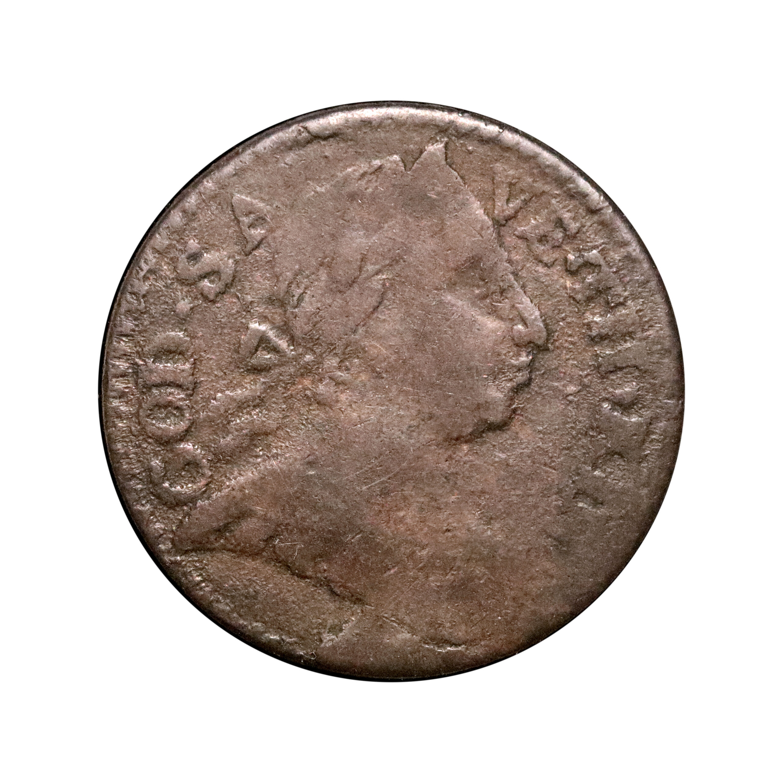 God Save The King, Evasion halfpenny, 6.72g; Cobwright G1005 / B0620. Cruder issue in advanced obverse die state. Reverse bolder. About fine for issue.